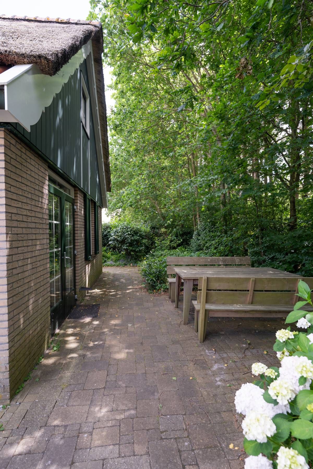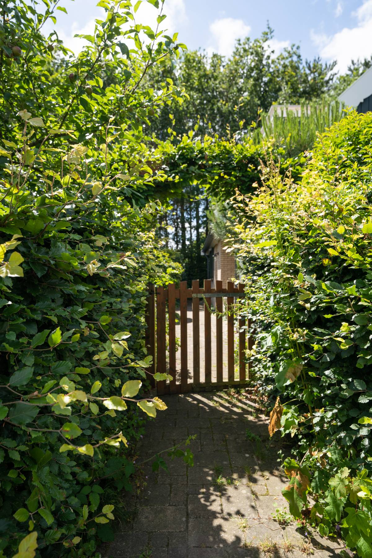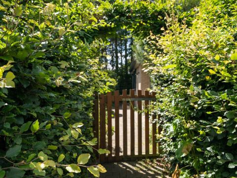 De tuin is mooi afgesloten met een groene haag en een tuinhek, dat is fijn met kleine kinderen en/of huisdieren.