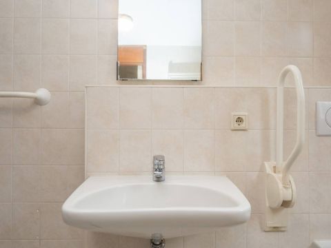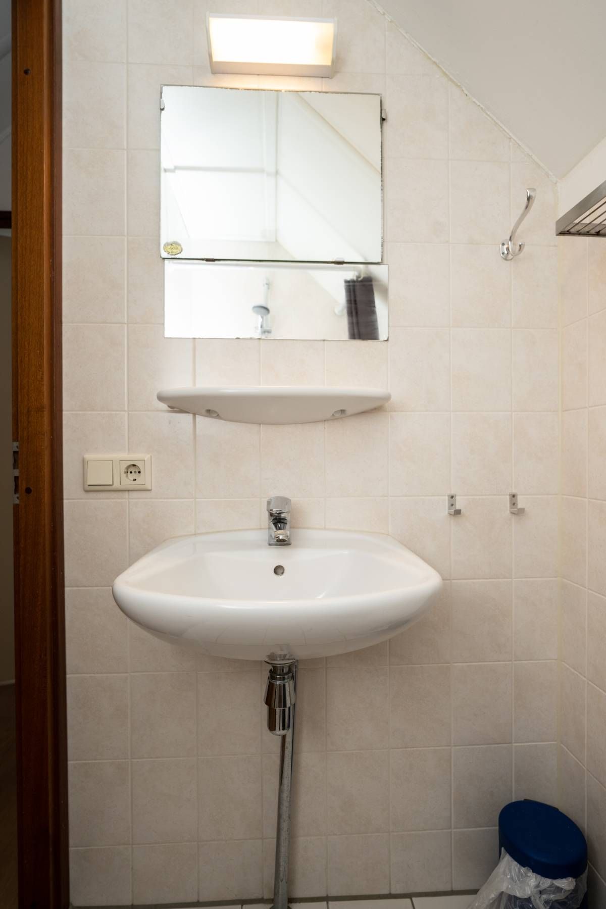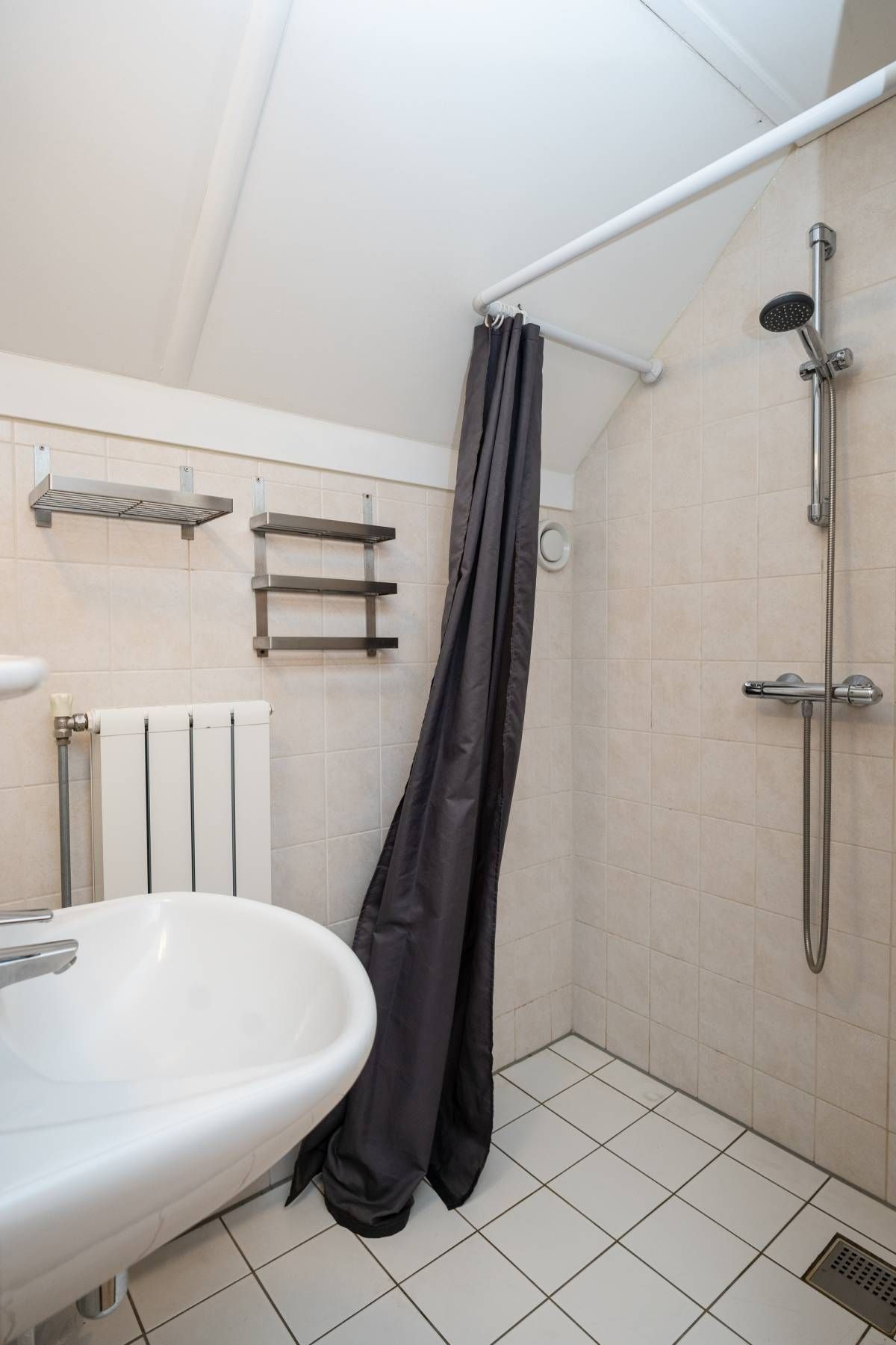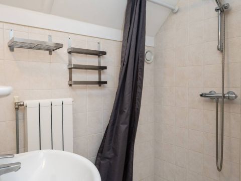 De badkamer op de verdieping beschikt over een inloopdouche en een wastafel.