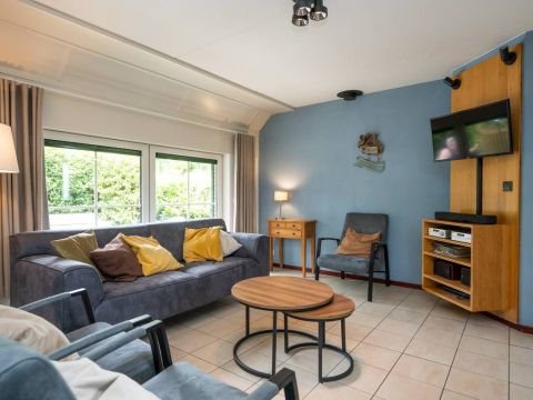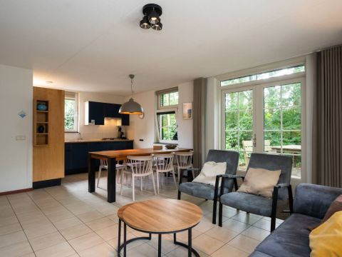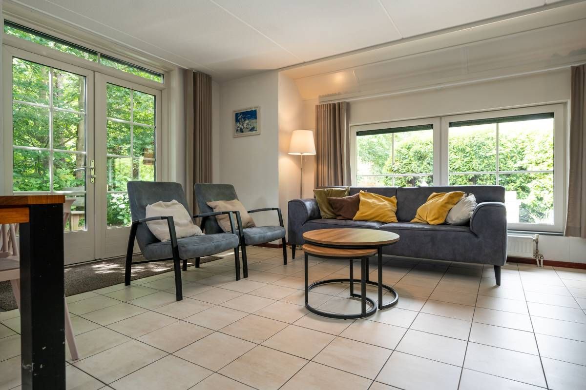 De sfeervolle woonkamer heeft een moderne inrichting met plavuizen op de vloer, veel licht en openslaande deuren naar terras en tuin.