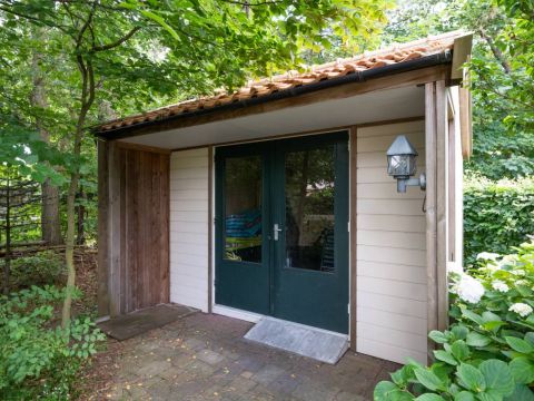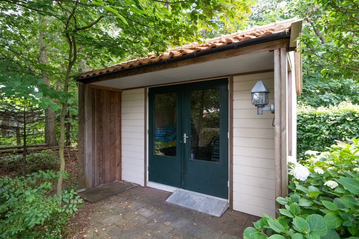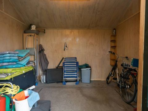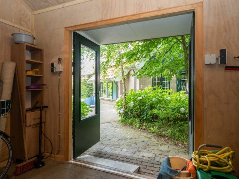In de tuin staat een houten tuinschuur voor de fietsen, tuinmeubi lair en/of gereedschap welke rolstoelvriendelijk is ingericht.