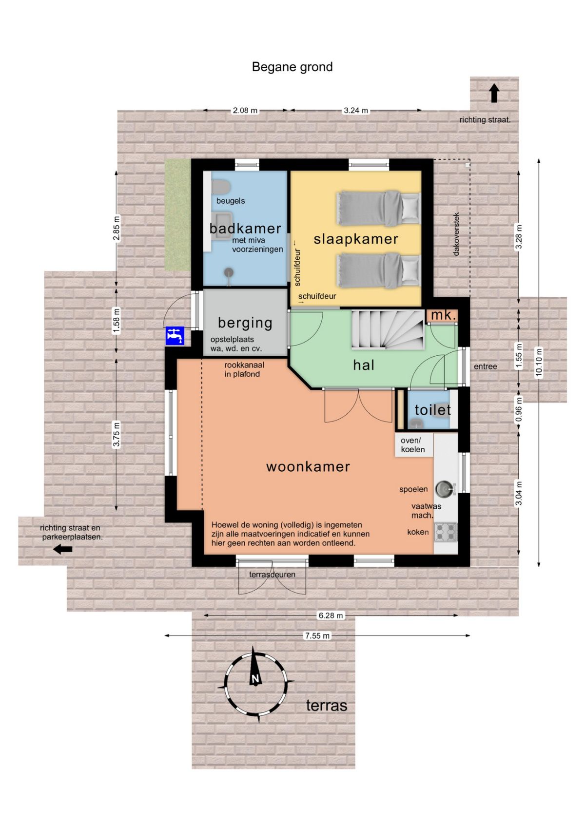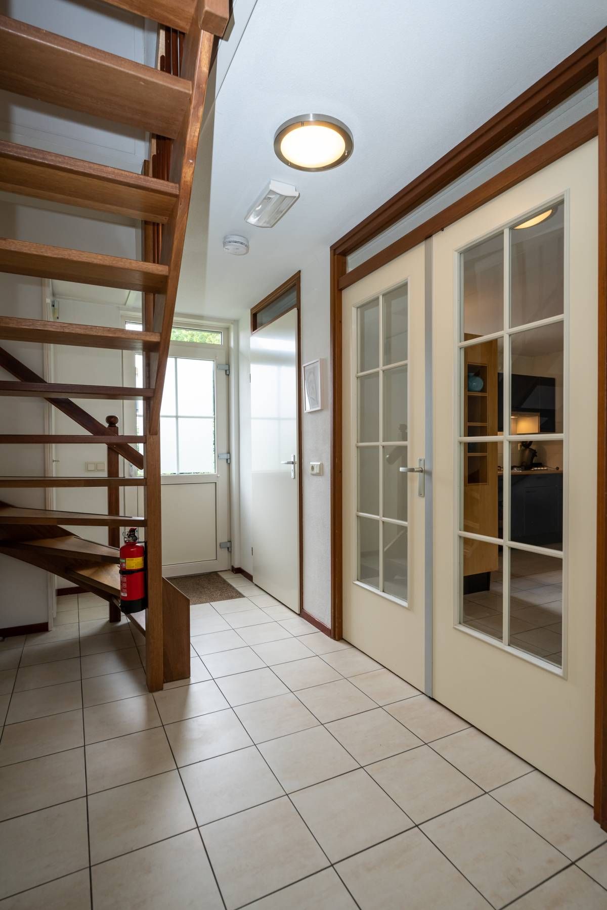 Indeling: Hal/entree met hardhouten trap, separaat toilet, meterkast en deur naar gezellige eetkeuken en woonkamer.