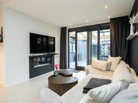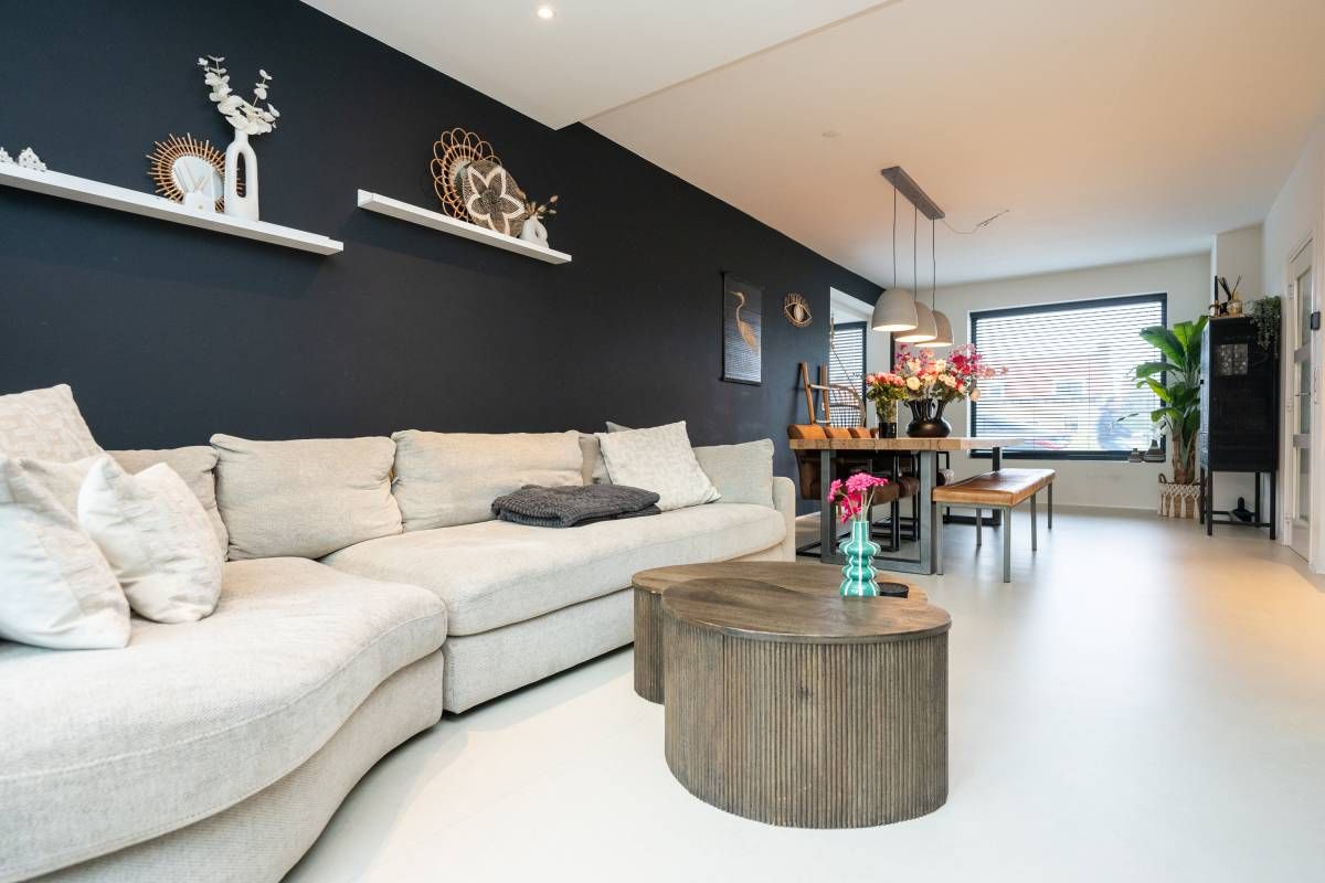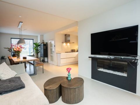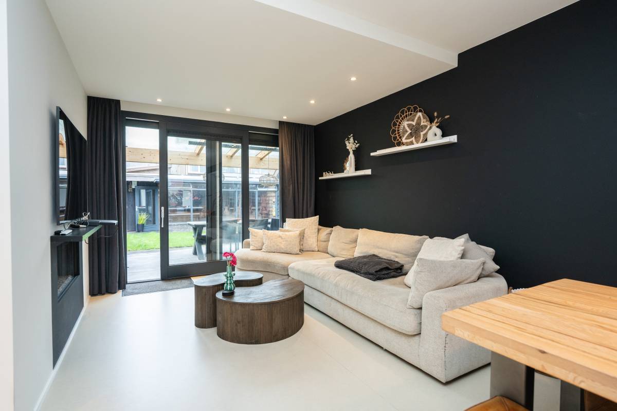 De woonkamer is voorzien van een strakke linoleumvloer, inbouwsfeerhaard en inbouwverlichting, wat zorgt voor een warme, moderne uitstraling. Een prachtig geheel!