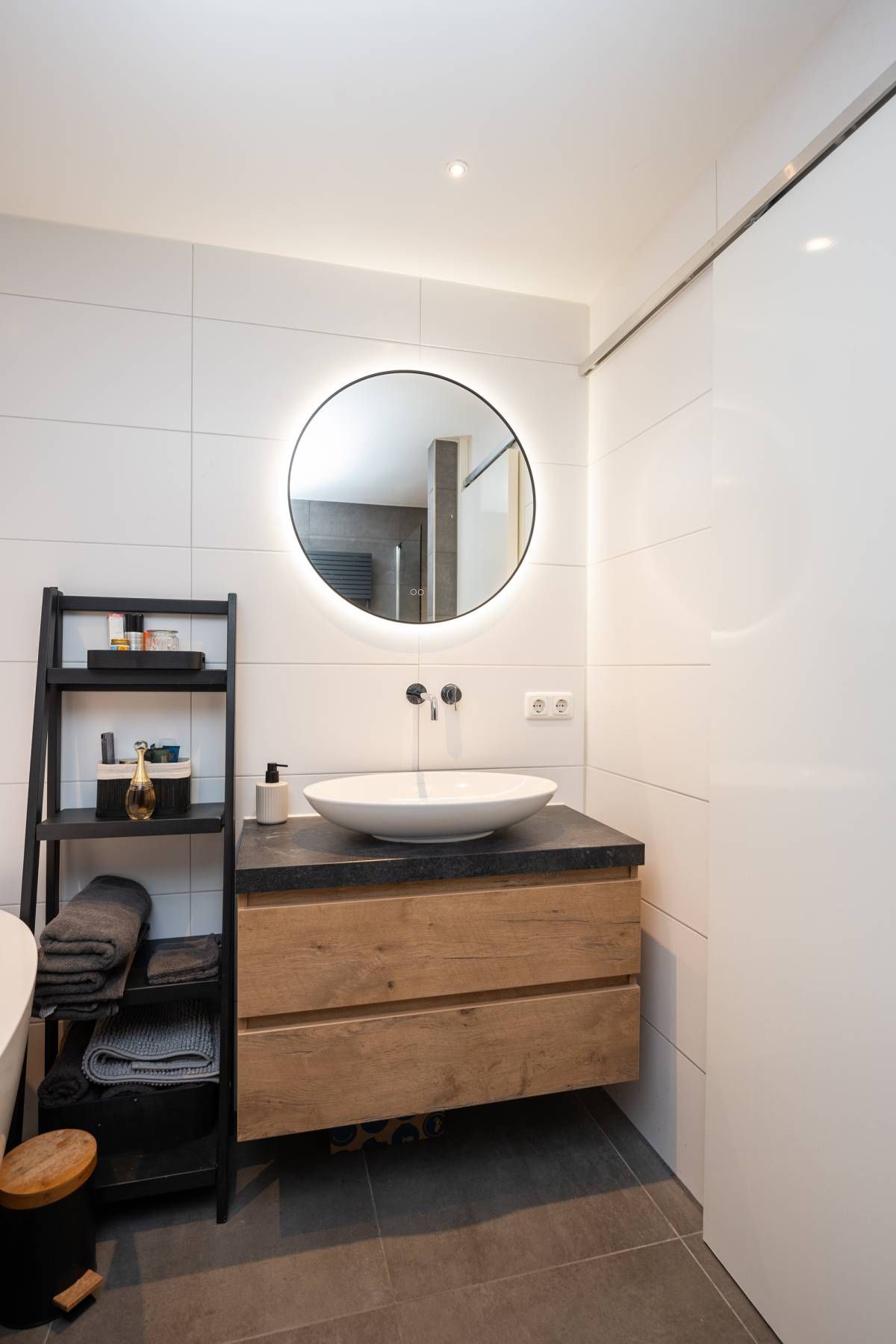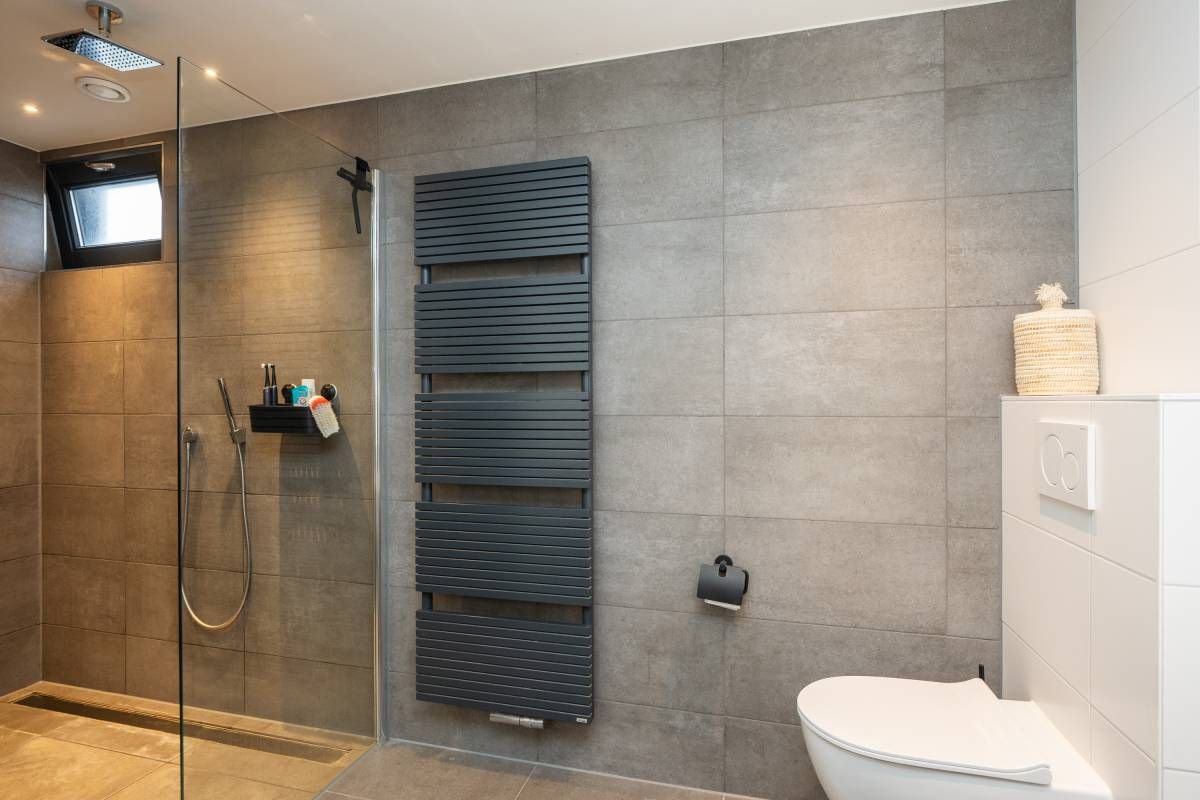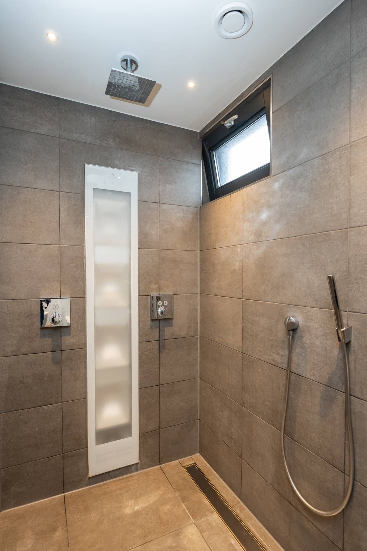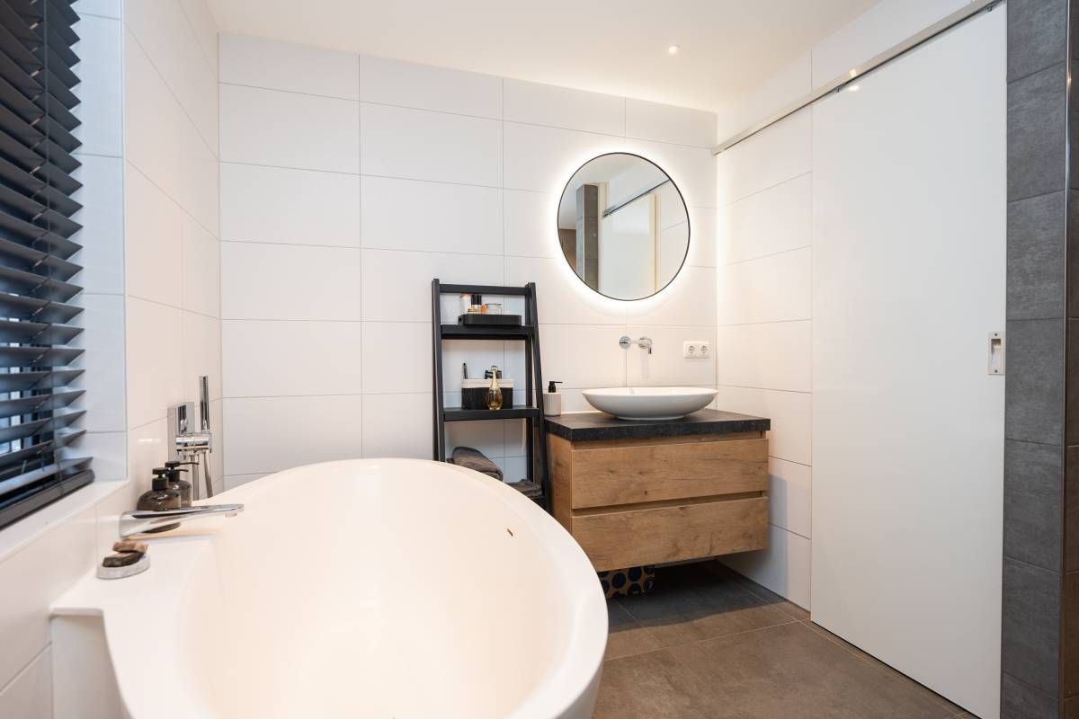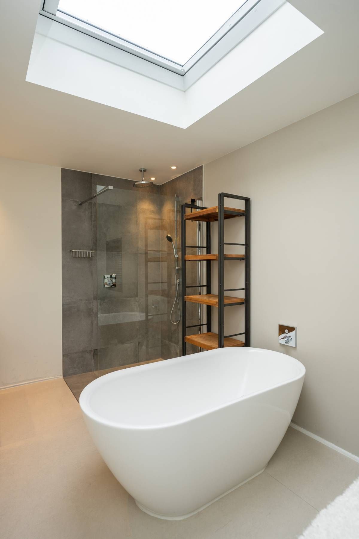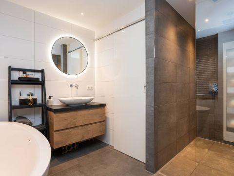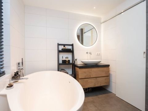 De badkamer is modern ingericht en voorzien van een fantastisch ligbad, een inloopdouche met sun shower, een dubbele stortdouche, vloerverwarming, designradiator en keurig wastafelmeubel.