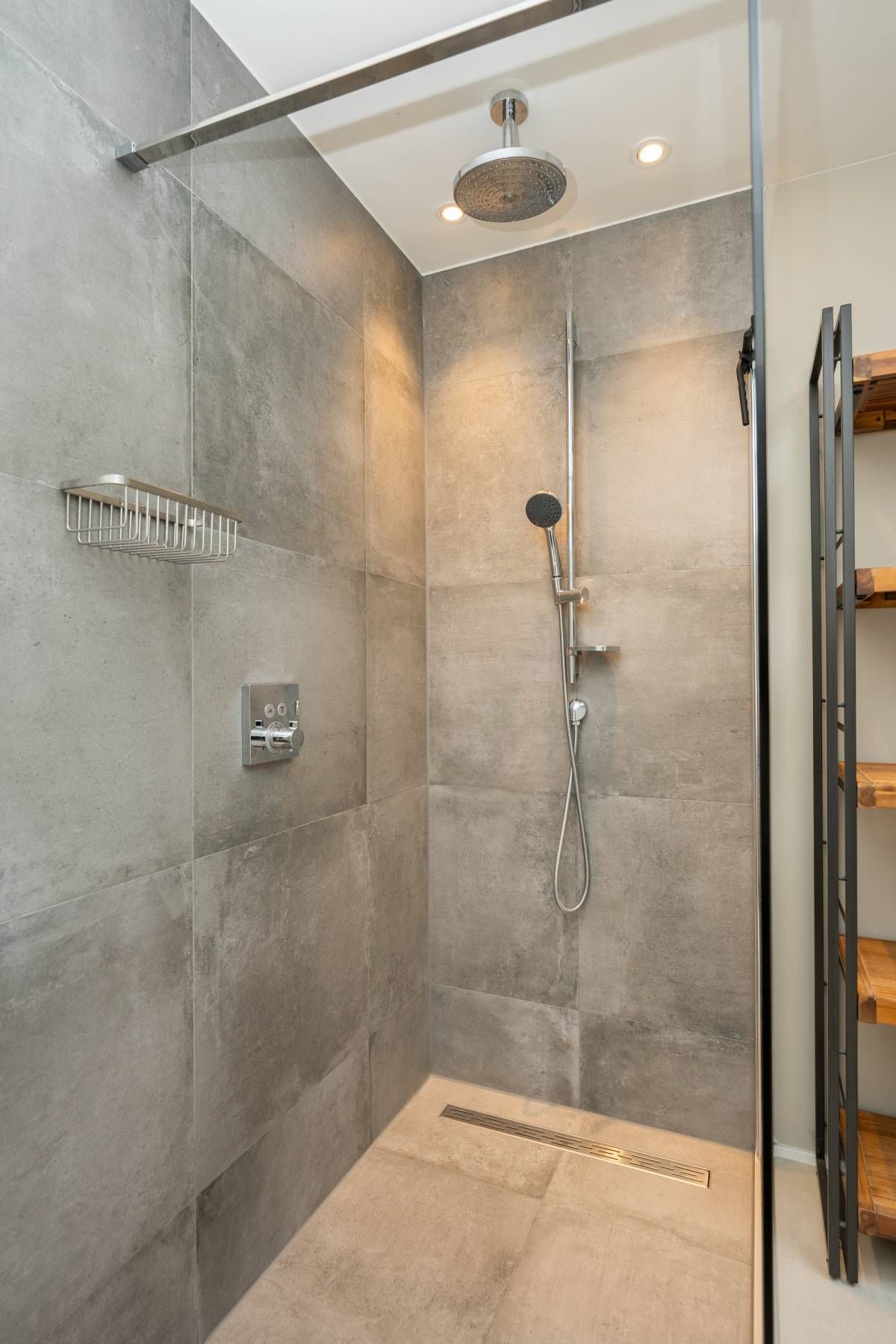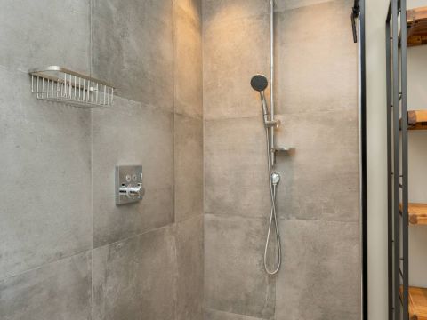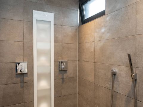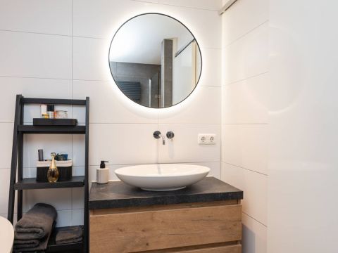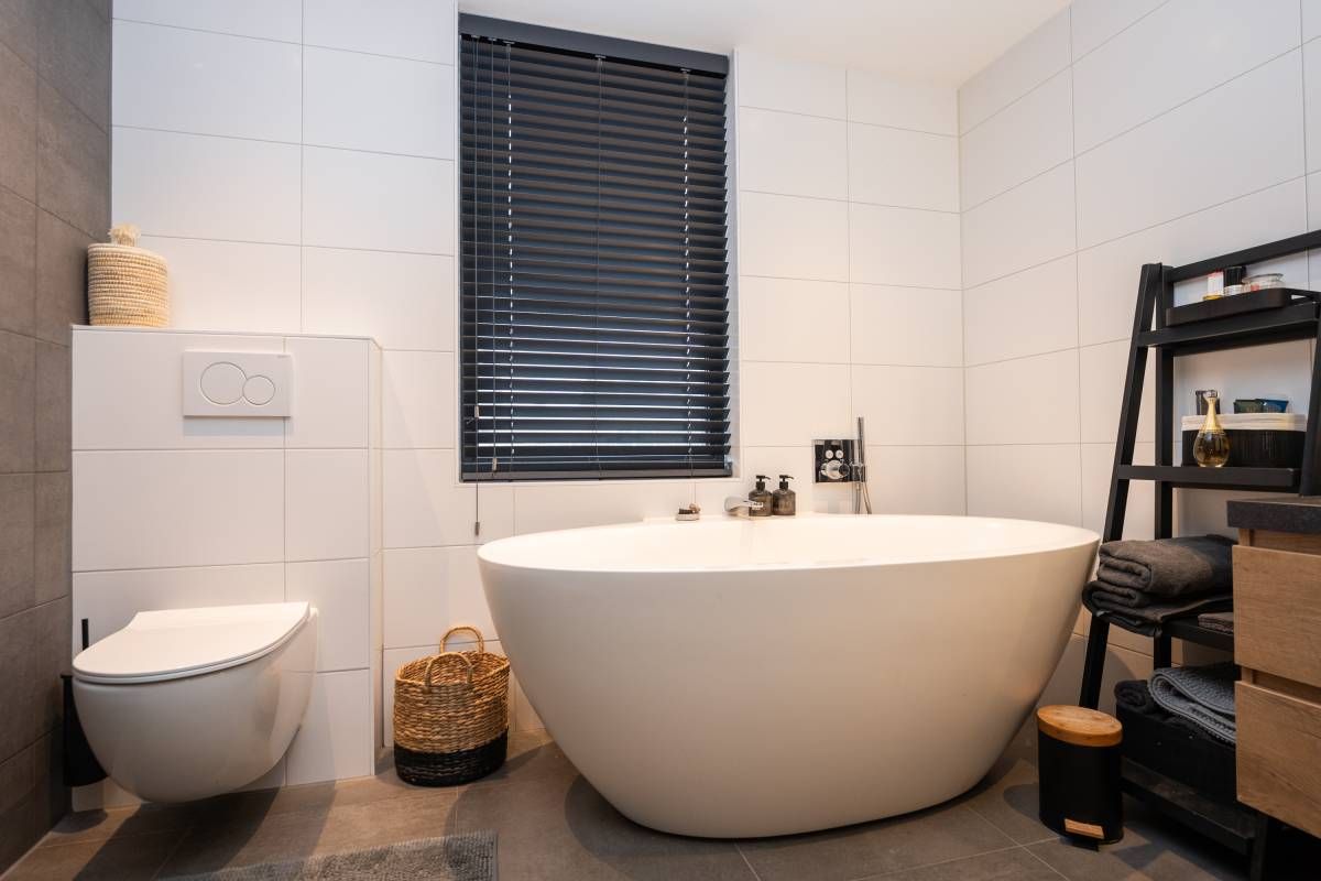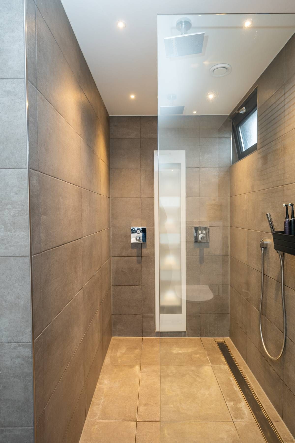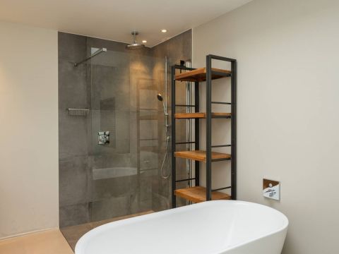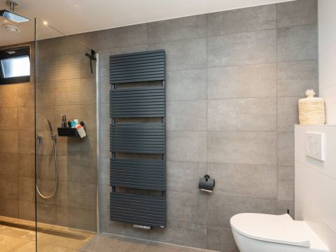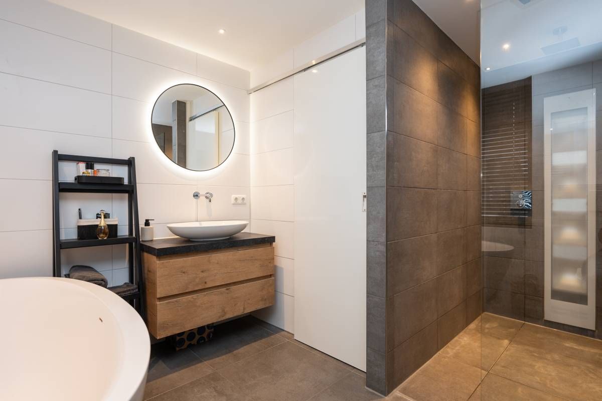 De badkamer is modern ingericht en voorzien van een fantastisch ligbad, een inloopdouche met sun shower, een dubbele stortdouche, vloerverwarming, designradiator en keurig wastafelmeubel.