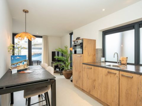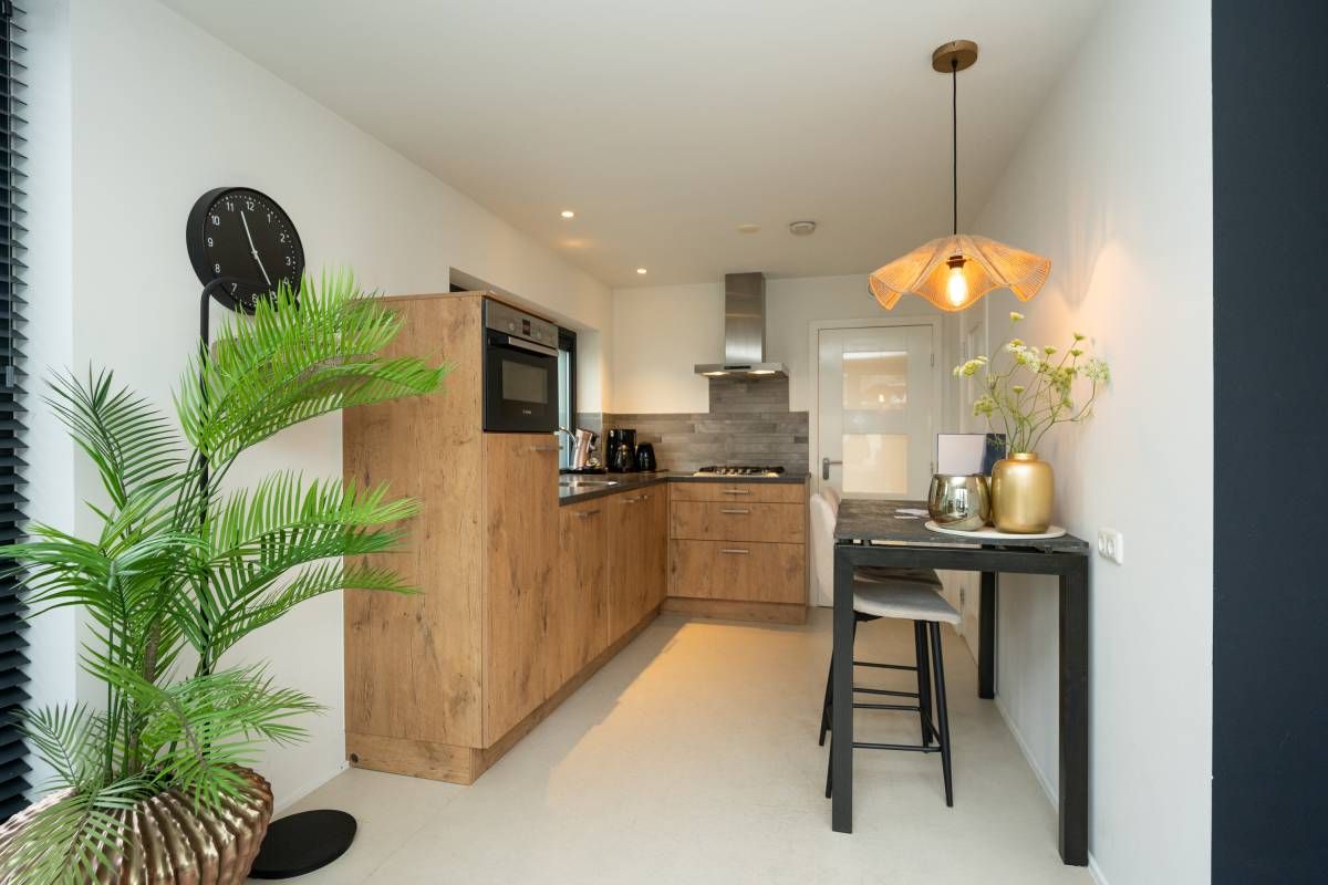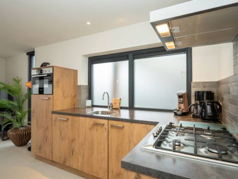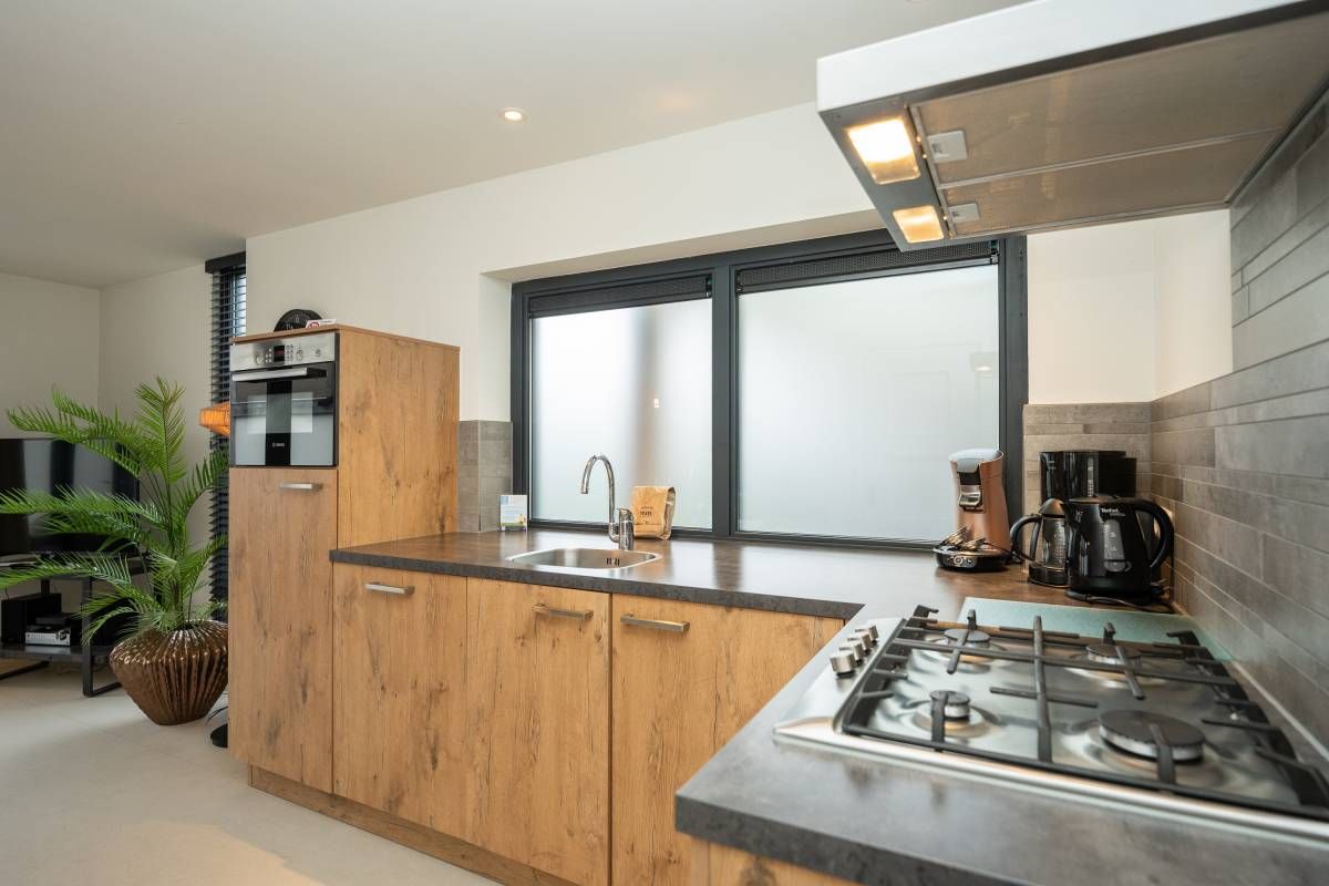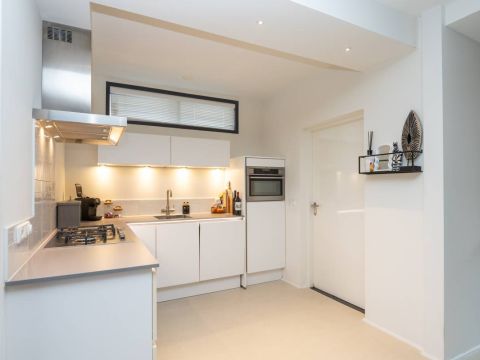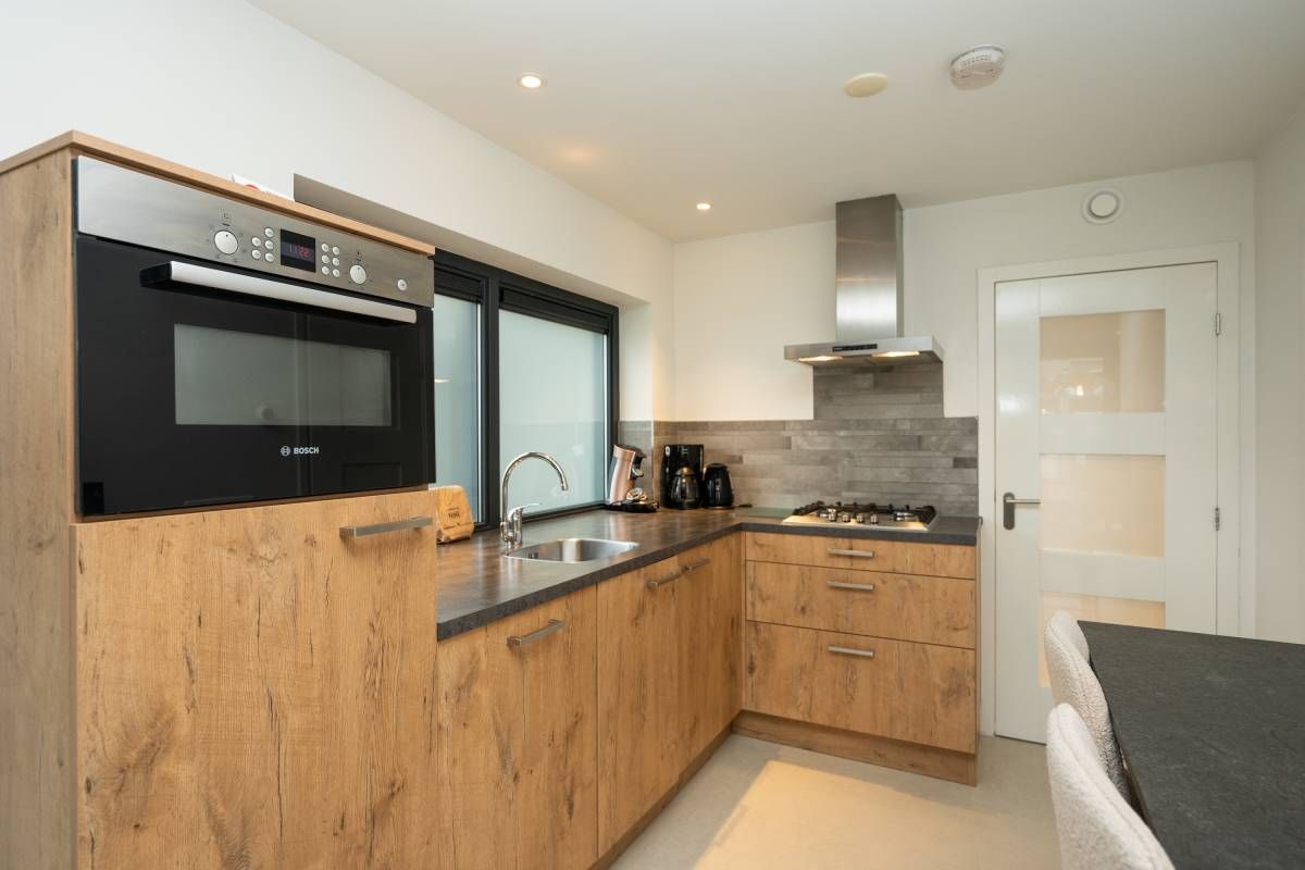 De keuken is modern uitgevoerd en voorzien van luxe inbouwapparatuur, waaronder een 5-pits gasfornuis, combi-oven, afzuigkap, vaatwasser en Quooker.