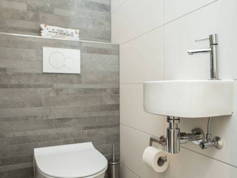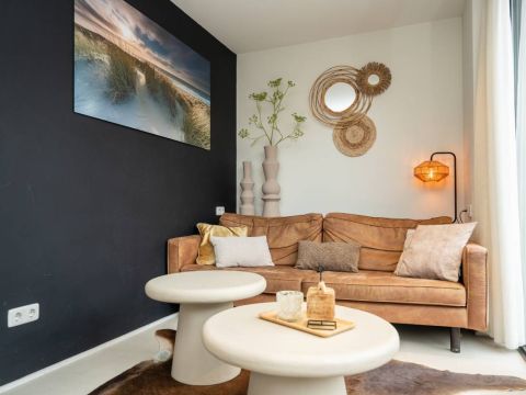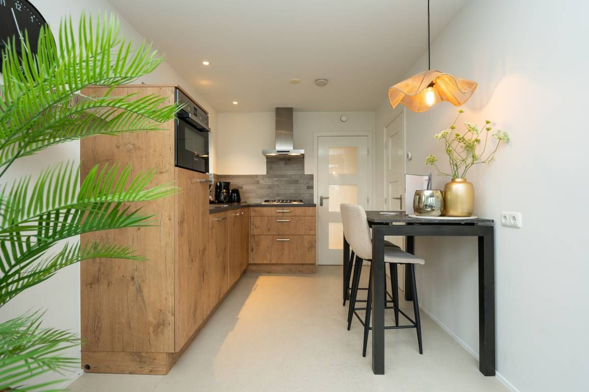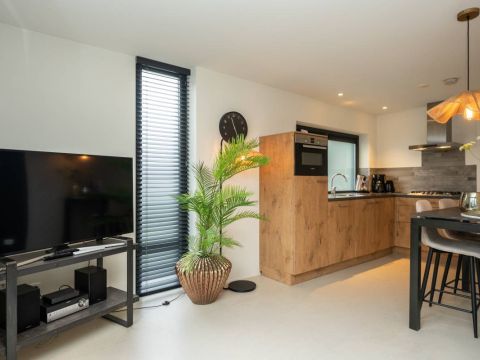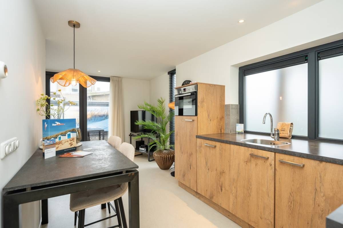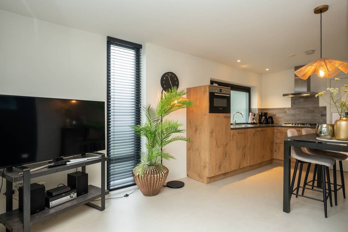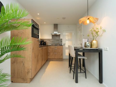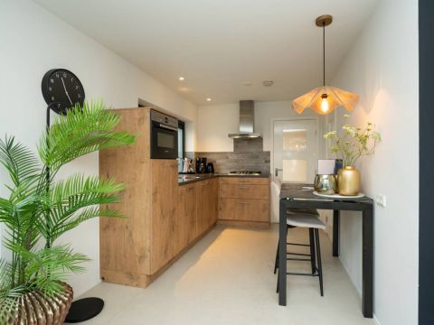 De woonkamer met open keuken ziet er sfeervol uit. De woonkamer heeft openslaande deuren naar een eigen, beschut terras, waar gasten heerlijk kunnen genieten van privacy en zon. De nette open keuken is van diverse gemakken voorzien. Hier kunt u gemakkelijk een eigen maaltijd of ontbijt realiseren. Zeer compleet en netjes afgewerkt.