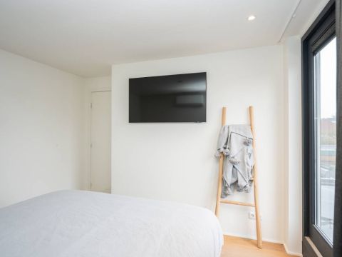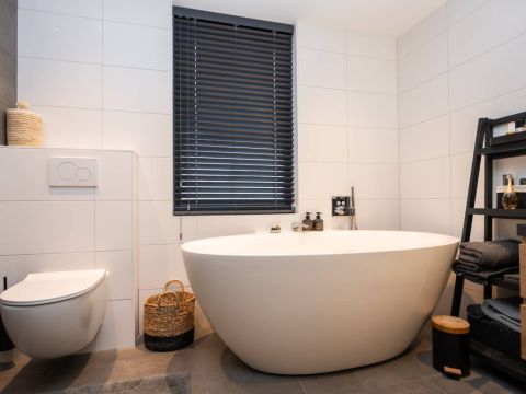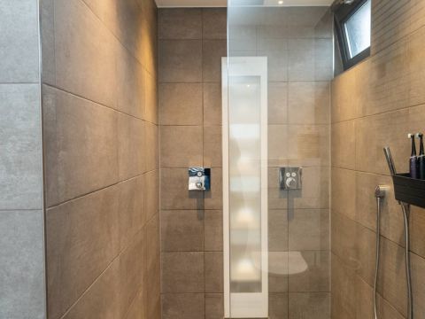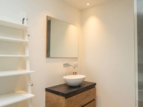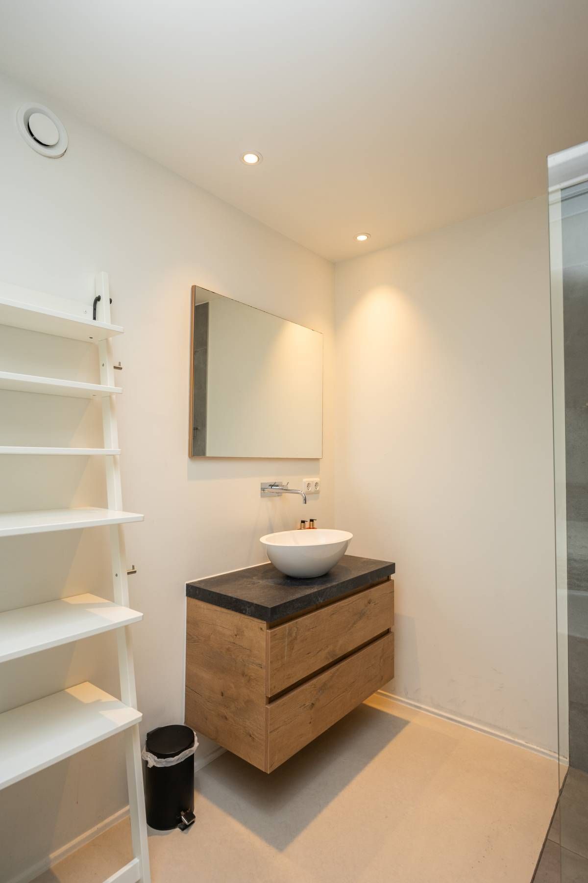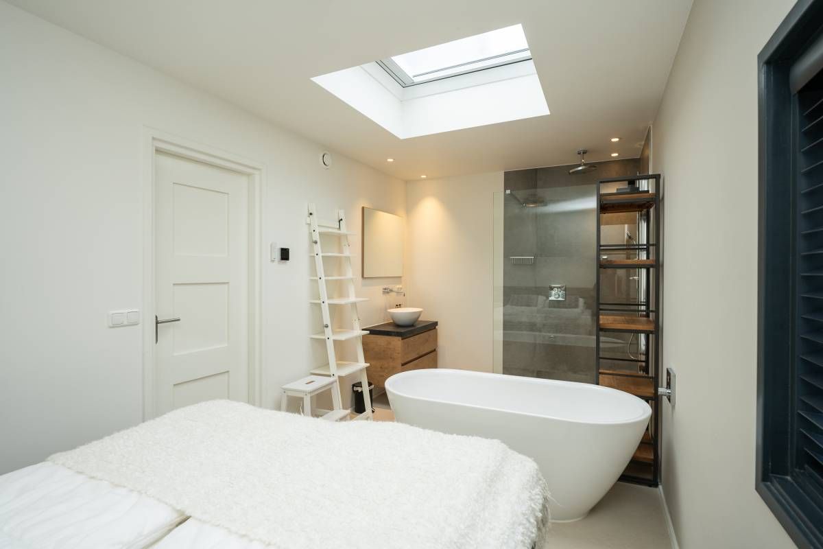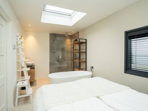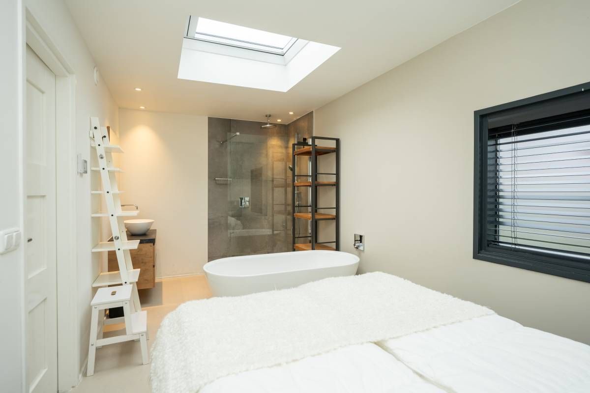 De slaapkamer is ruim en voorzien van een open badkamer. Een echte eyecatcher! De kamer is voorzien van een wastafelmeubel, een inloopdouche met extra stortdouche, heerlijk ligbad en een lichtkoepel die zorgt voor een prachtige natuurlijke lichtinval.