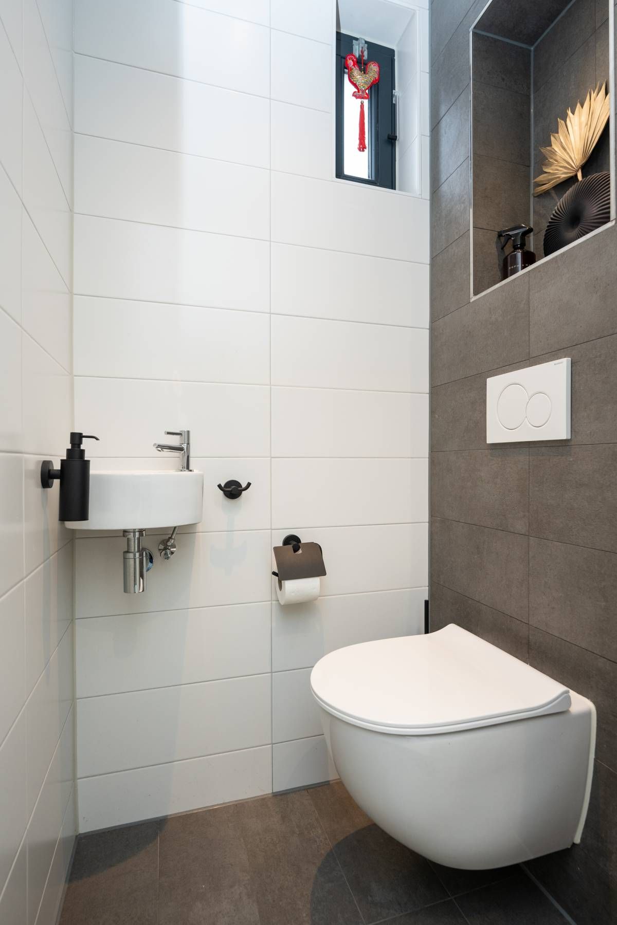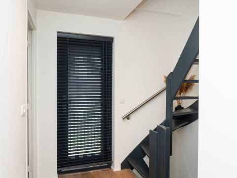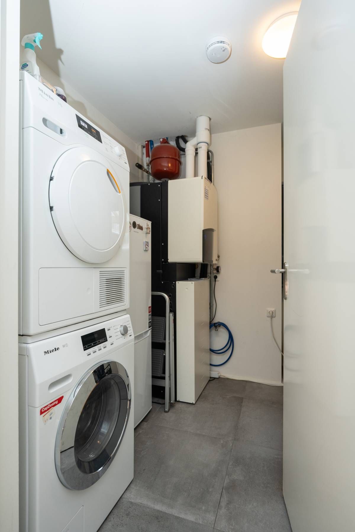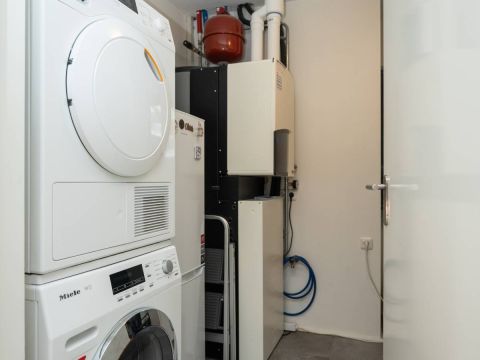 Aansluitend bevindt zich de bijkeuken, met de opstelling voor wasmachine, droger en de HR CV-ketel (2017). In de hal treft u de trapopgang, trapkast, meterkast en het toilet.