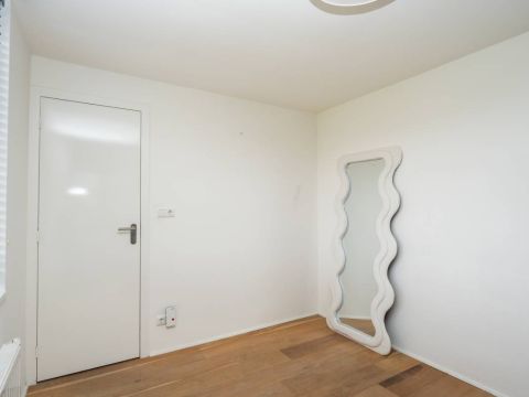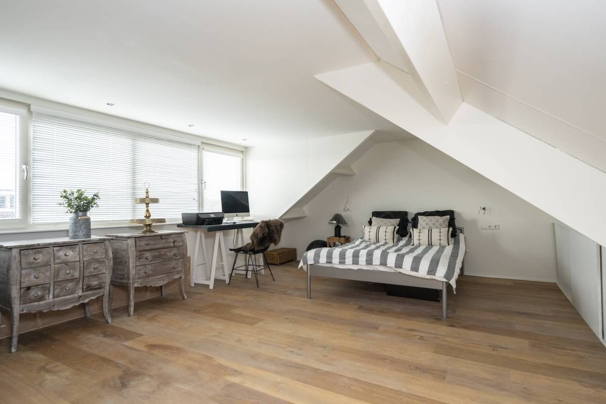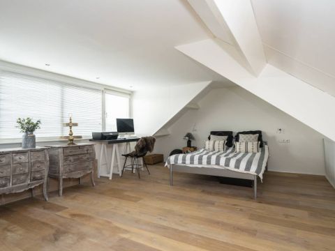 Via een vaste trap bereikt u de tweede verdieping, waar zich een zeer ruime derde slaapkamer bevindt met eveneens eiken vloerdelen en een royale dakkapel. Deze ruimte is ideaal als hoofdslaapkamer, logeerkamer, werkkamer of bergruimte.