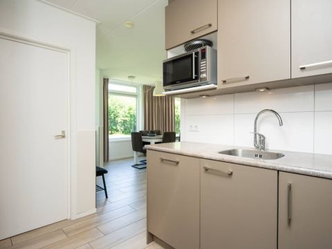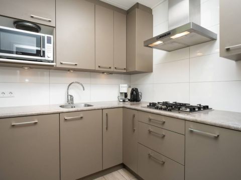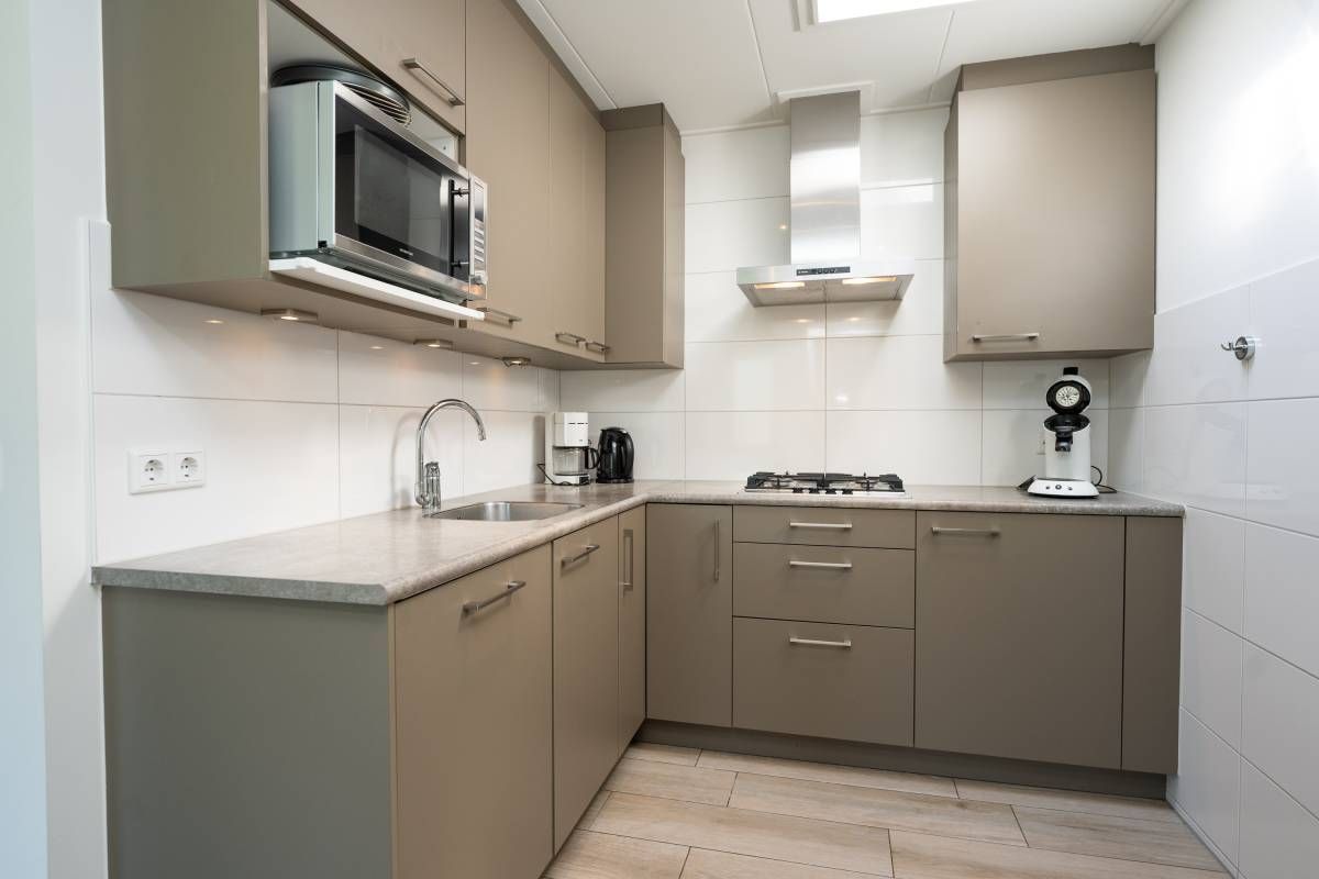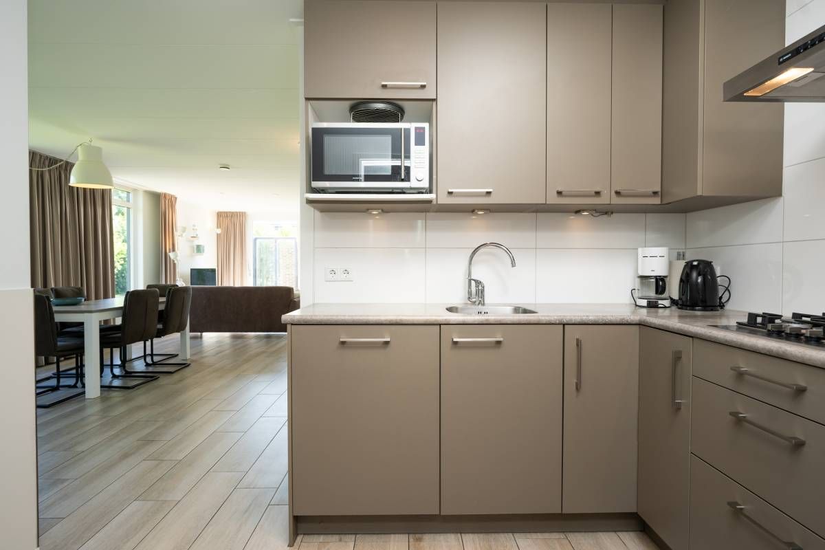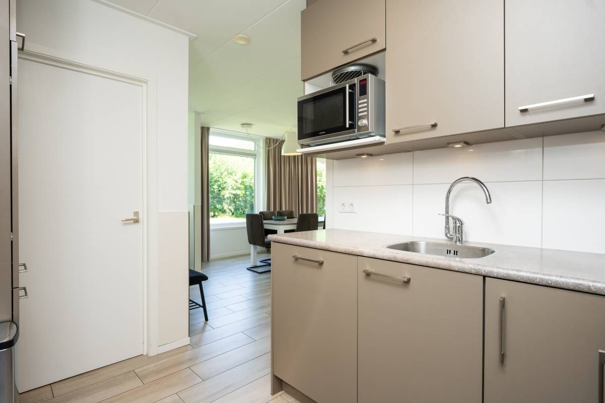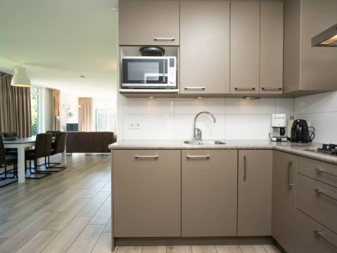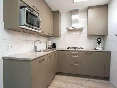 De open keuken is een echte blikvanger! De lichtkoepel zorgt voor een prachtige natuurlijke lichtinval en de keuken is van alle gemakken voorzien: een gaskookplaat, koelkast, vaatwasser en meer. Of u nu uitgebreid wilt koken of snel iets op tafel wilt zetten, hier kan het allemaal.