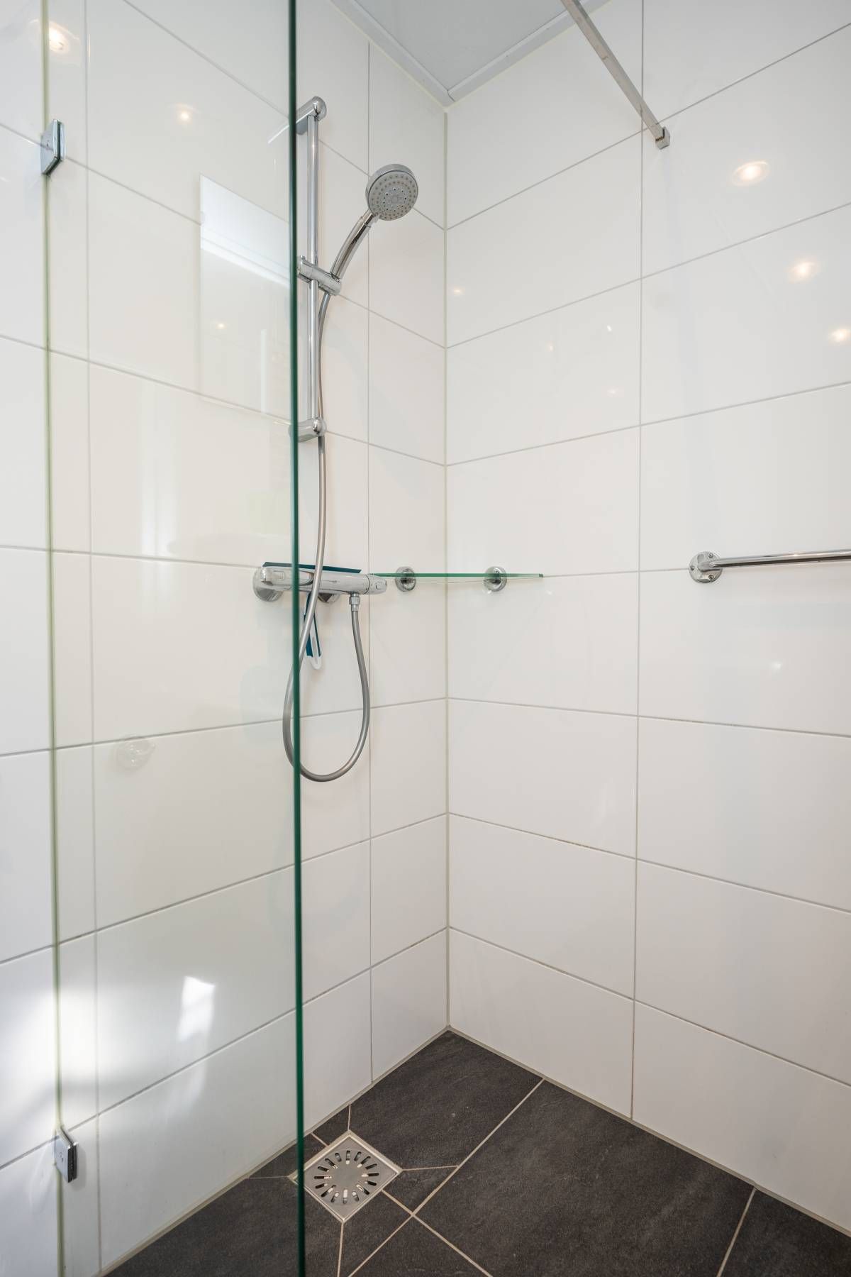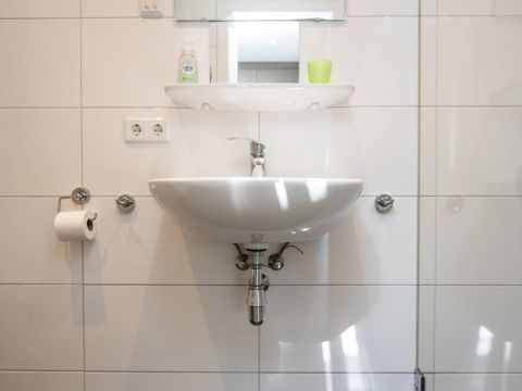 De badkamer is modern en verzorgd en uitgerust met een inloopdouche, wastafel en toilet. Alles is netjes afgewerkt en functioneel ingericht.