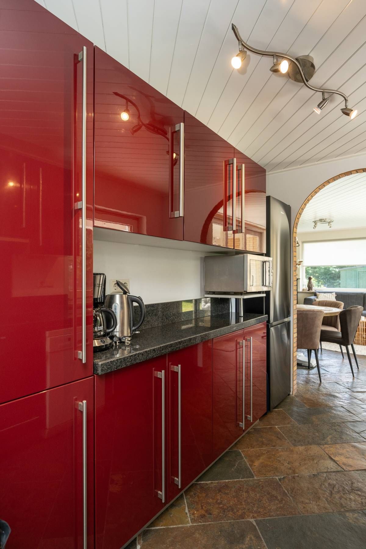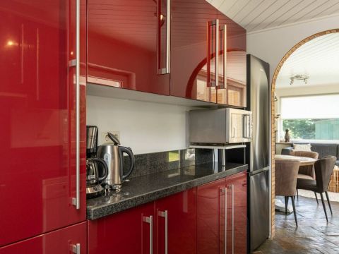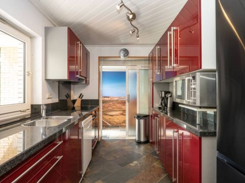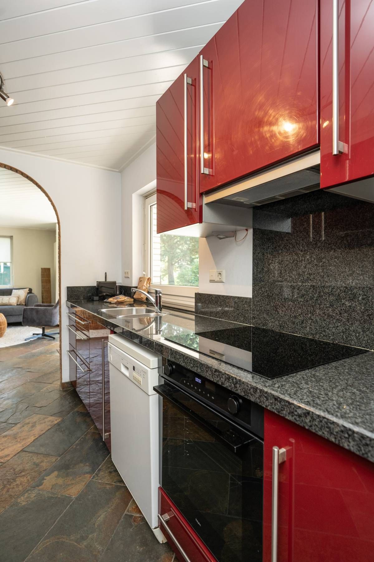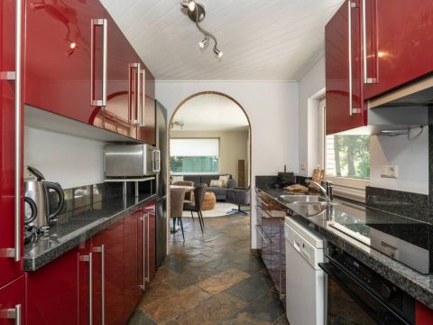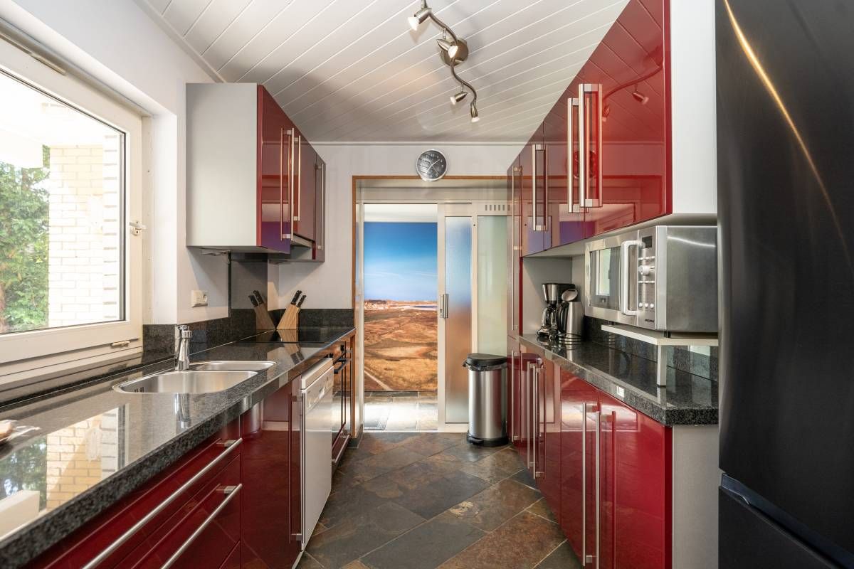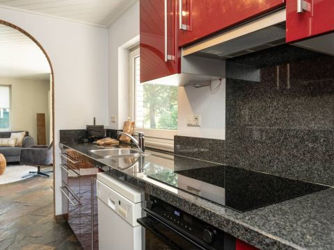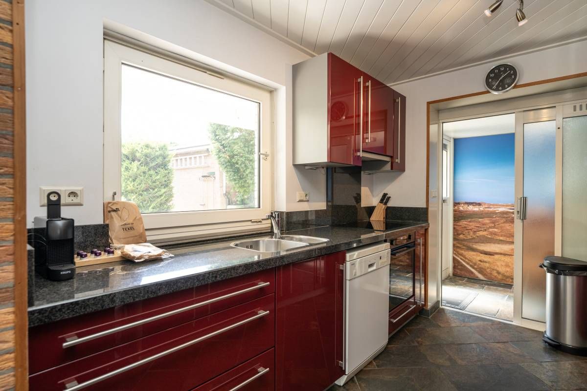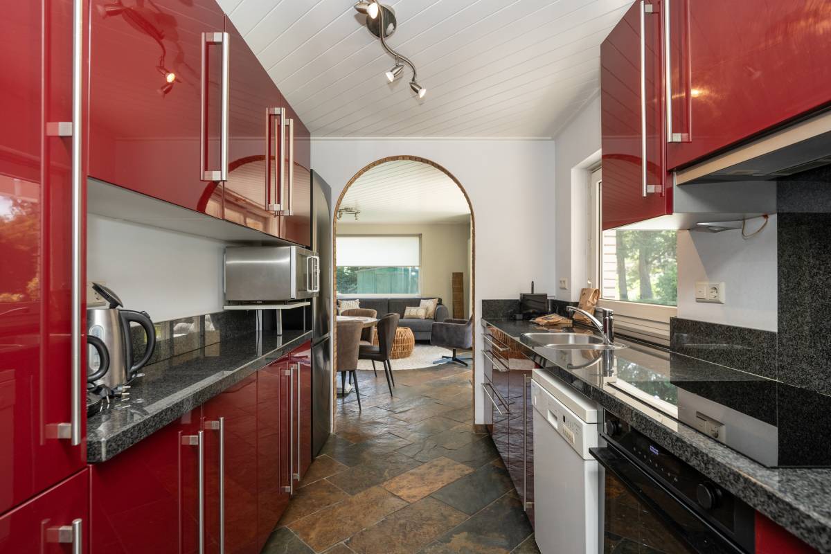 Entree in de hal en via een schuifpui toegang tot de keuken. Deze is uitgerust met inductie kookplaat, afzuigkap, magnetron, oven, vaatwasser en voldoende opbergruimte.