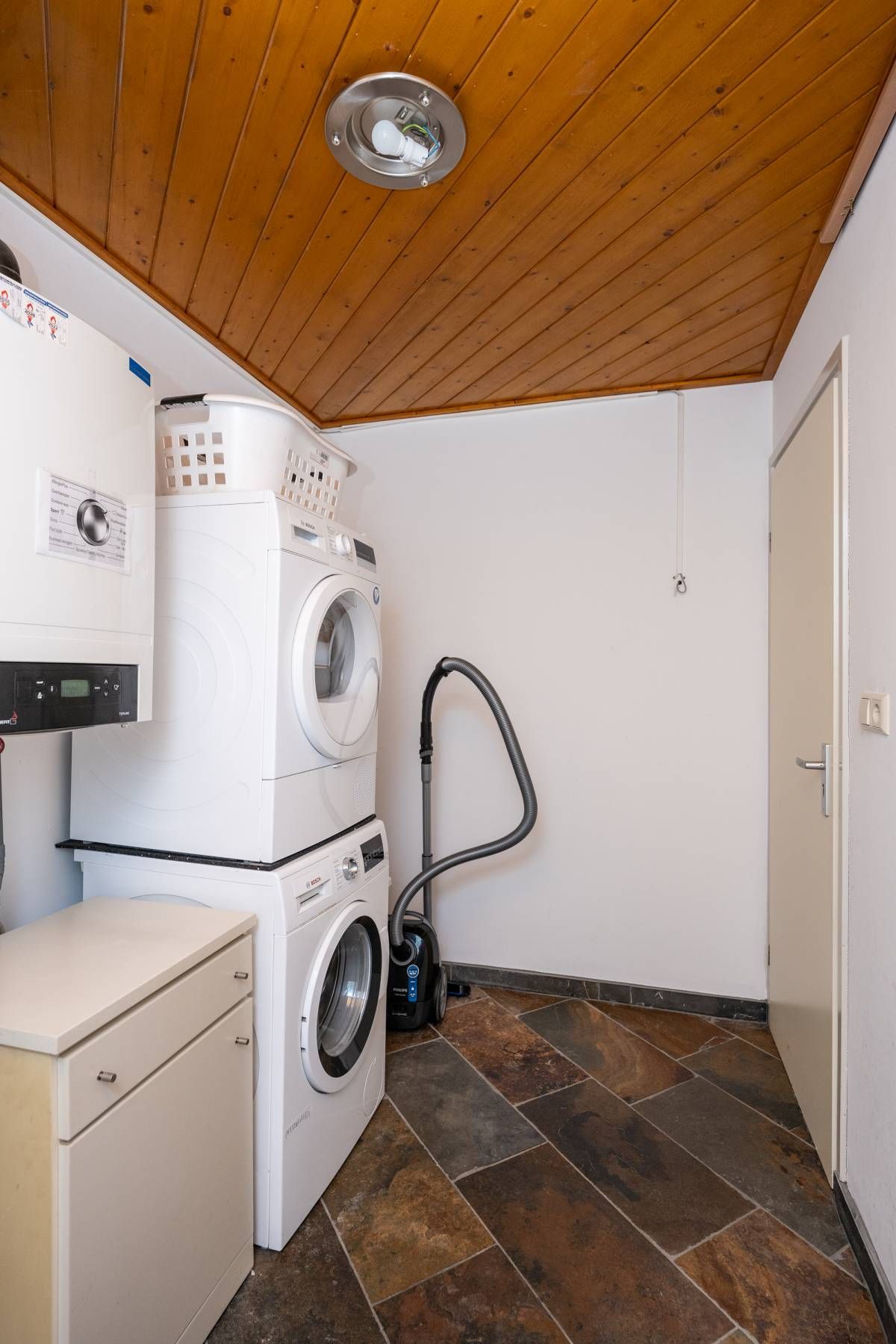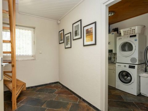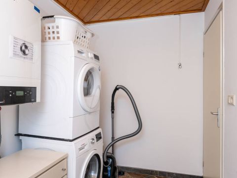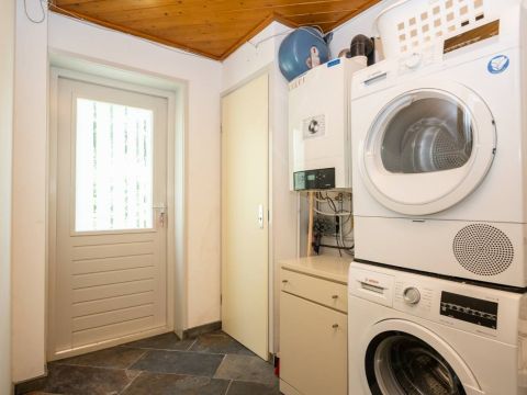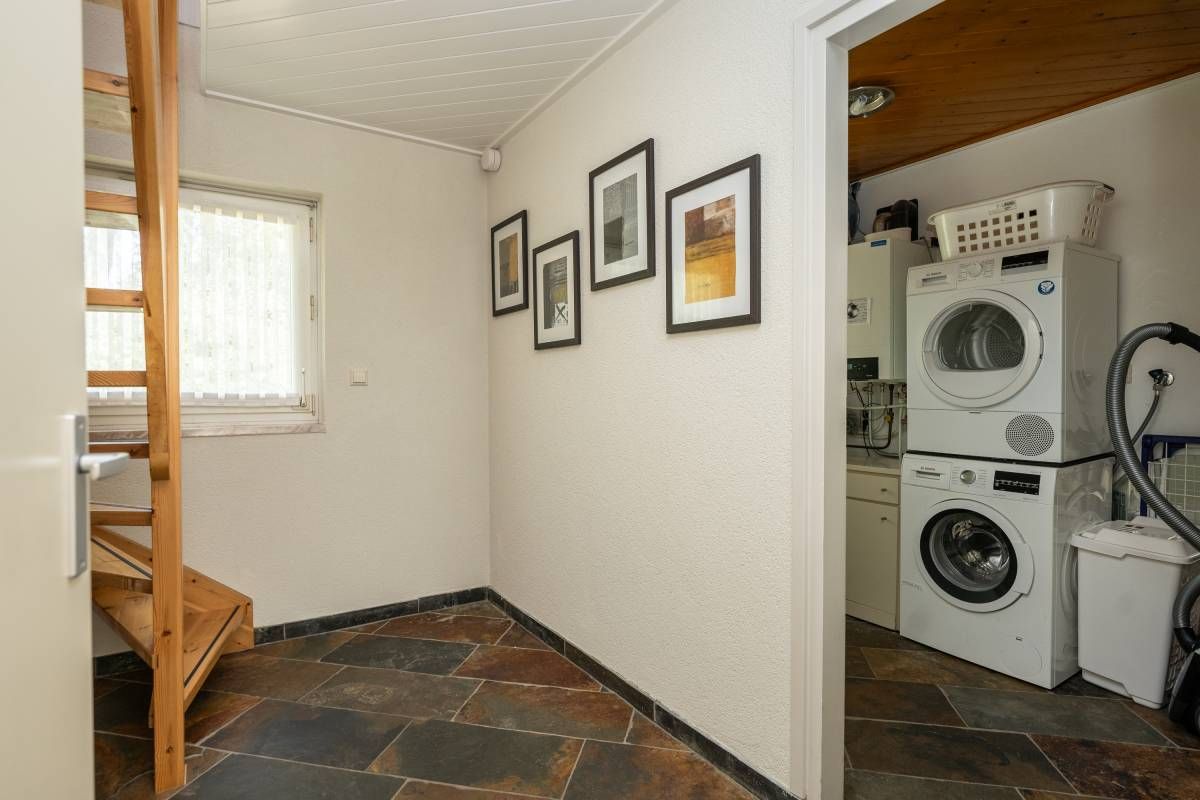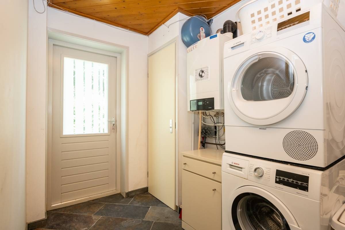 In de berging is de opstelplaats voor de cv-ketel, de wasmachine en de droger. Via de toegangsdeur is een doorloop naar buiten.