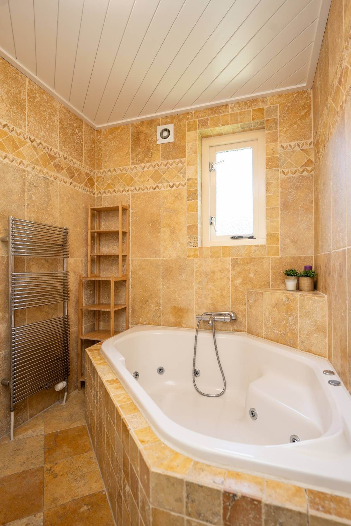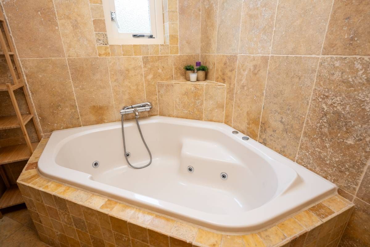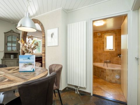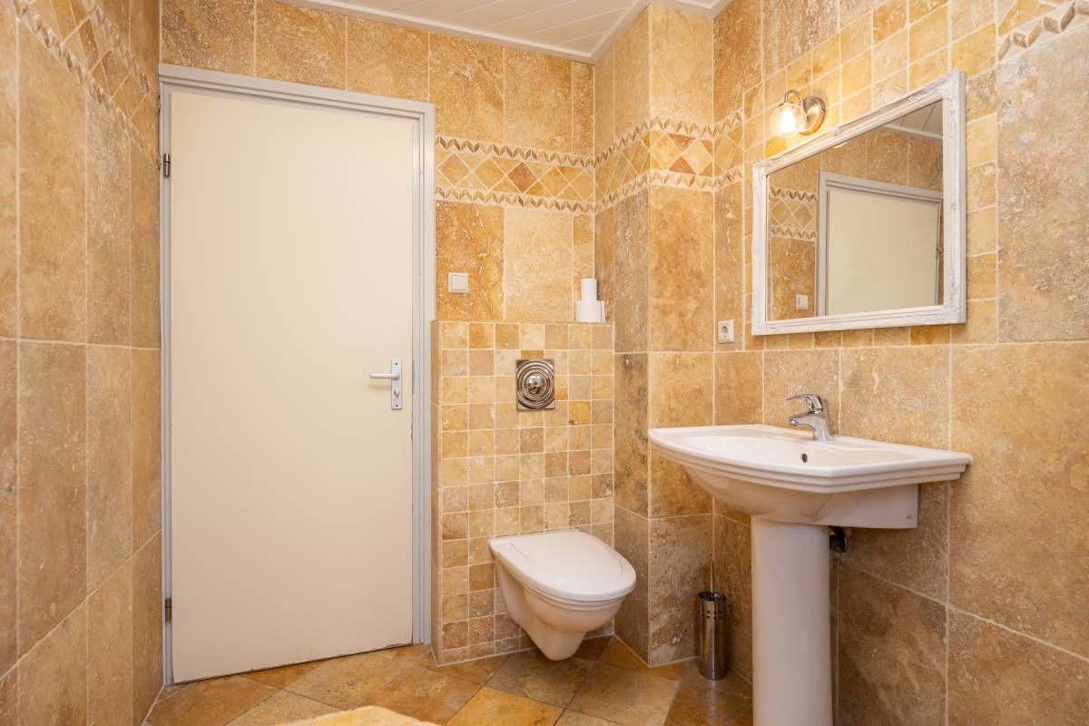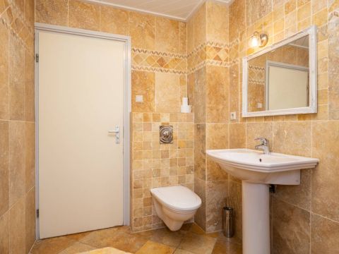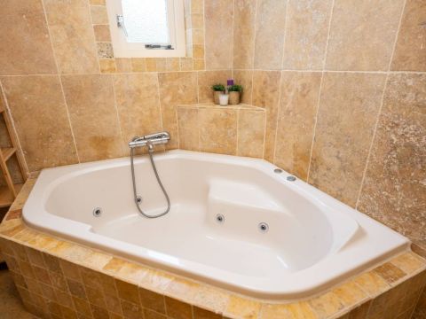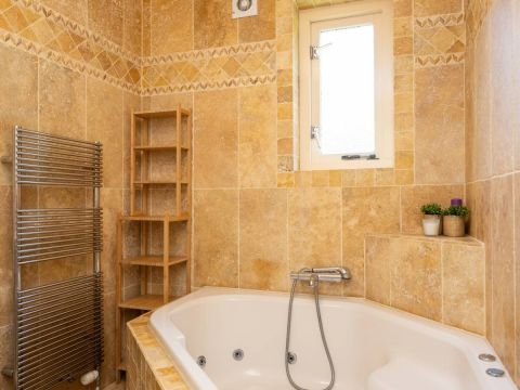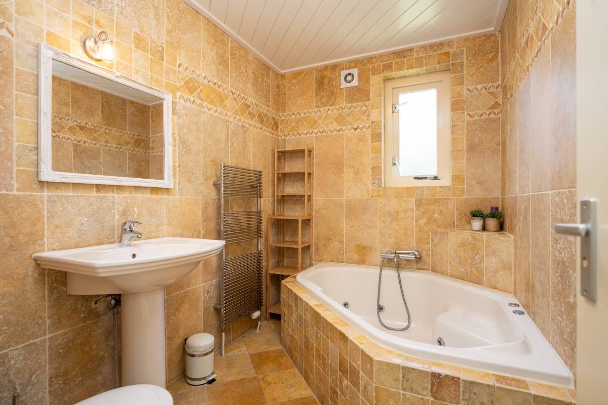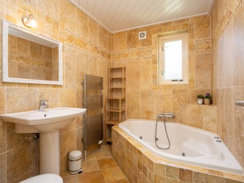 De badkamer op de begane grond is voorzien van vloerverwarming, bubbelbad met douche, een wastafel en een toilet.