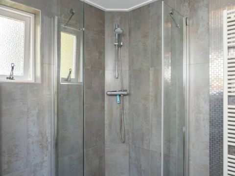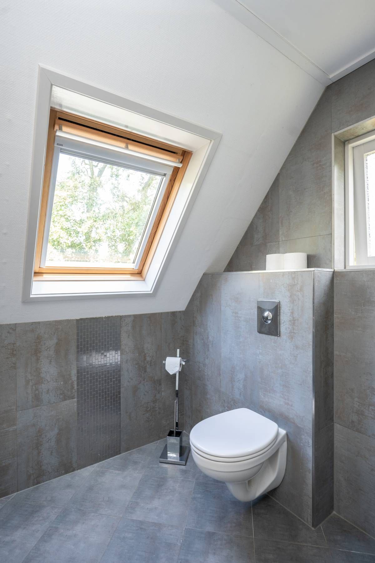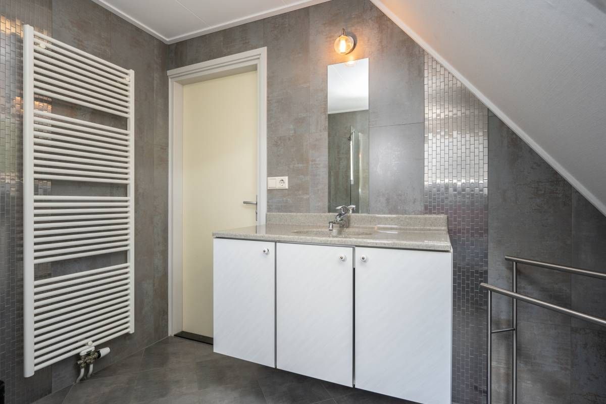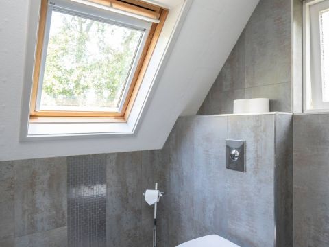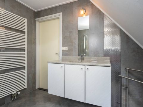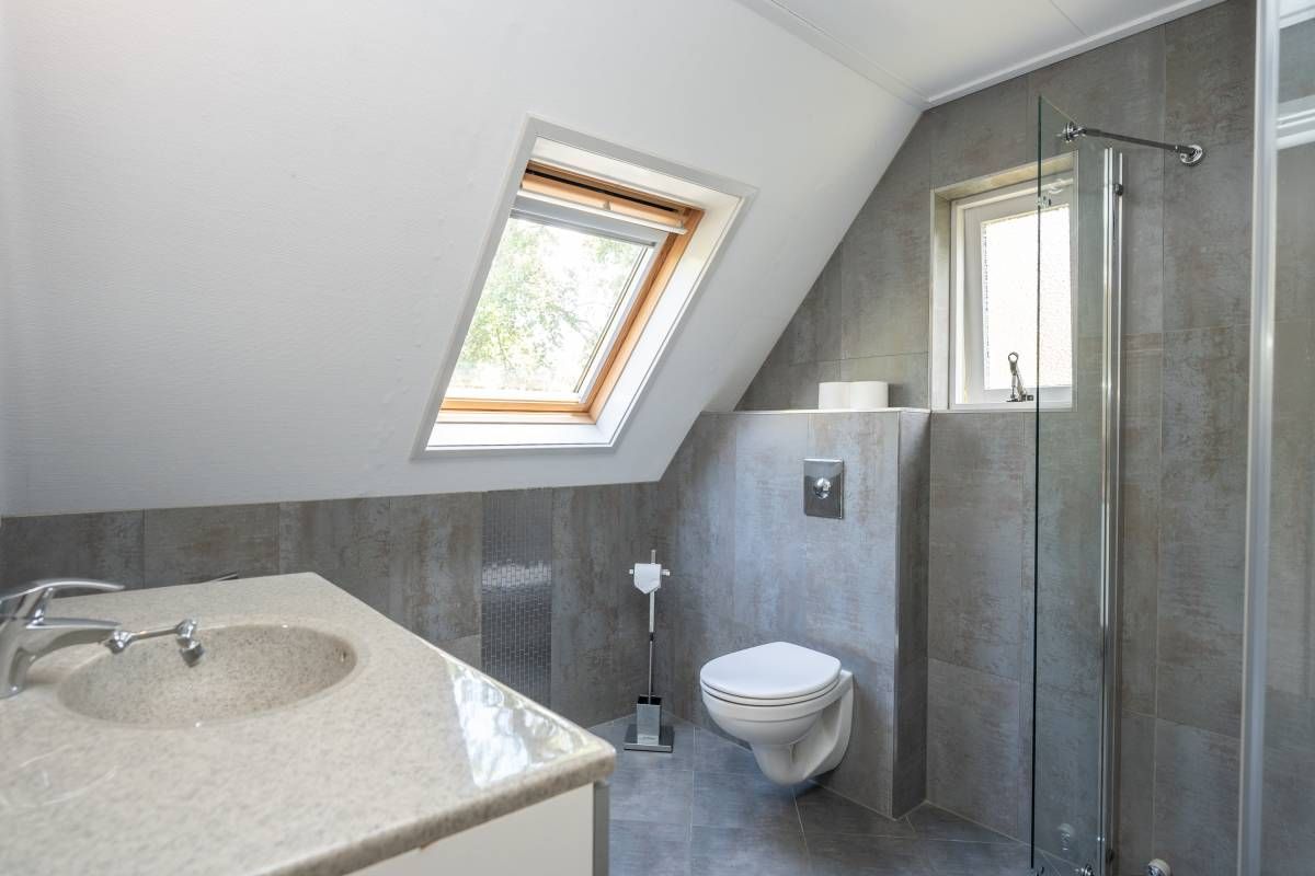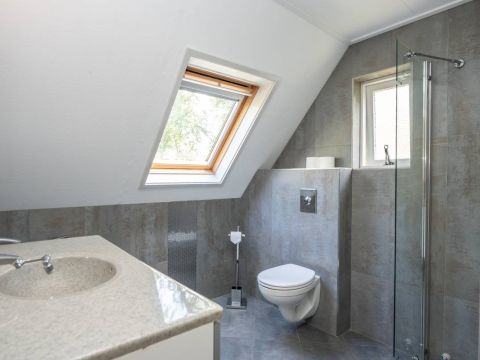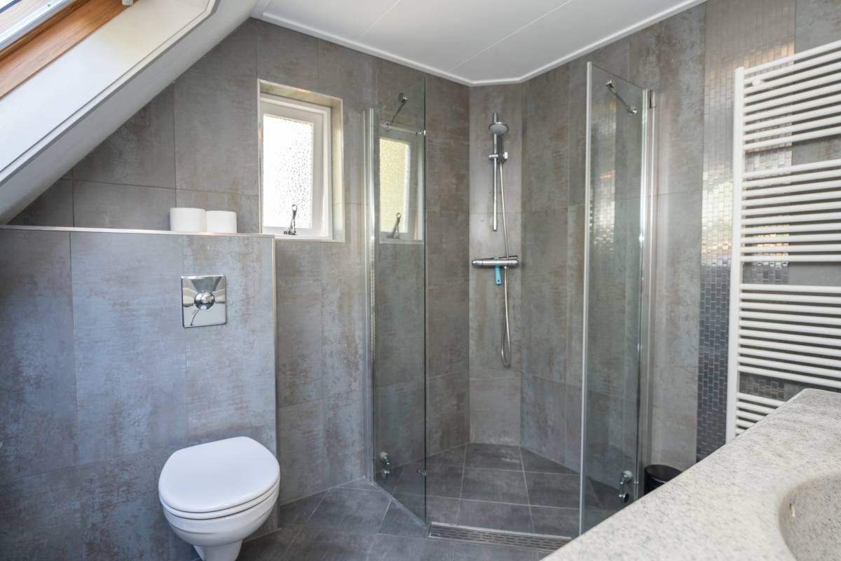 De moderne badkamer op de verdieping is uitgerust met een wastafelmeubel, designradiator, toilet en ruime douchehoek met glazen wand. Het grote dakraam zorgt voor extra ventilatie.