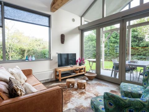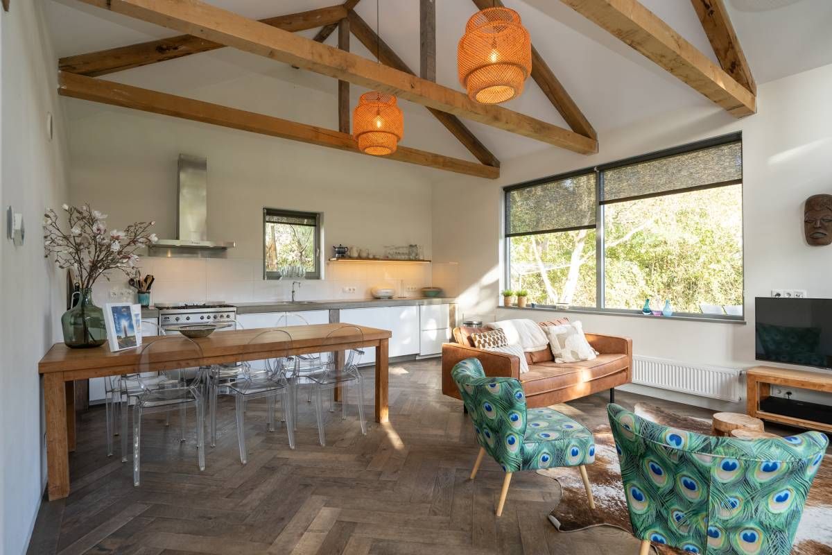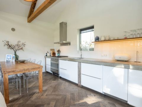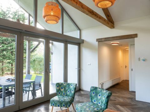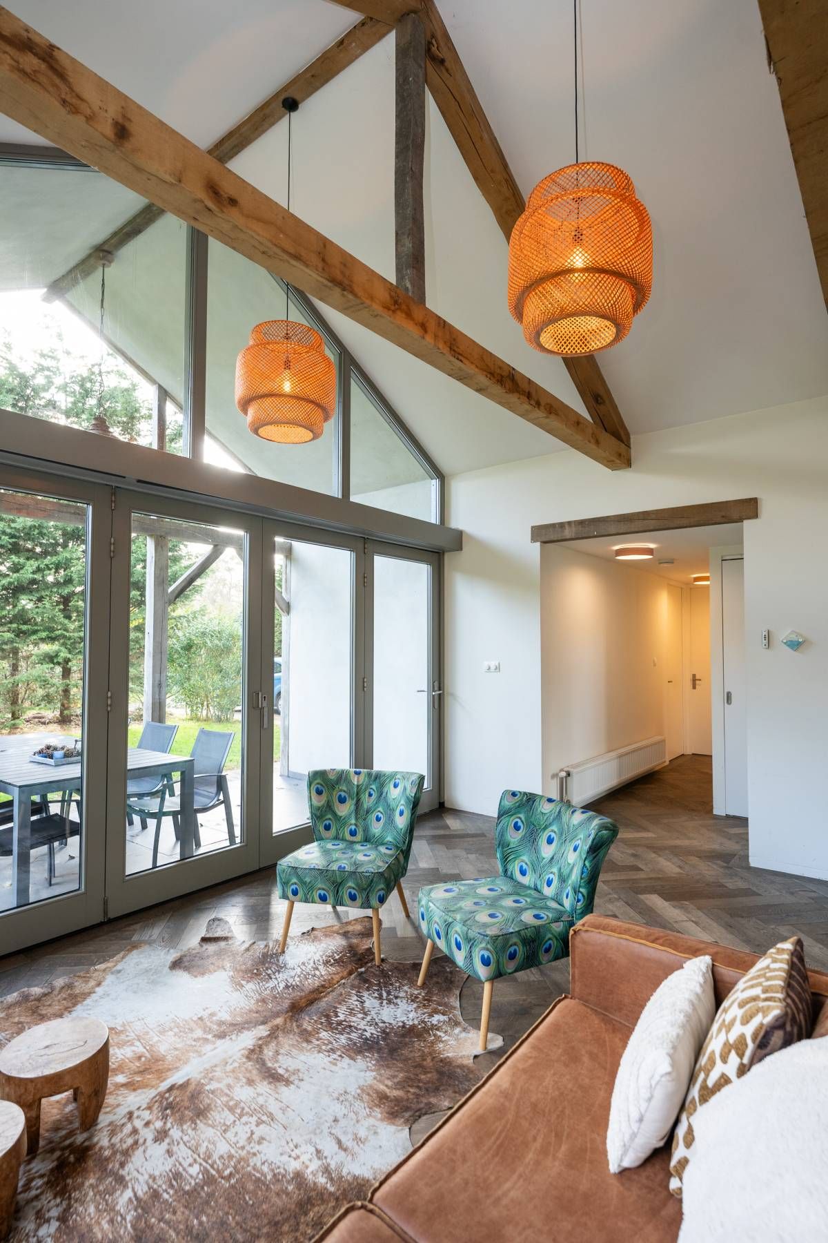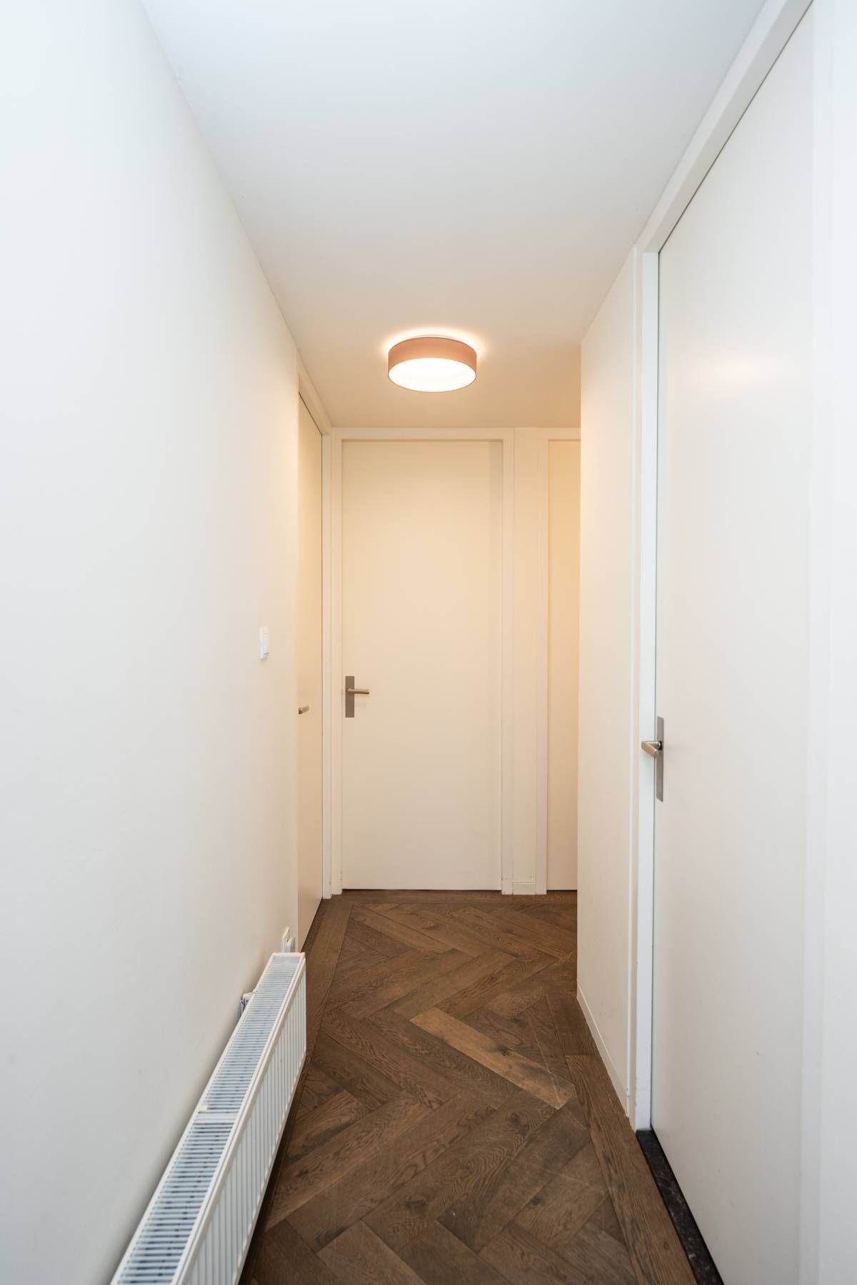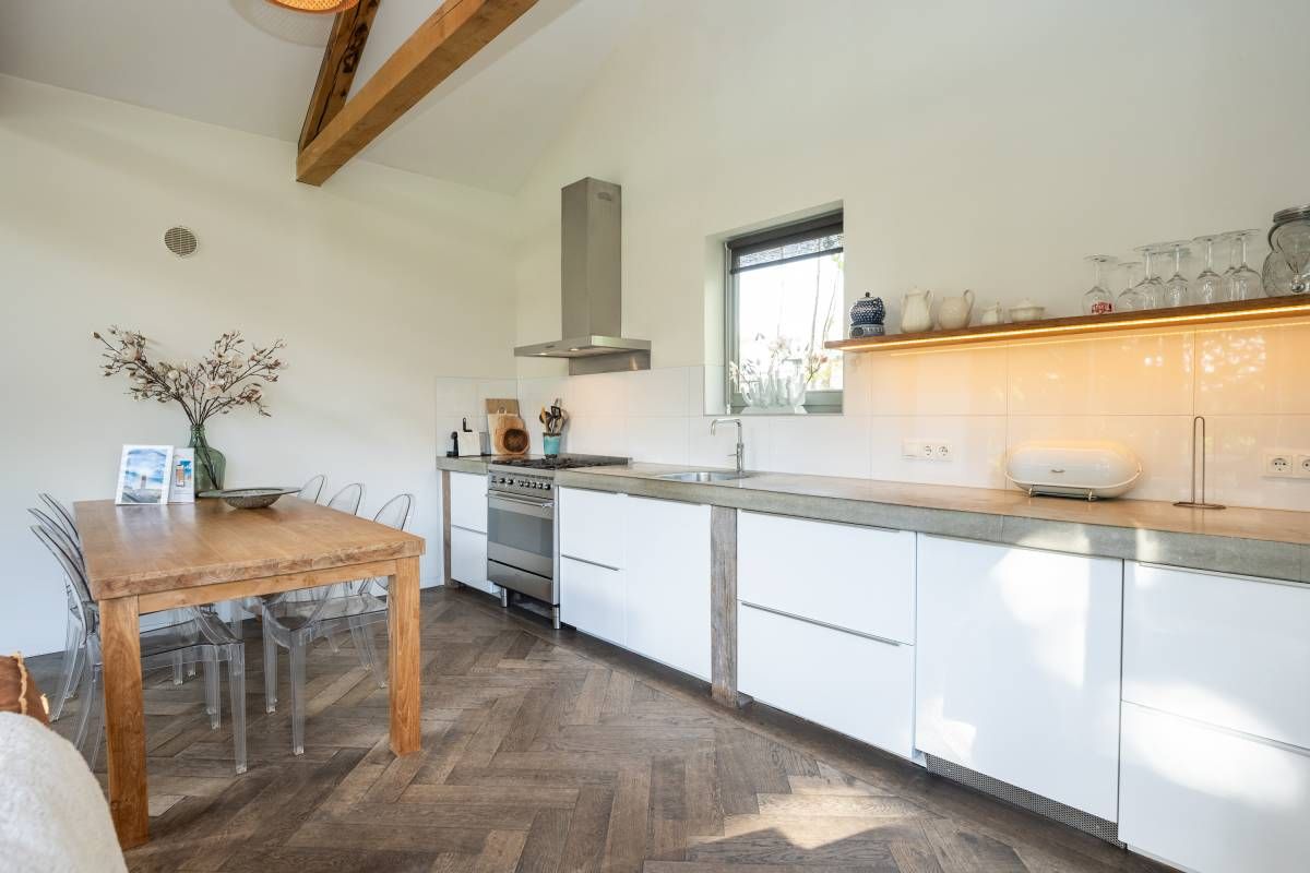 De lichte woonkamer vormt het hart van de woning. De diverse raampartijen en de harmonica pui zorgen voor een mooie verbinding tussen binnen en buiten. De woonkamer is licht en ruim van opzet en biedt een stijlvolle basis met een fraaie visgraatvloer. Dankzij de harmonica pui ontstaat een naadloze overgang van binnen naar buiten, waardoor de leefruimte zich op warme dagen gemakkelijk uitbreidt naar de tuin. Dit geeft niet alleen een ruimtelijk en luchtig gevoel, maar maakt de woonkamer ook bijzonder aangenaam om in te verblijven.