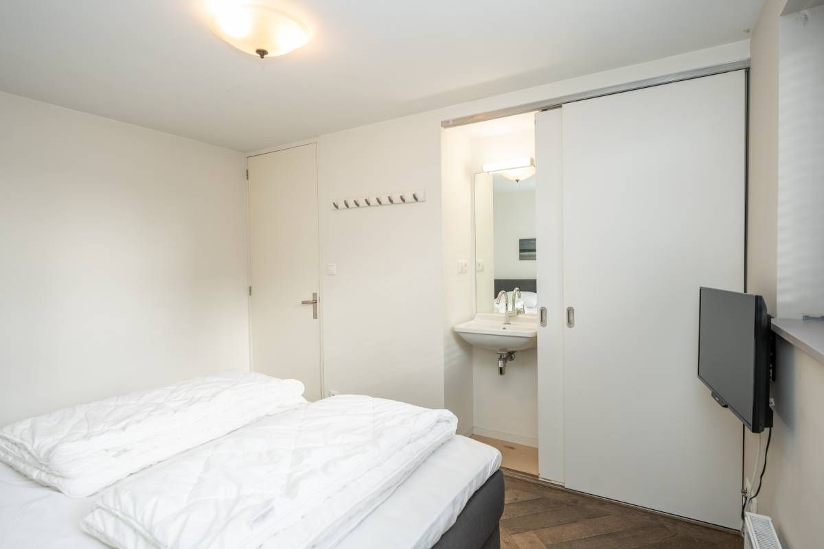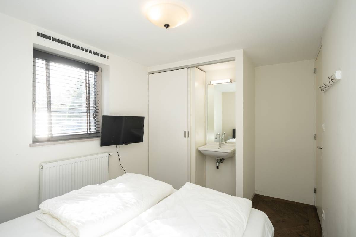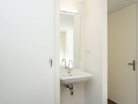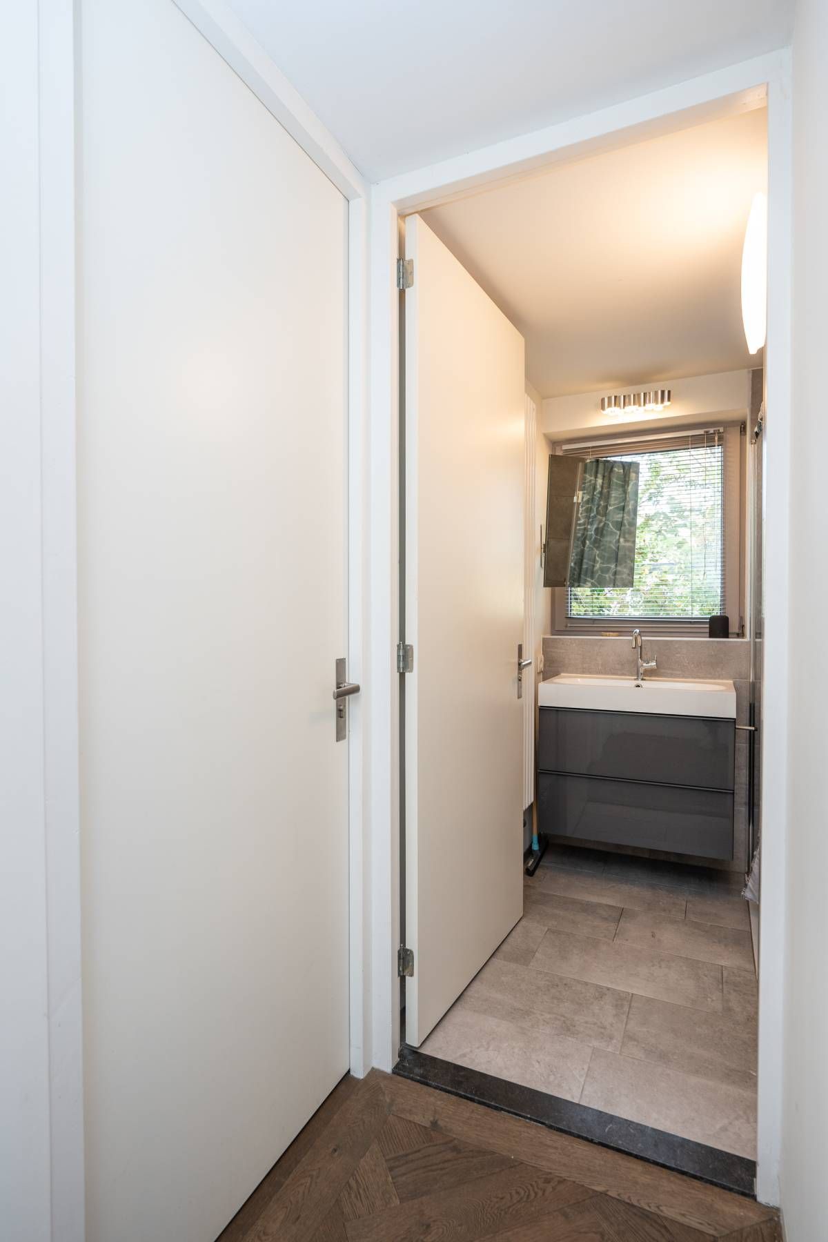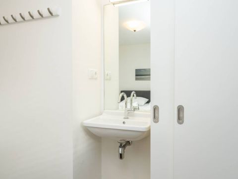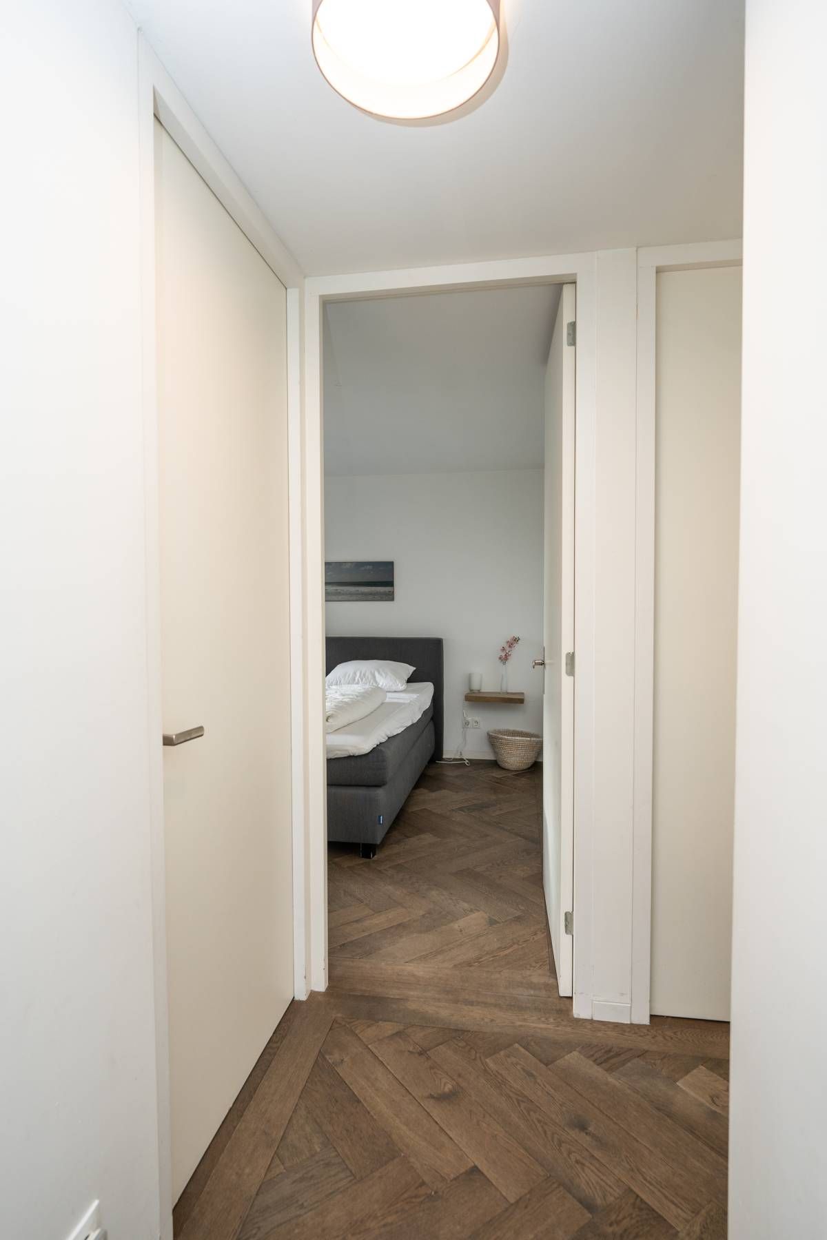 Twee slaapkamers beschikken over een kastenwand met ingebouwde wastafel achter de schuifdeur. De drempelvrije en mooie vloer loopt door over de gehele begane grond.