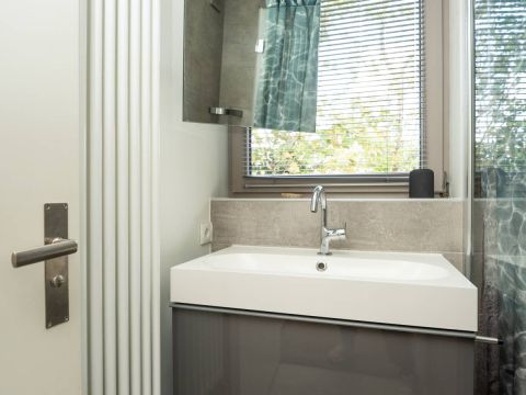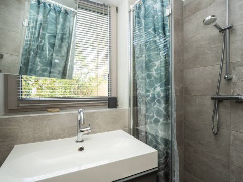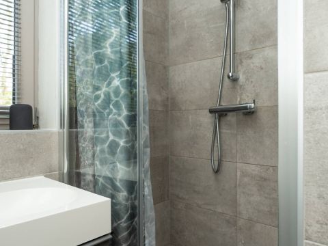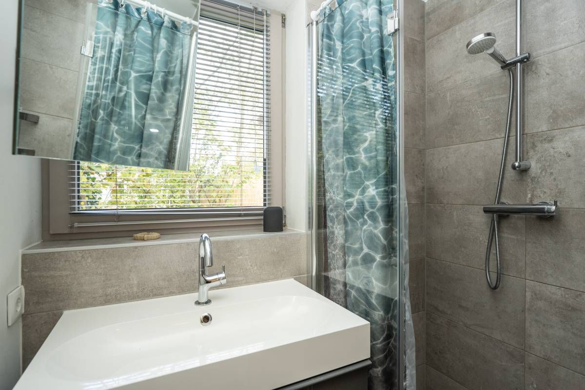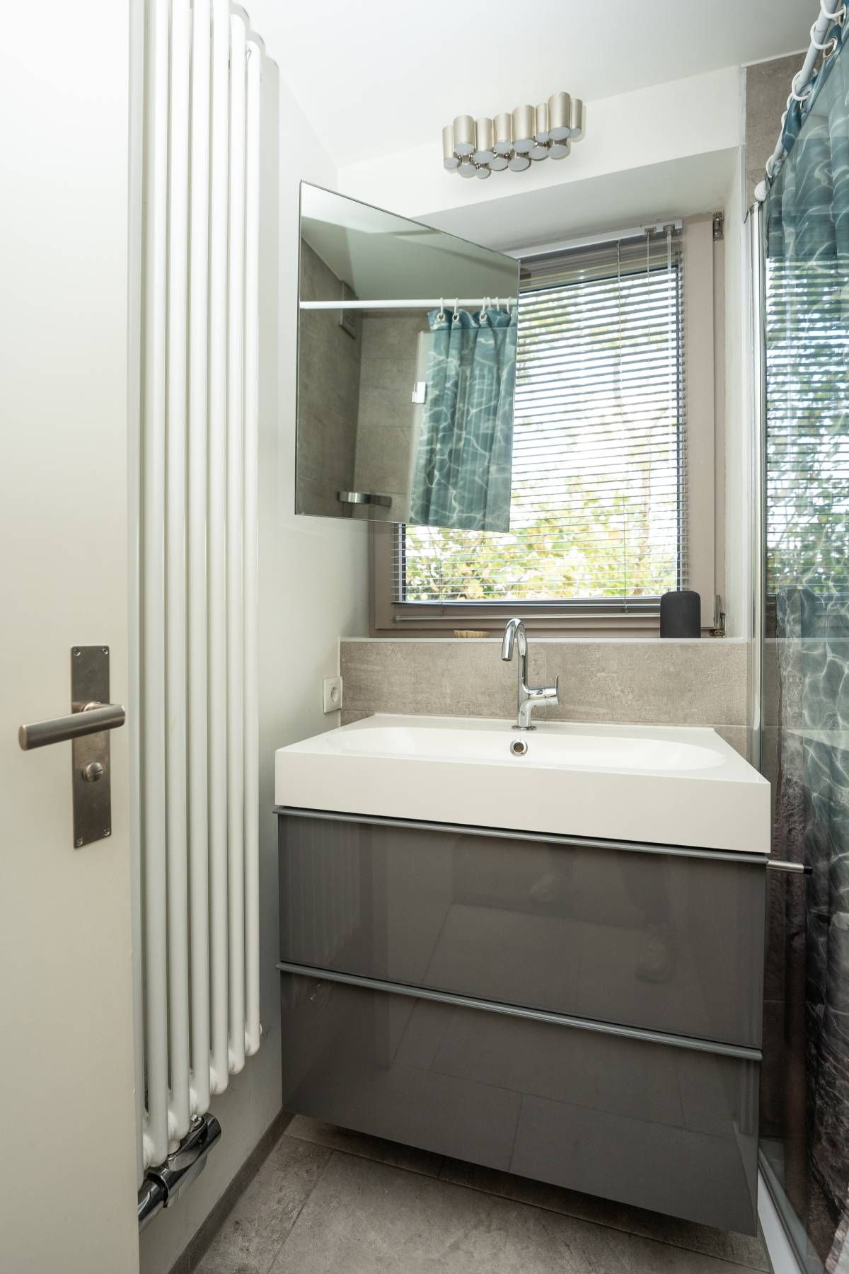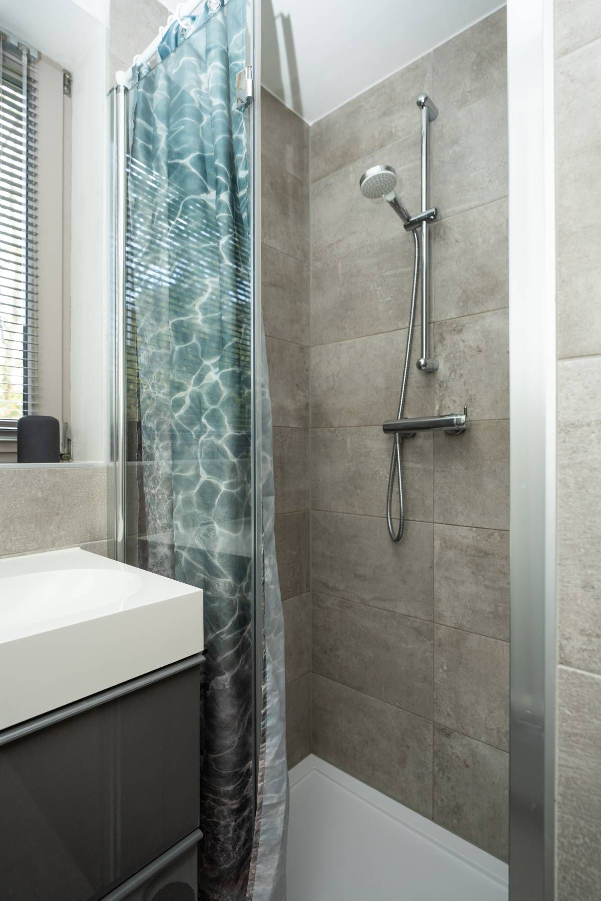 De nette en compacte badkamer is voorzien van een douche en een wastafelmeubel.