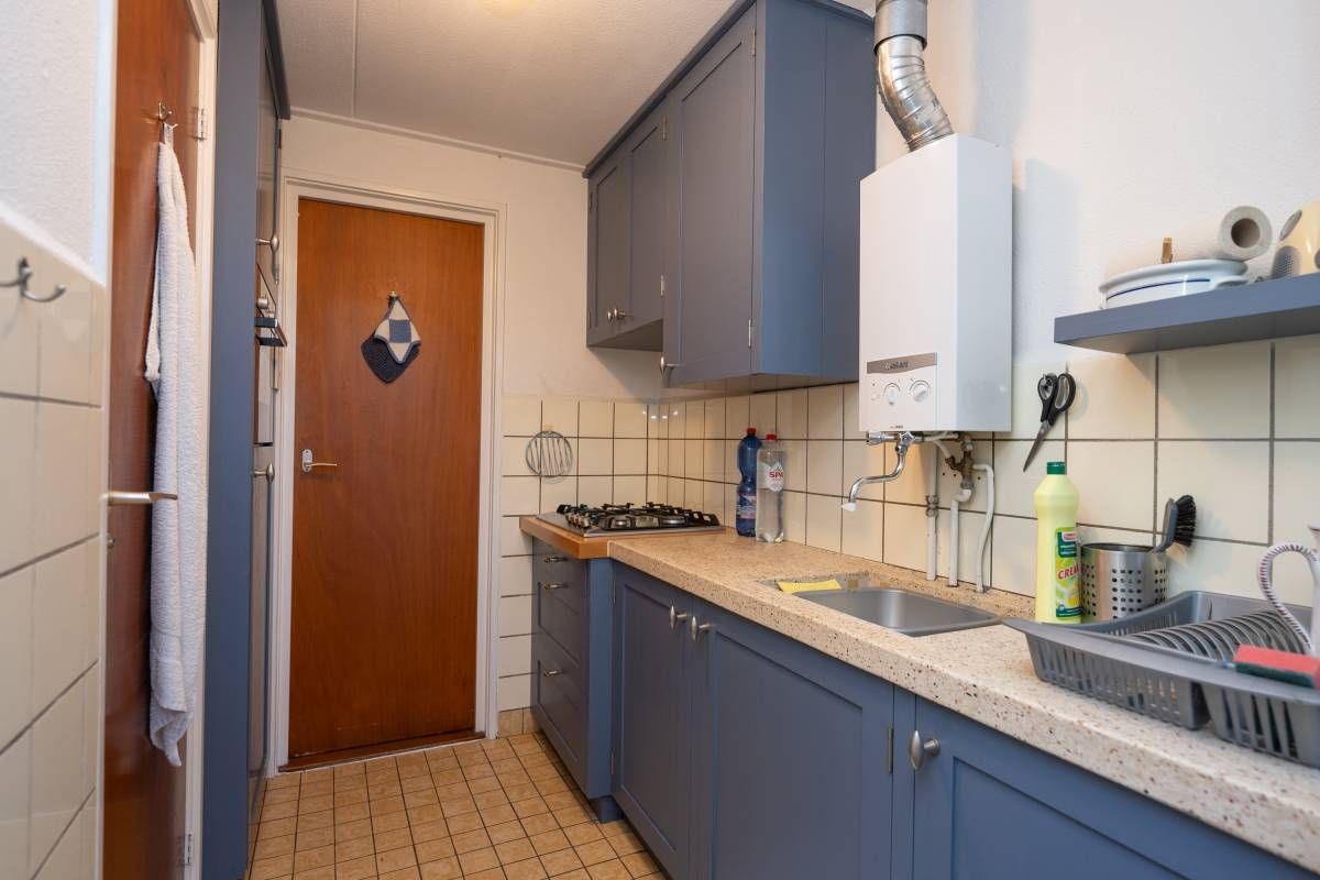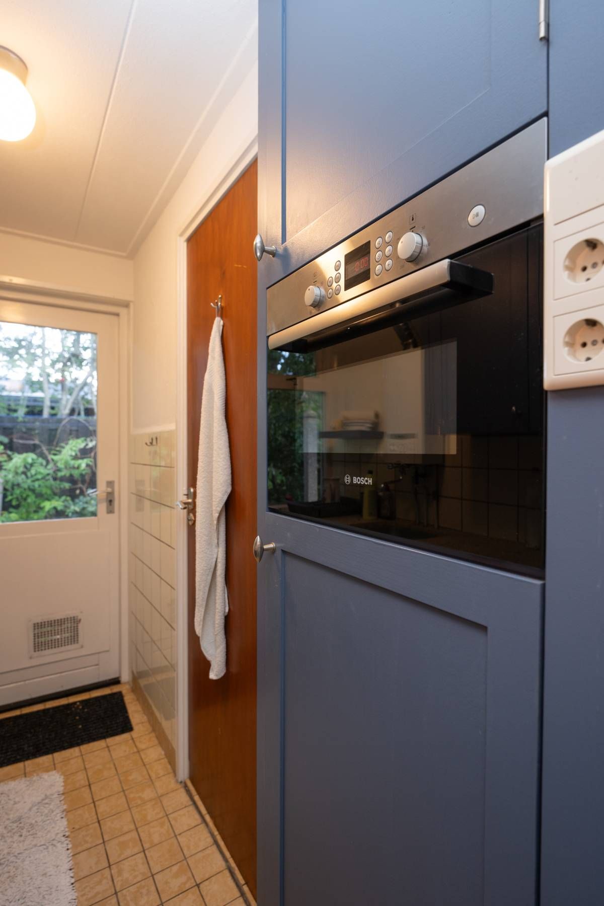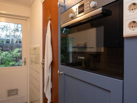Aansluitend vindt u de gesloten keuken. Deze is eenvoudig van opzet, maar netjes en functioneel ingericht. De keuken beschikt over een gaskookplaat, combi-oven, koelkast en een geiser voor het warm water.