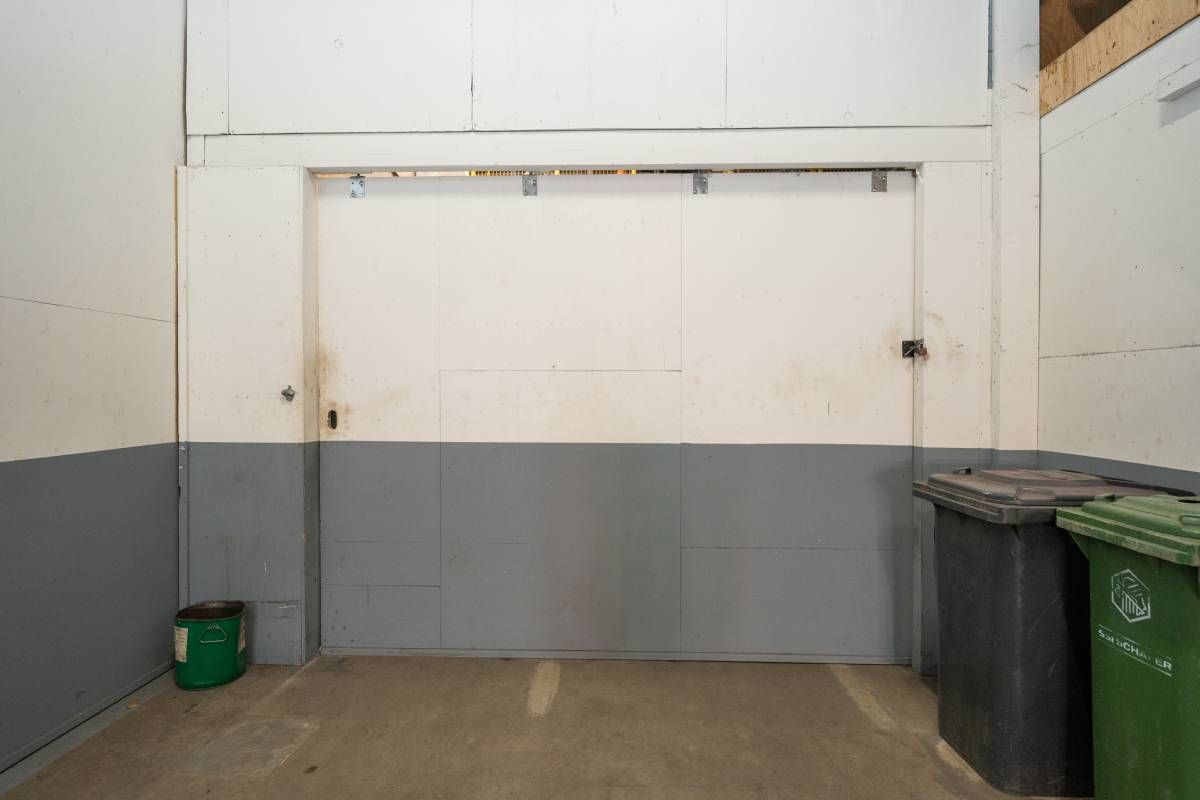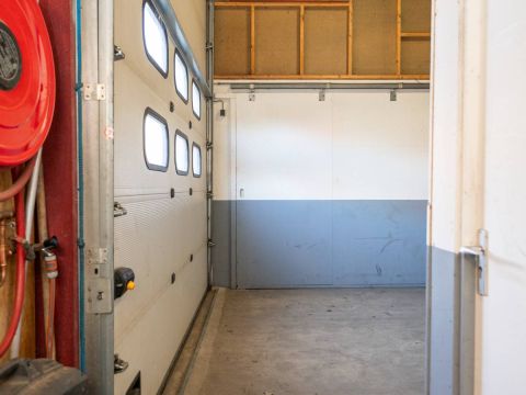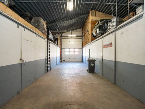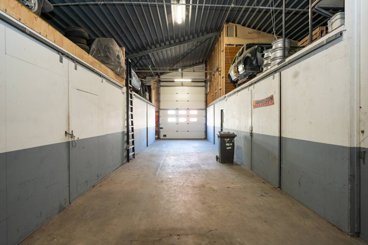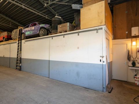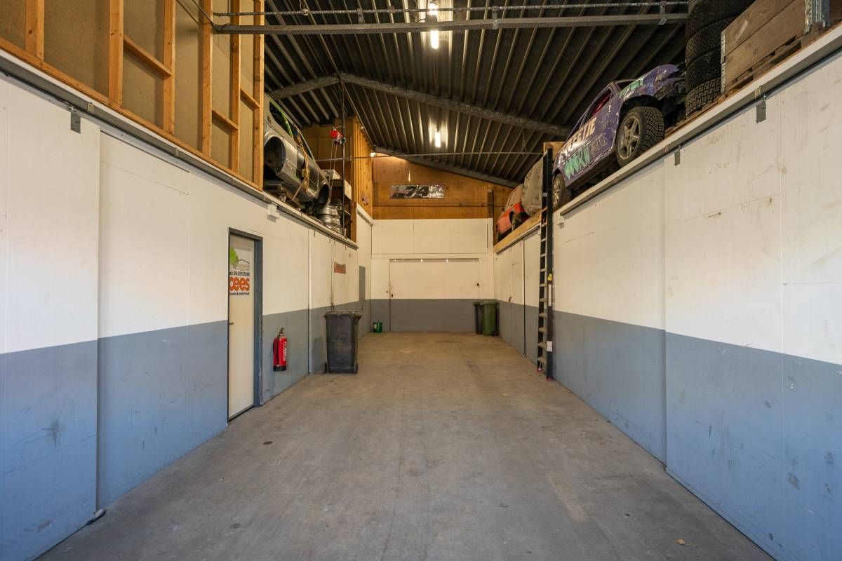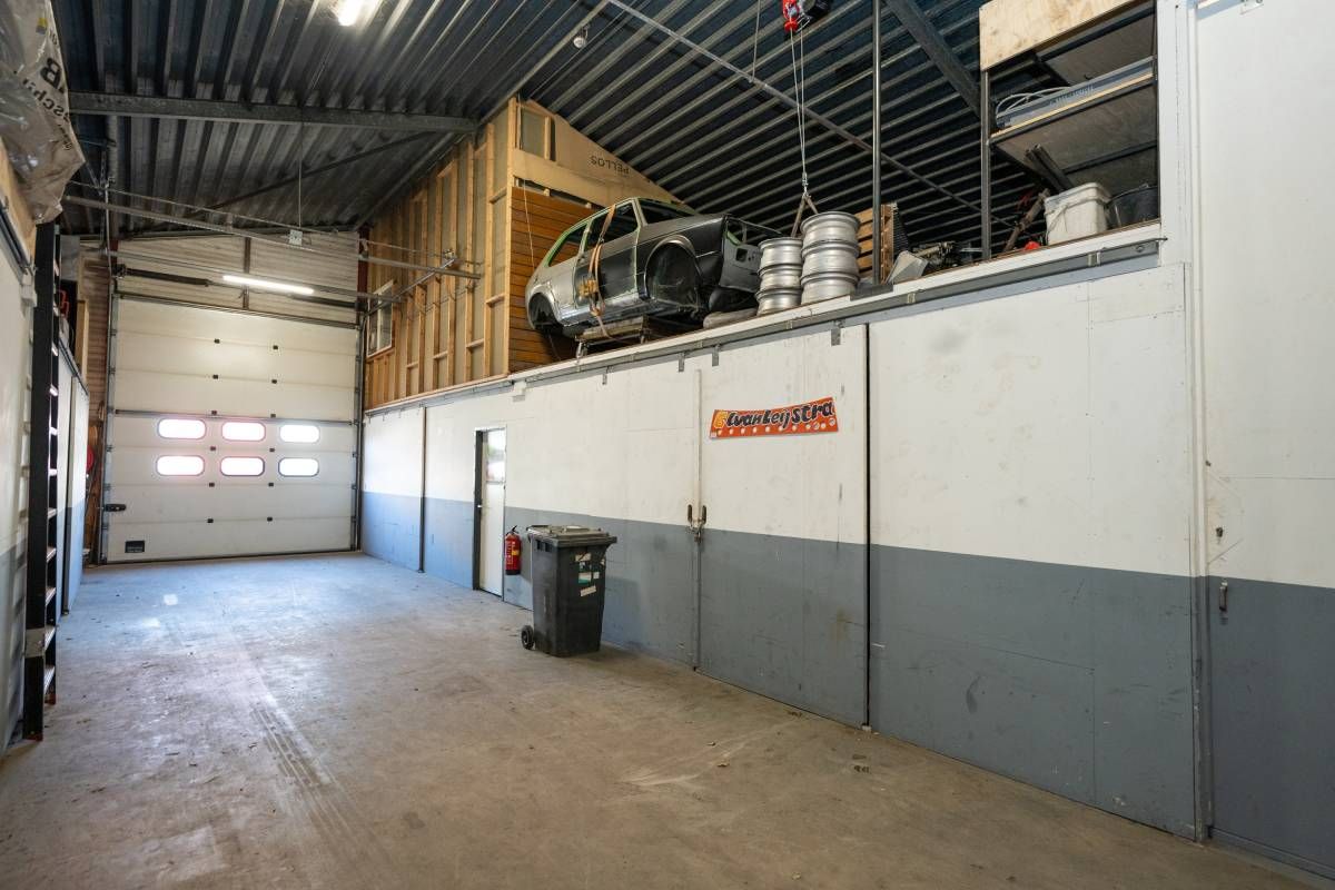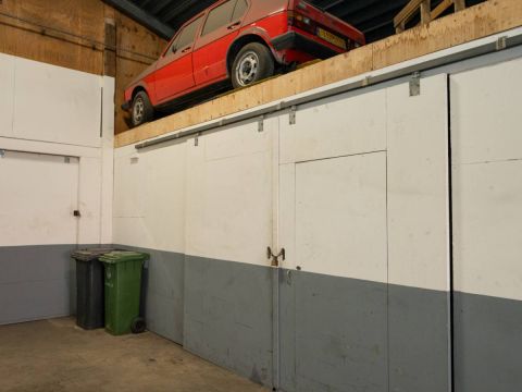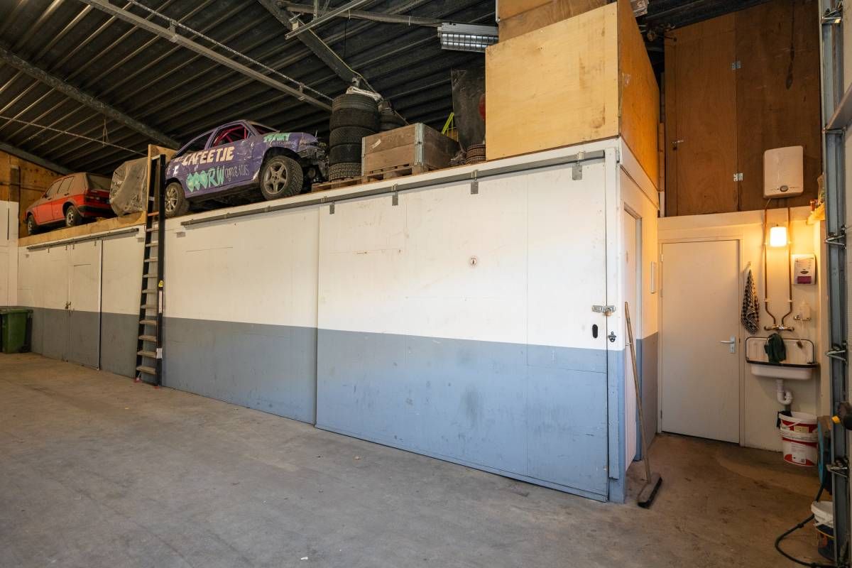 De brede roldeur en royale hoogte maken het object uitstekend geschikt voor opslag, werkplaats en stalling.