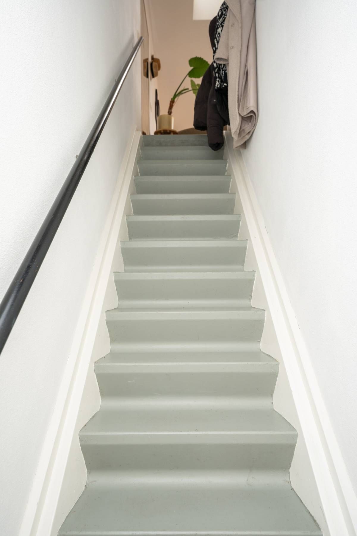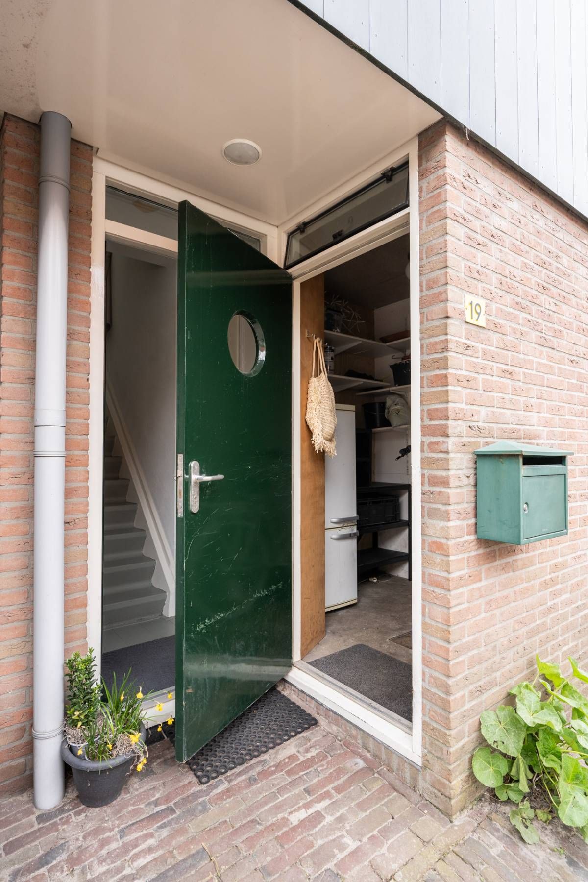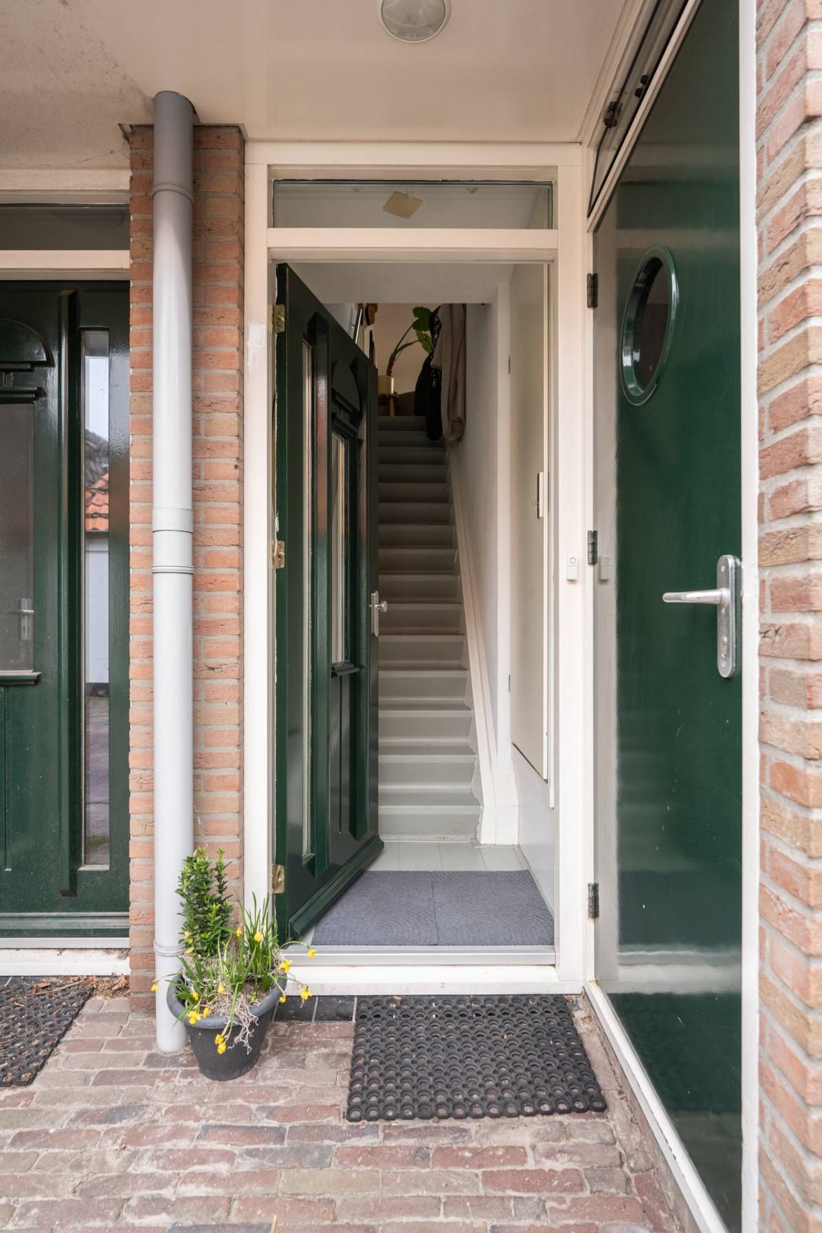 Entree aan de voorzijde van het pand met toegang tot de hal. Via de trap bereikt u het appartement op de eerste verdieping.