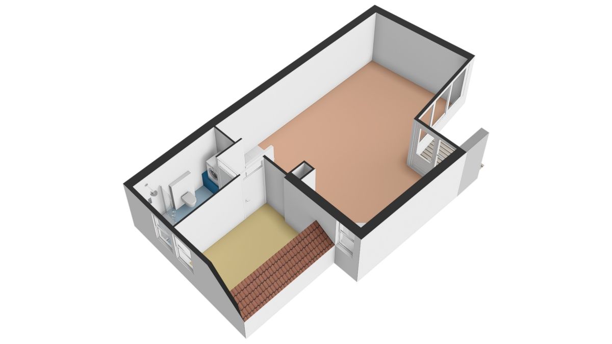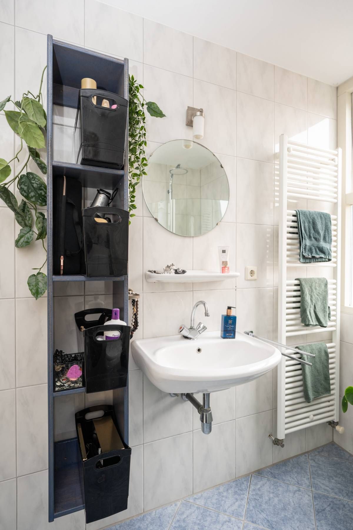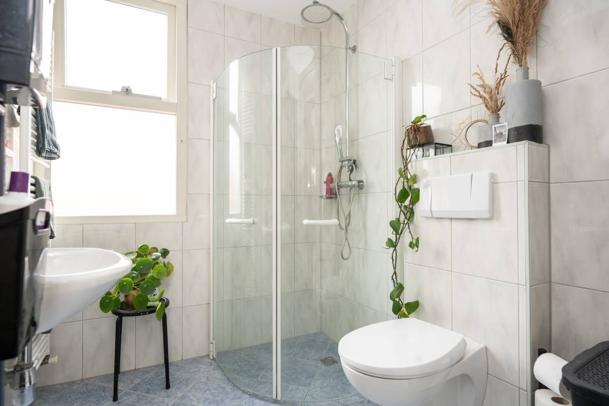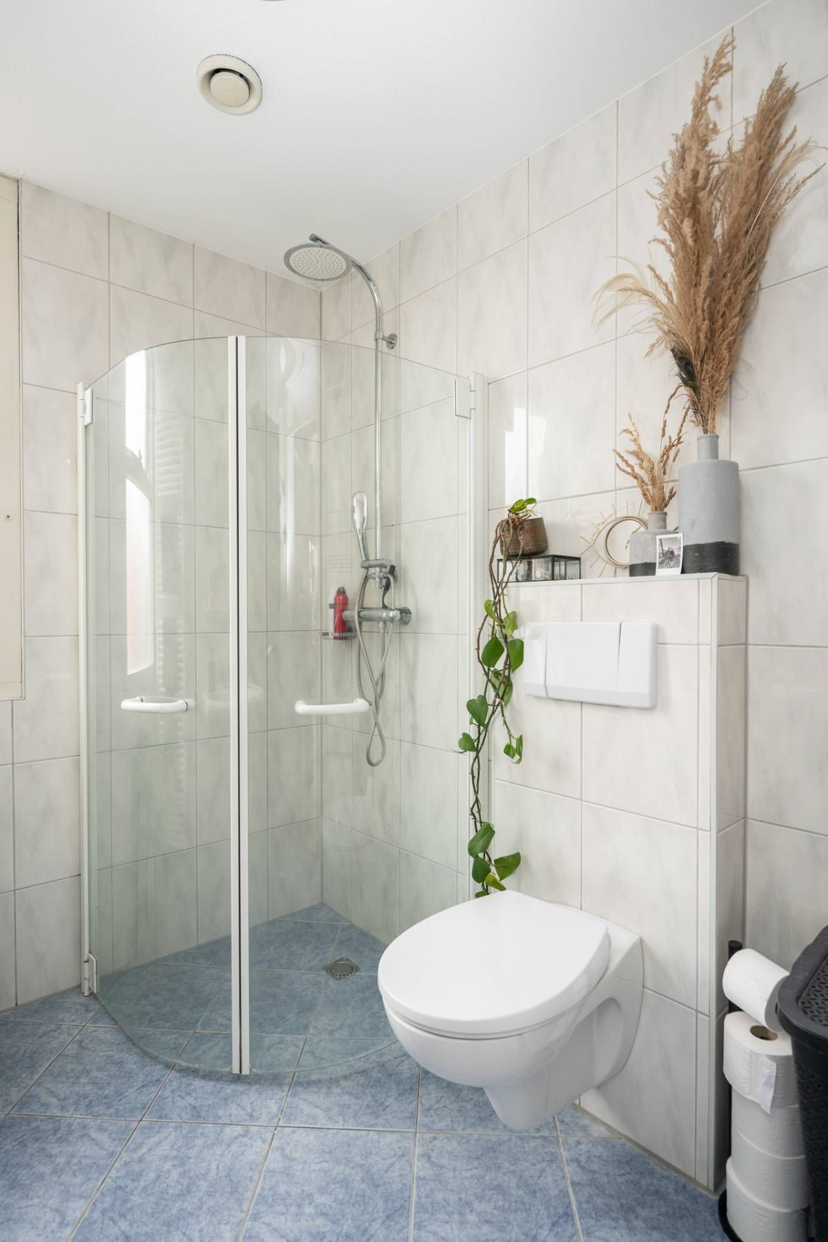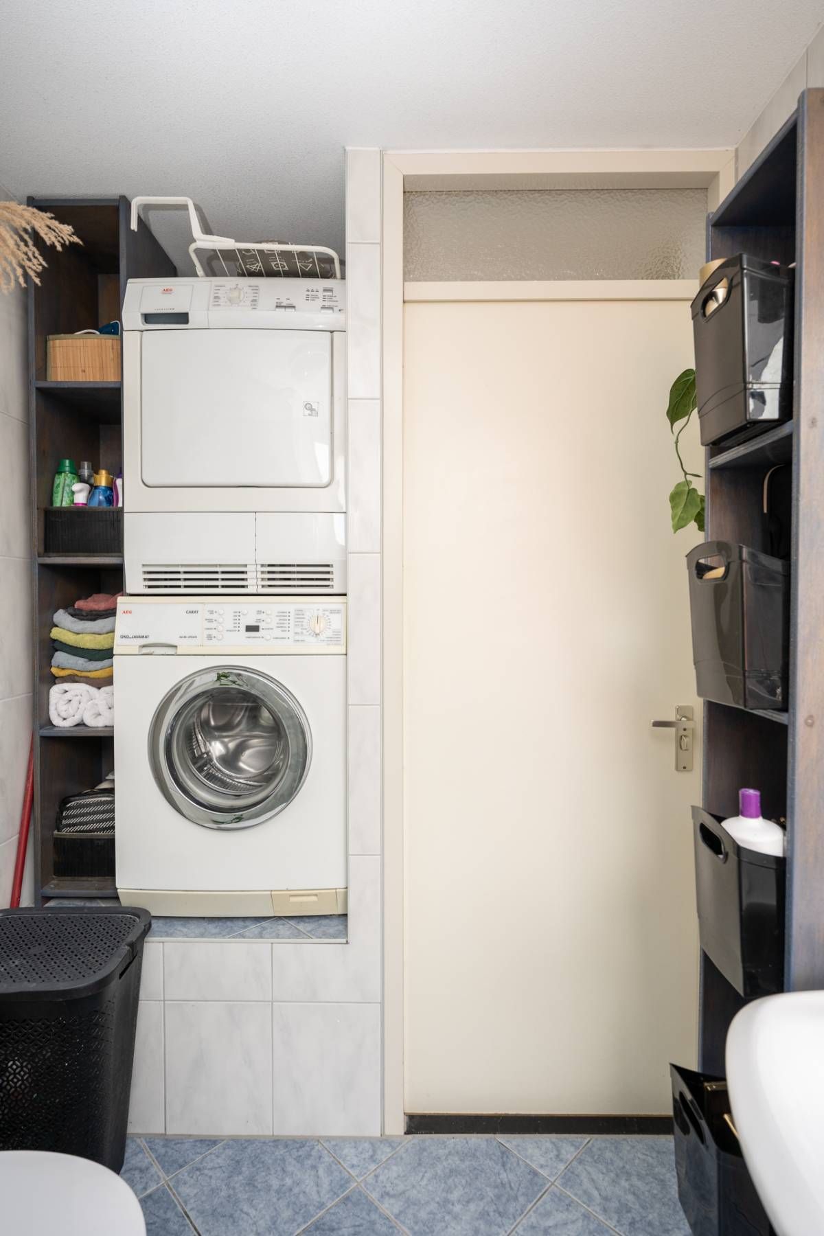 De badkamer is netjes en functioneel ingericht met een douche, wastafel en toilet. Daarnaast is er ruimte voor het plaatsen van een wasmachine en droger.