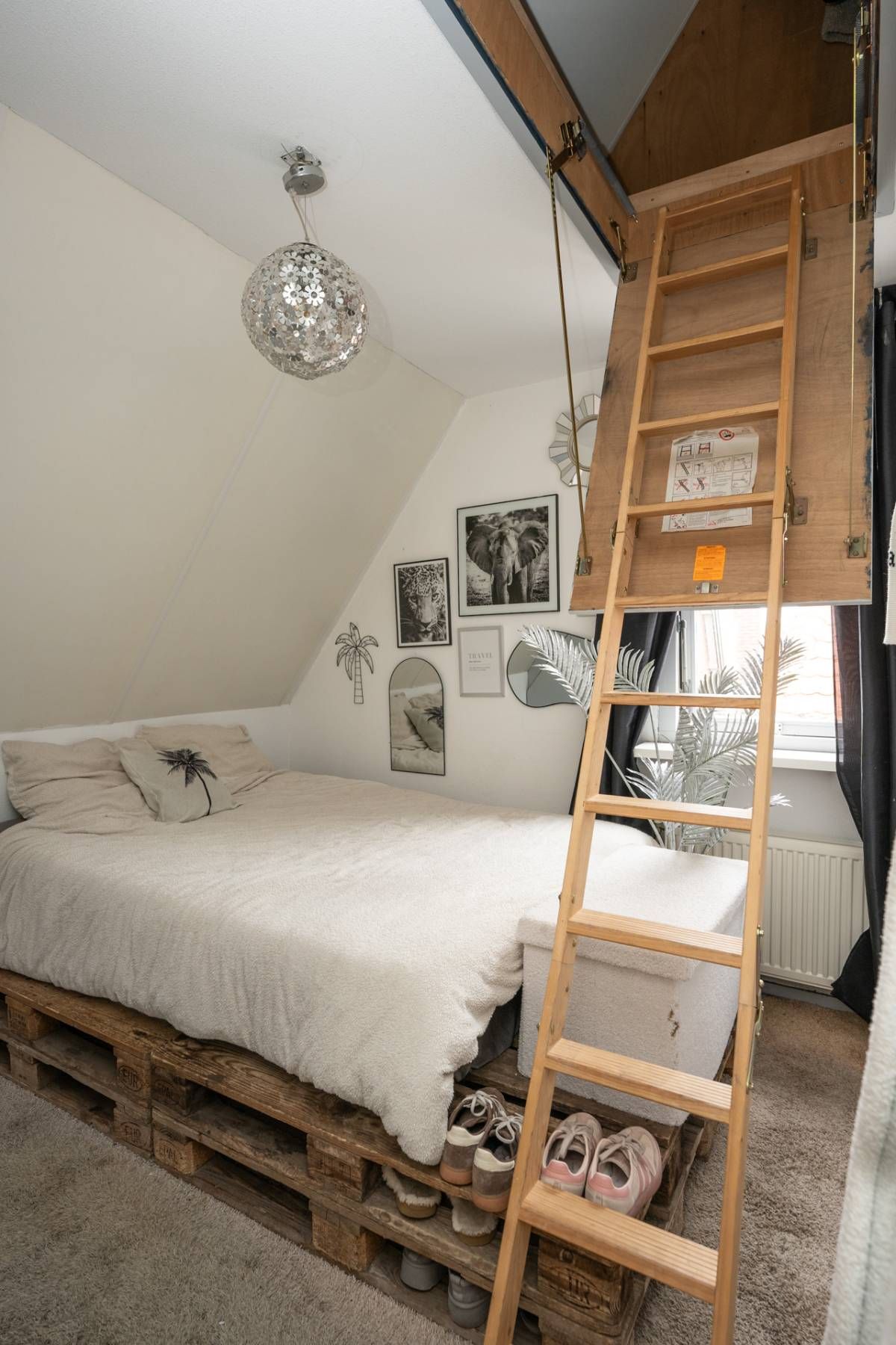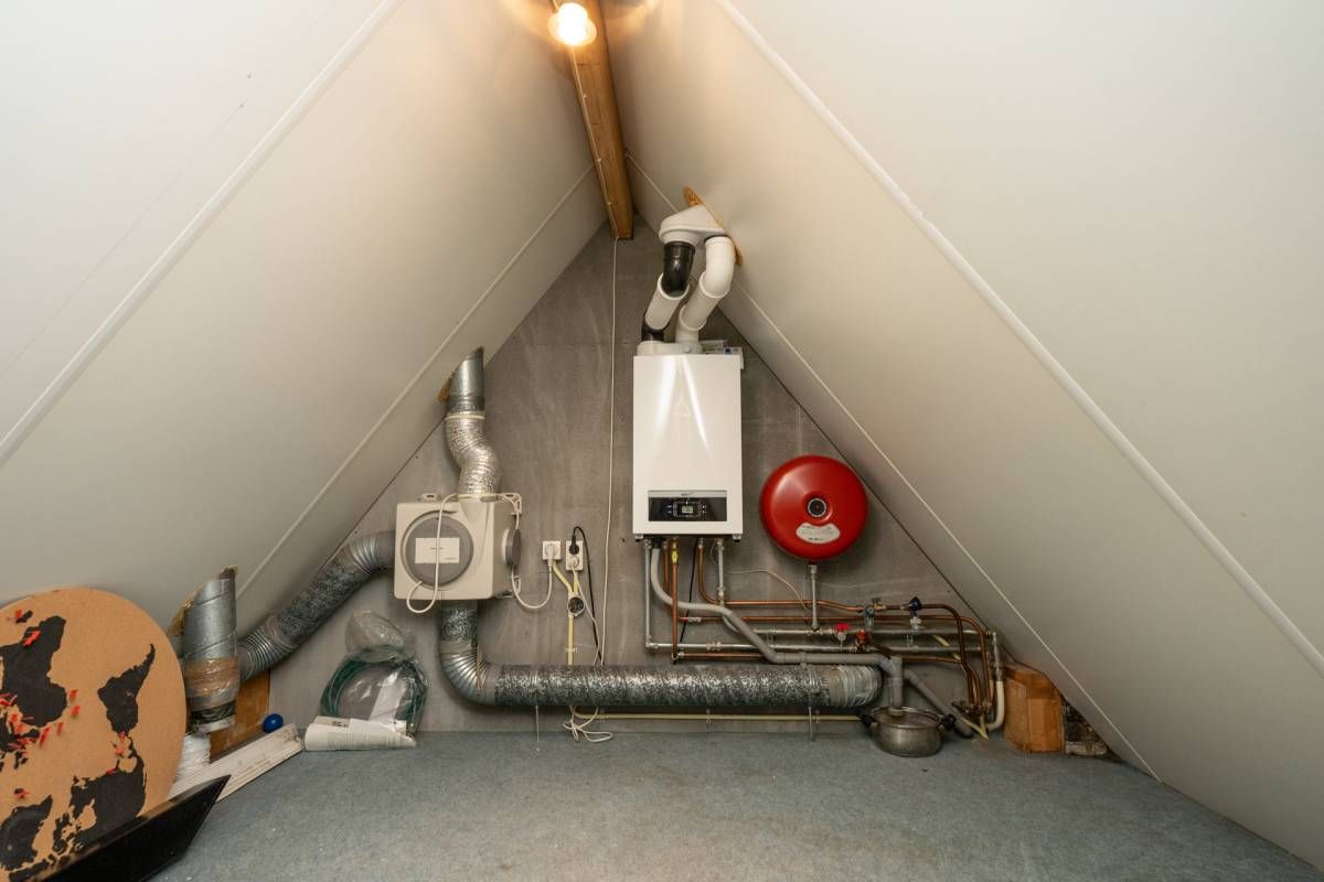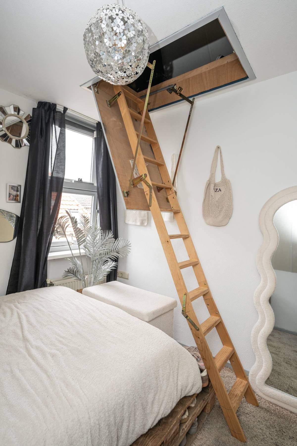 In de slaapkamer bevindt zich tevens een luik met vlizotrap naar de zolder. De zolder biedt extra bergruimte en hier bevinden zich de opstelplaats van de CV-ketel en de mechanische ventilatie.