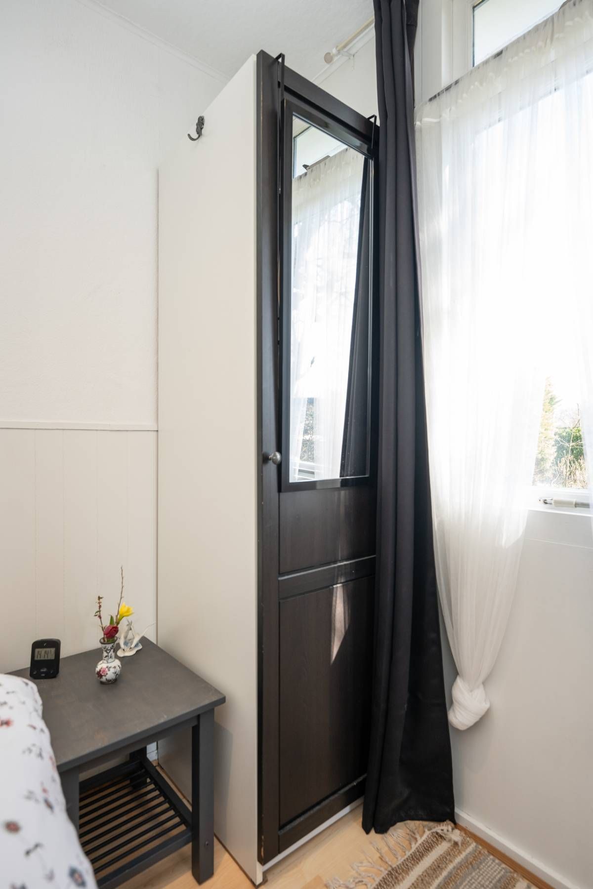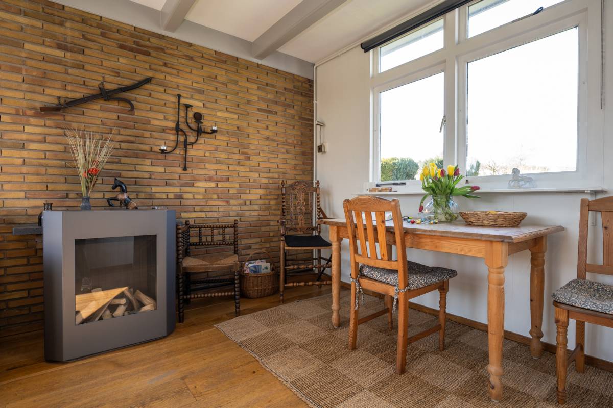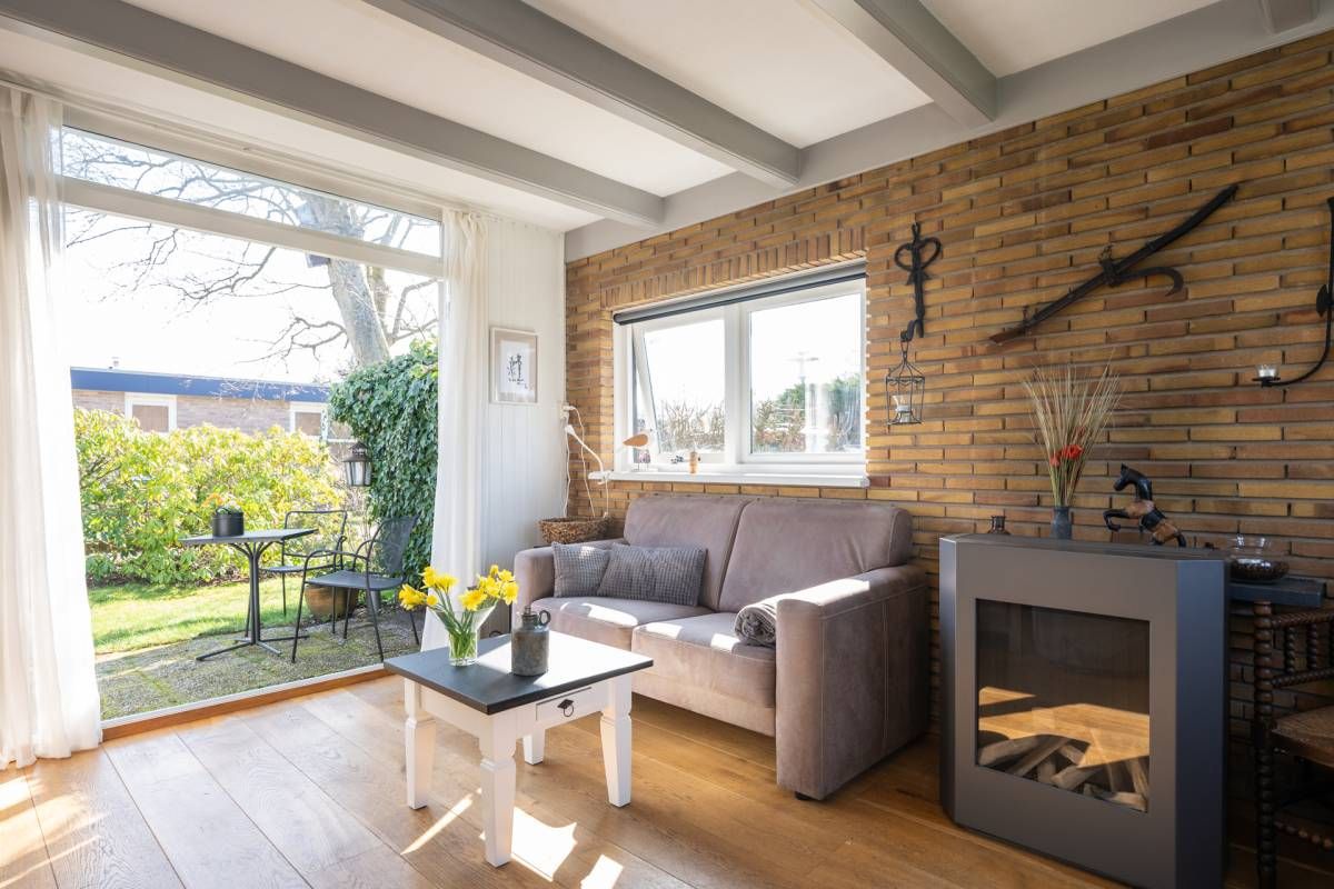 De openslaande deuren bieden een prachtig uitzicht op de tuin en zorgen er bij mooi weer voor dat binnen en buiten naadloos in elkaar overlopen.