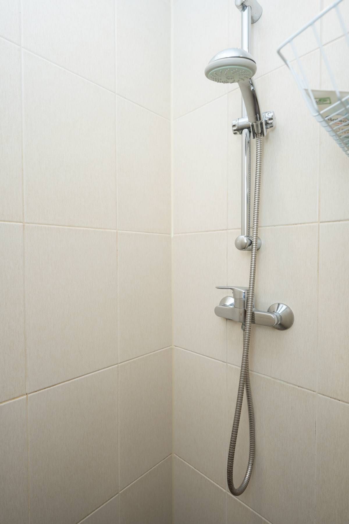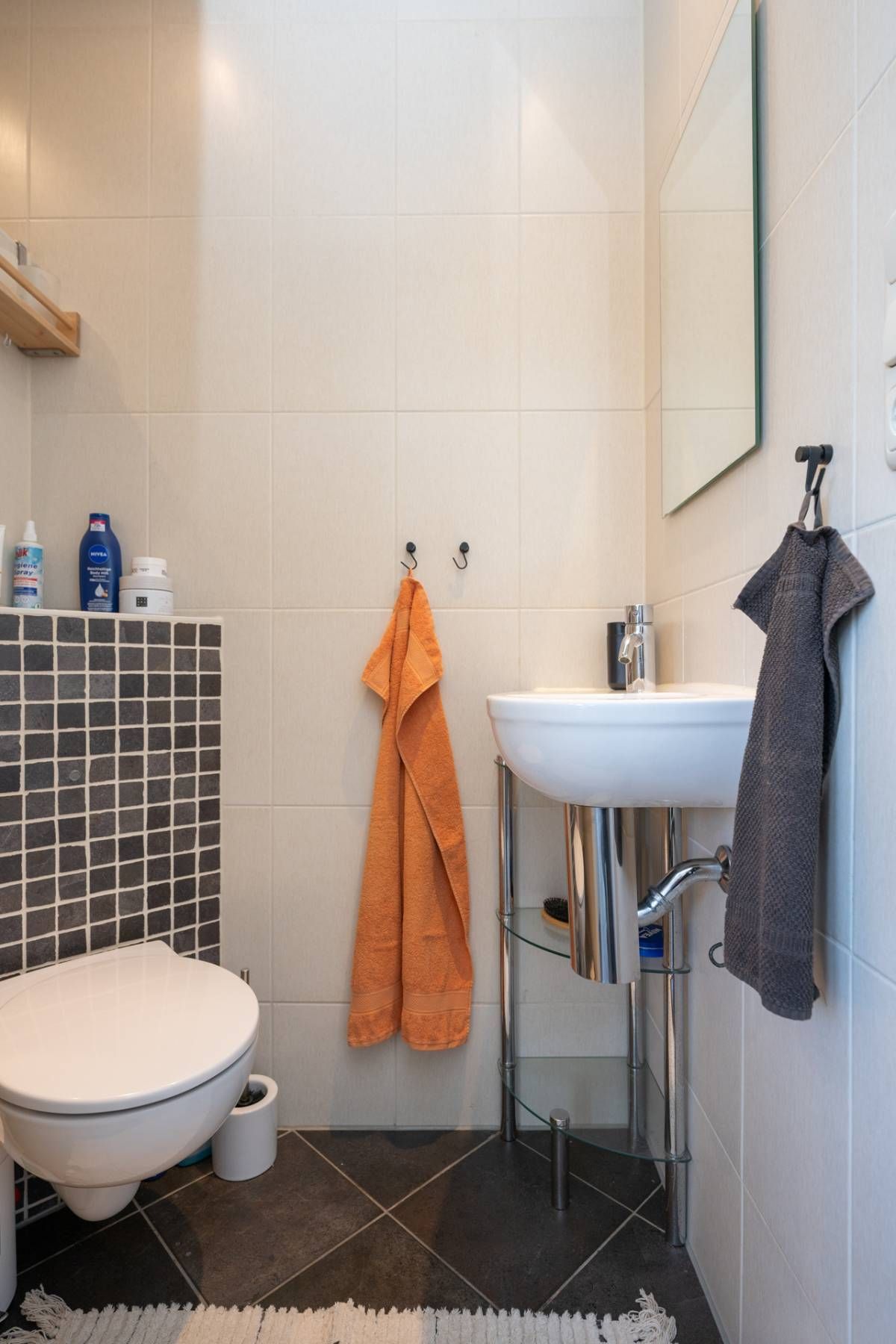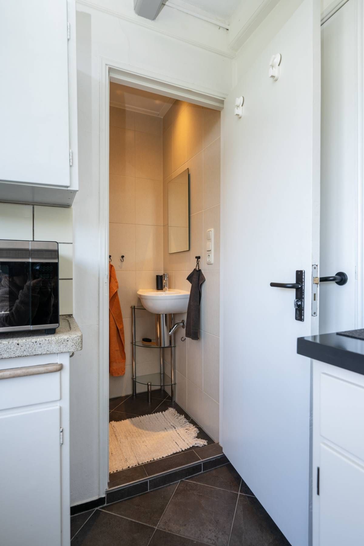 De nette, volledig betegelde badkamer bevindt zich achter de keuken en is uitgerust met een toilet, wastafel en douche.