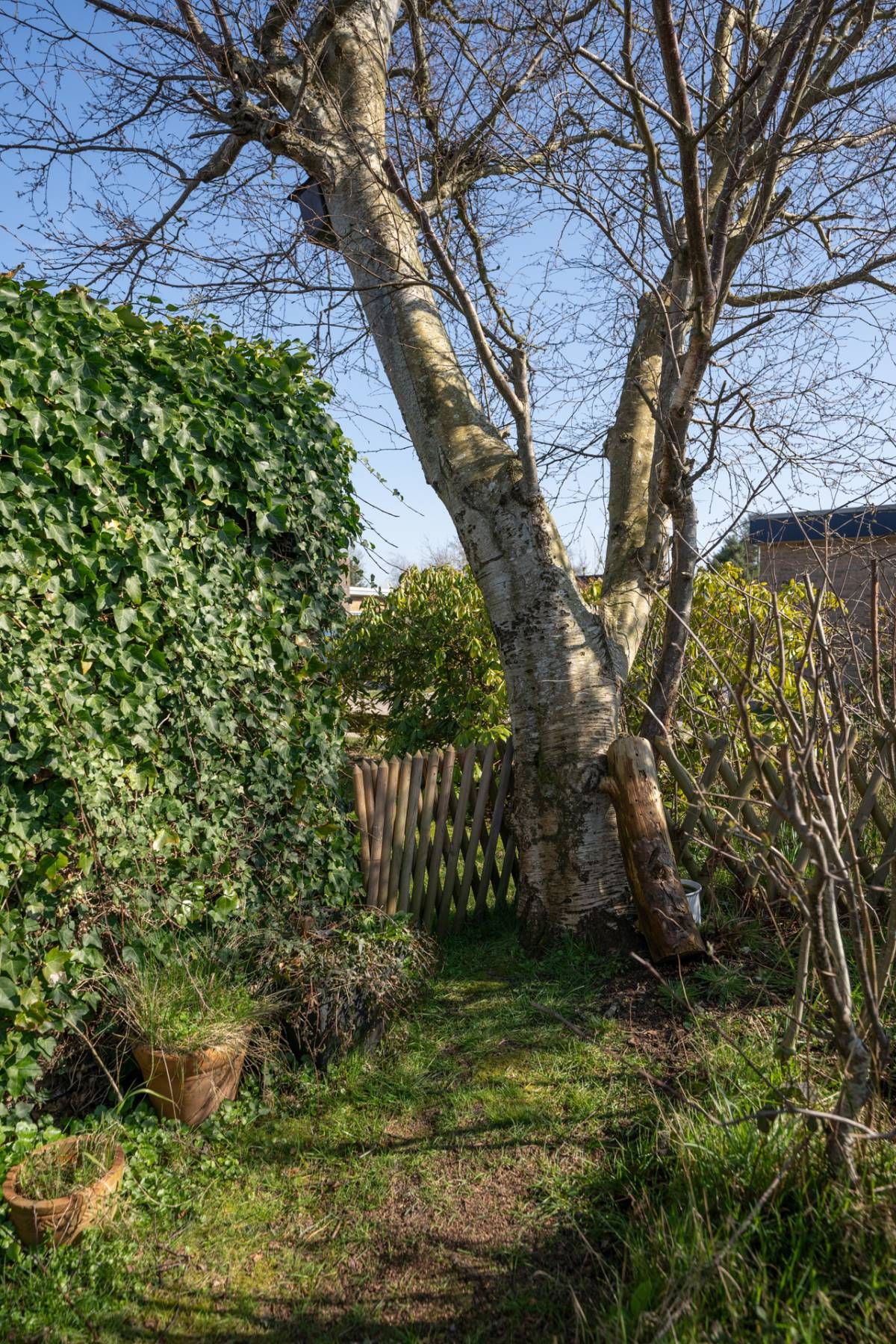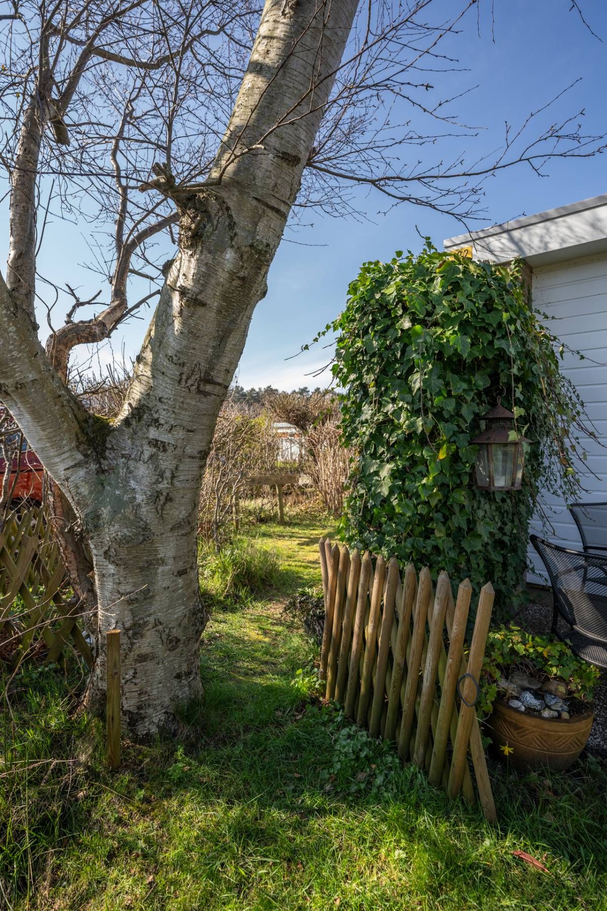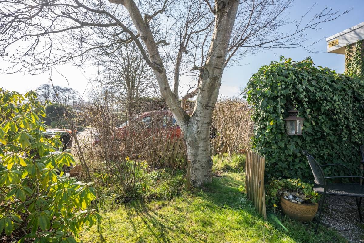 In de omsloten tuin bevindt zich een royale, afsluitbare houten schuur met afdak, ideaal voor het opbergen van tuinspullen en fietsen.