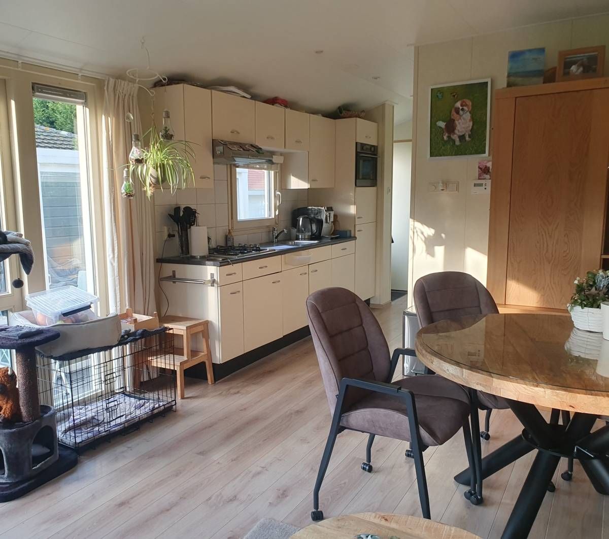 De entree geeft toegang tot de verzorgde keuken, uitgerust met een gasfornuis, afzuigkap, koelkast en combimagnetron. De keuken biedt daarnaast ruime opbergmogelijkheden.