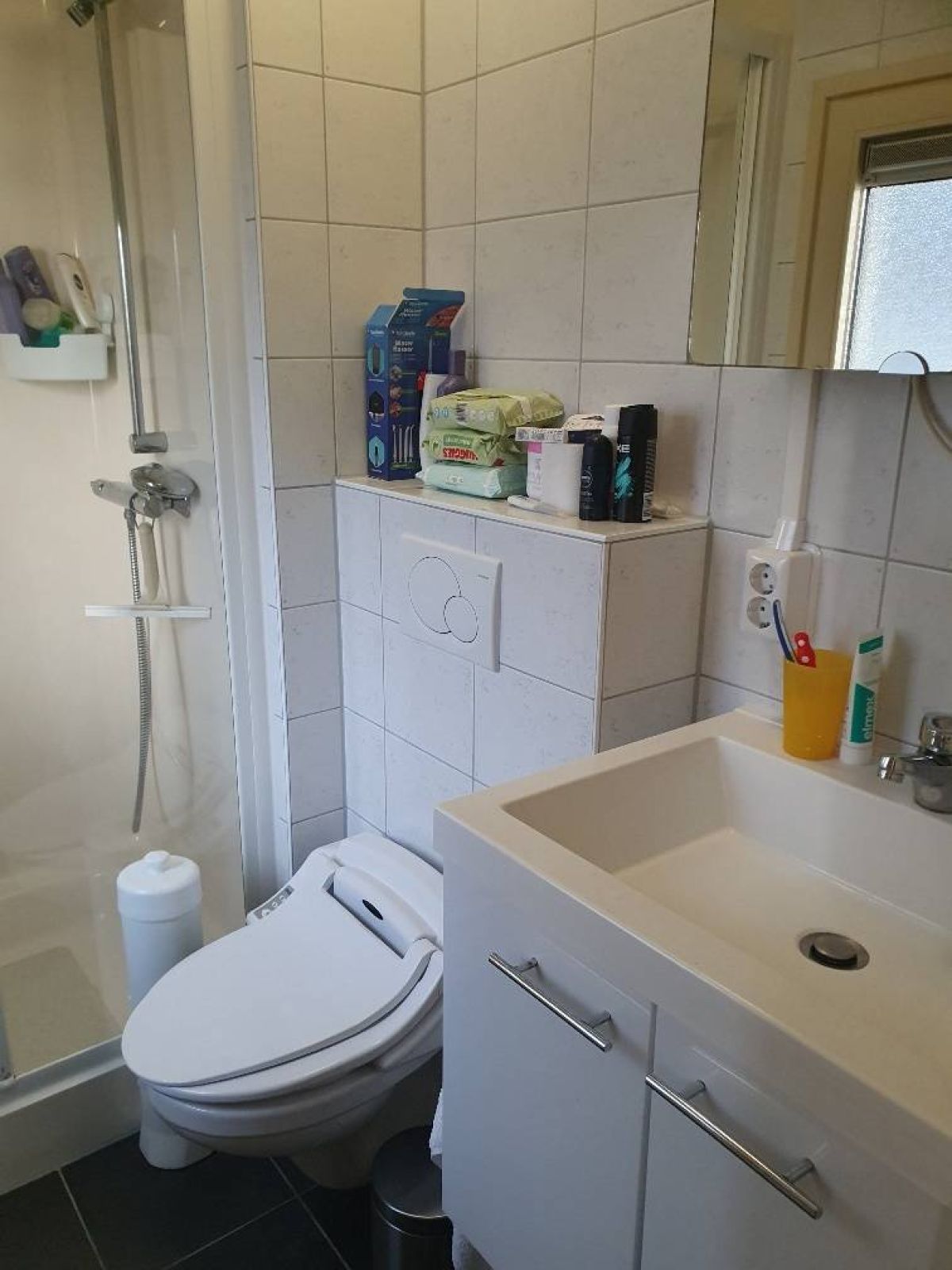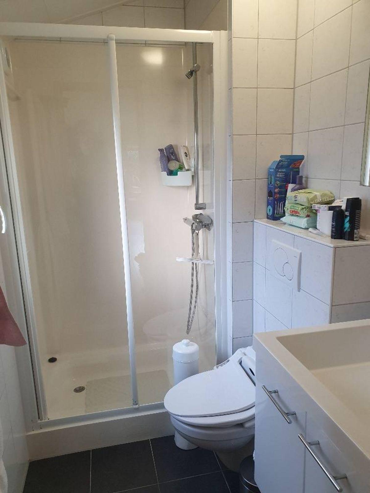 De badkamer is praktisch en comfortabel ingericht met een aparte douchecabine met schuifwand, een toilet en een wastafelmeubel. Het raam zorgt voor natuurlijke ventilatie en prettig daglicht.