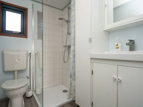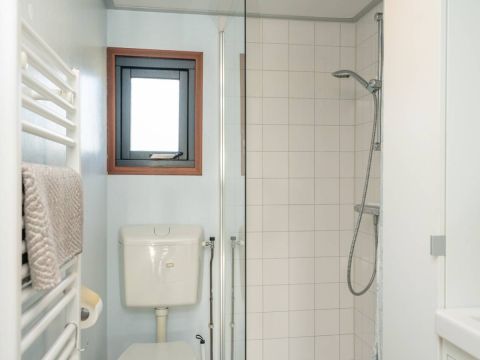 De badkamer is voorzien van een douche, toilet en een wastafelmeubel.