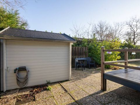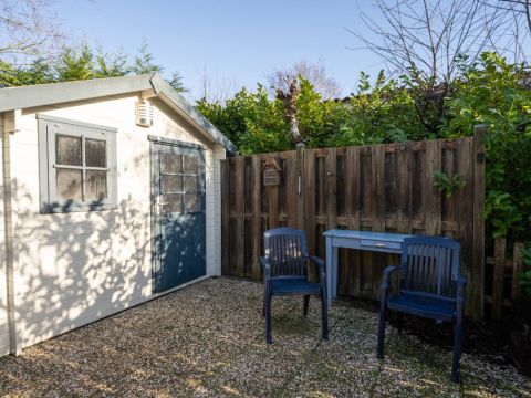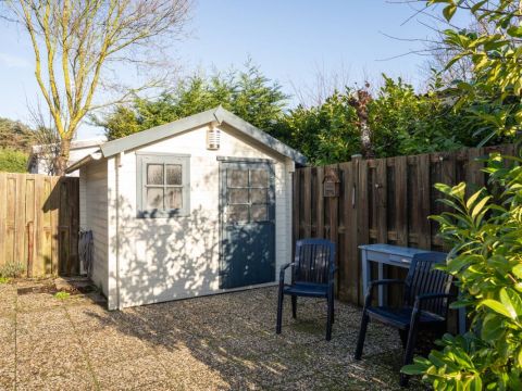 Daarnaast is er een vrijstaand houten tuinhuisje voor het opbergen van spullen en aansluitingen voor een wasmachine en/of droger.