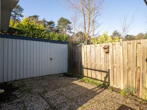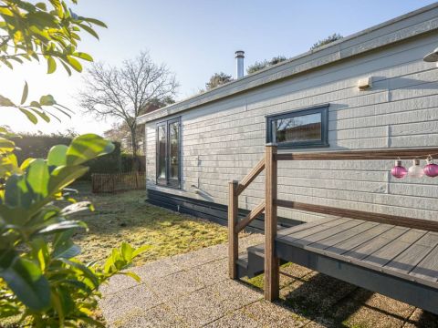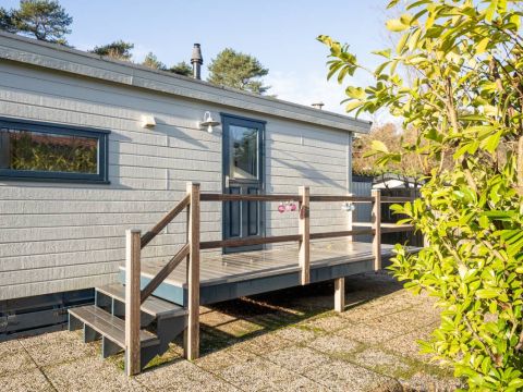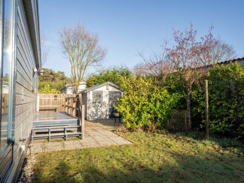 Tuin | Buiten ervaart u de rust en privacy die deze locatie zo bijzonder maken. Aan de zijkant van het chalet ligt een betegeld terras, perfect om van de zon te genieten of een goed boek te lezen. Rust & veel groen!