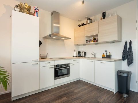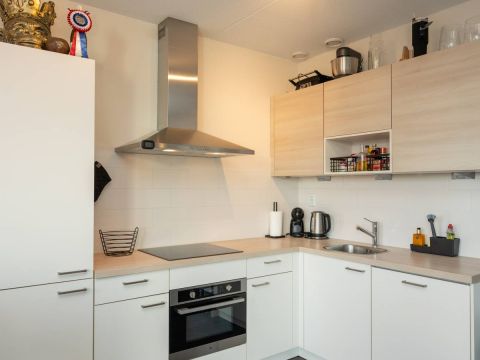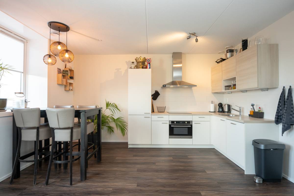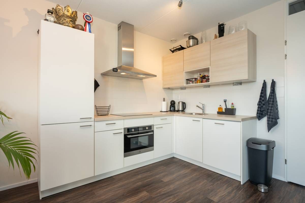 De open hoekkeuken is modern uitgerust met een inductiekookplaat, schouwafzuigkap, oven, koel-/vriescombinatie en een vaatwasser.
