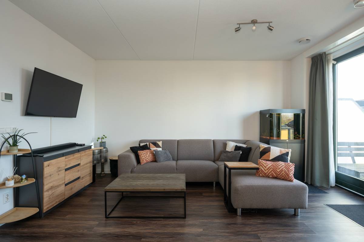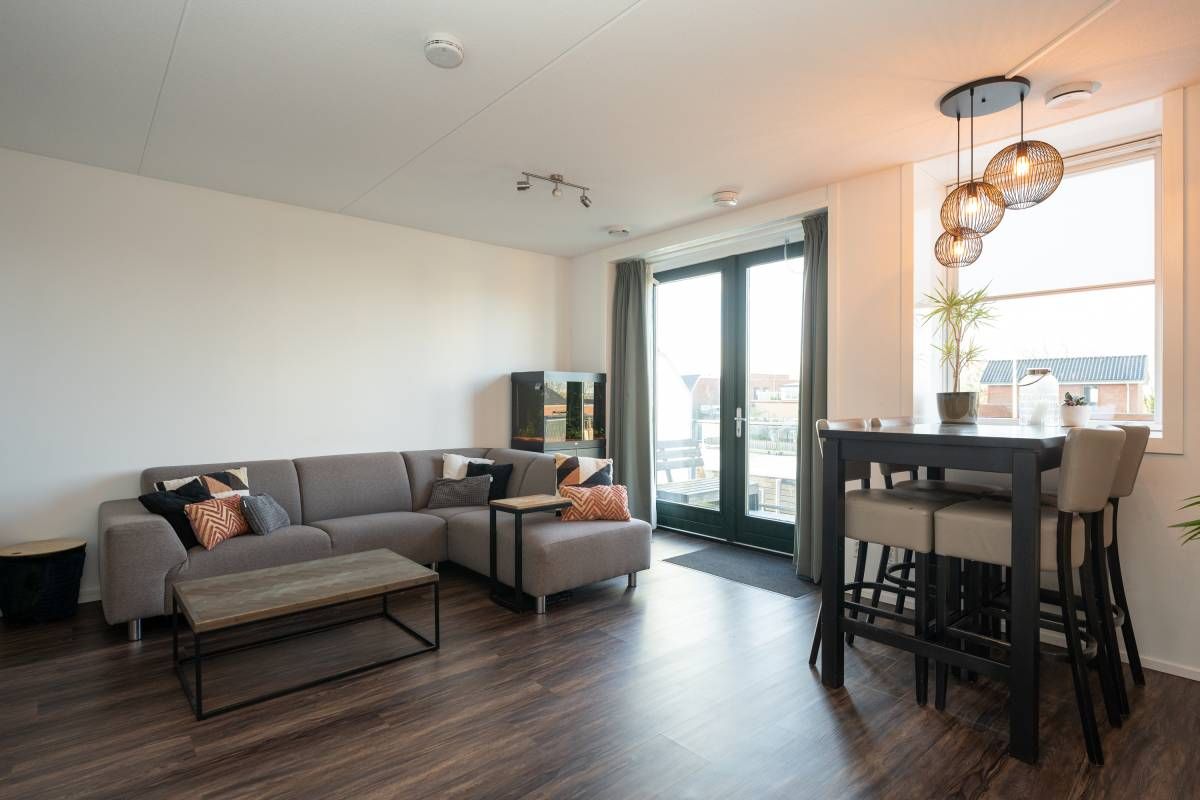 De stijlvol ingerichte woonkamer voelt licht en uitnodigend aan en geeft via openslaande deuren toegang tot het knusse terras met zicht op het parkeerterrein.