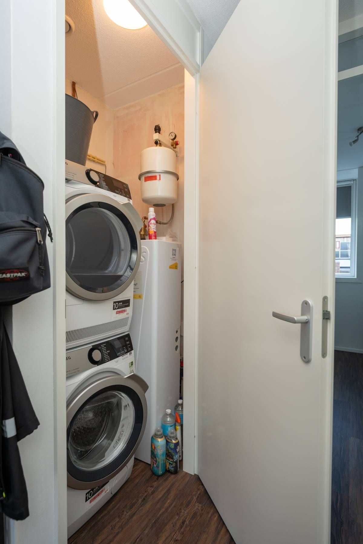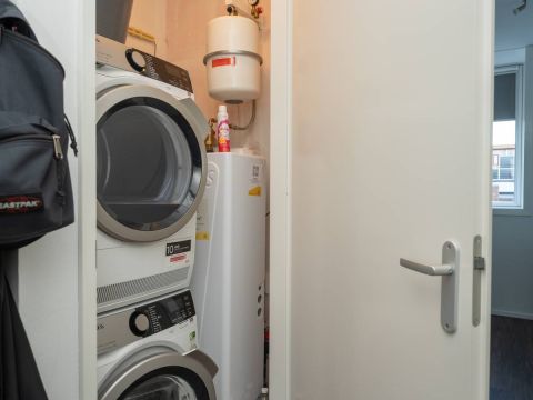 In de hal bevinden zich het toilet en een praktische ruimte met aansluitingen voor de wasmachine, droger en de warmtepomp.