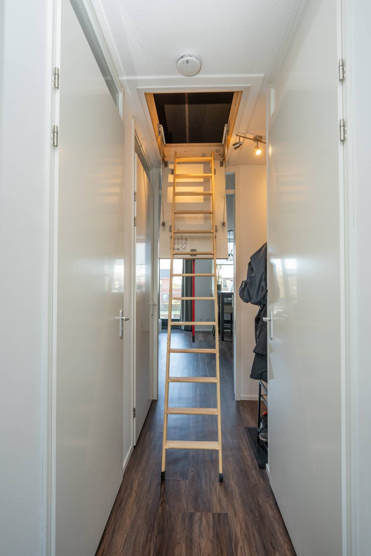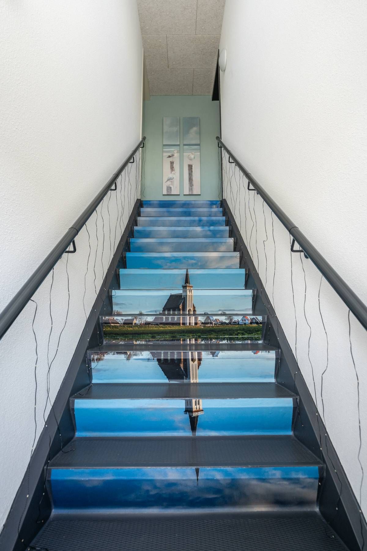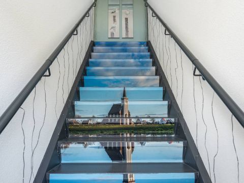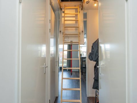 De trap, verfraaid met creatieve afbeeldingen, brengt je naar een stijlvol afgewerkt appartement met een doorlopende pvc-vloer in warme bruintinten. Deze gehele etage is voorzien van vloerverwarming.