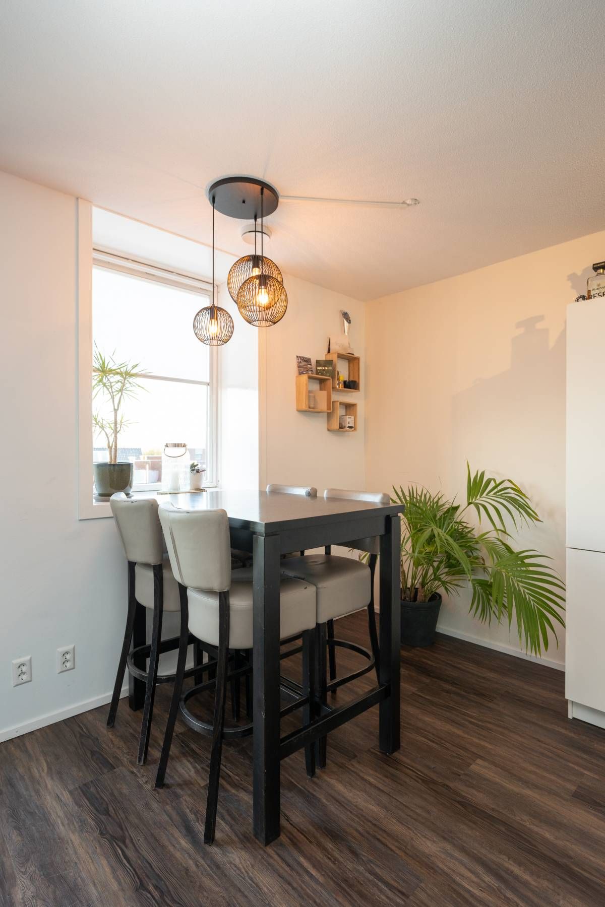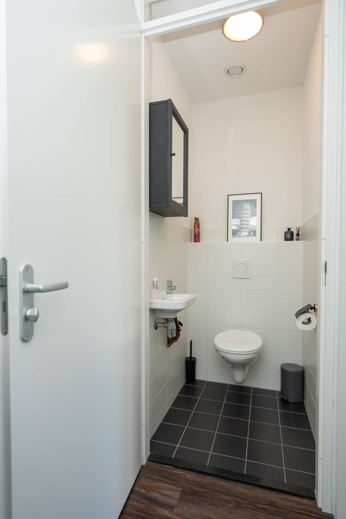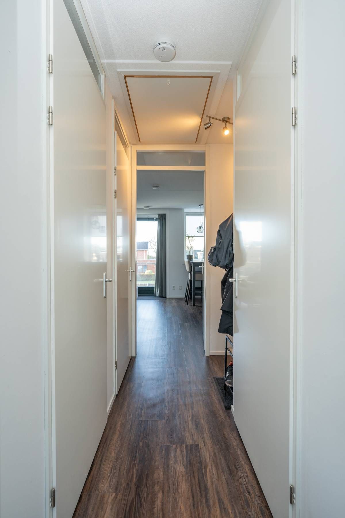 De trap, verfraaid met creatieve afbeeldingen, brengt je naar een stijlvol afgewerkt appartement met een doorlopende pvc-vloer in warme bruintinten. Deze gehele etage is voorzien van vloerverwarming.