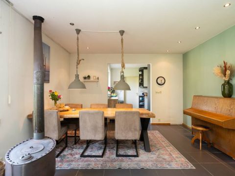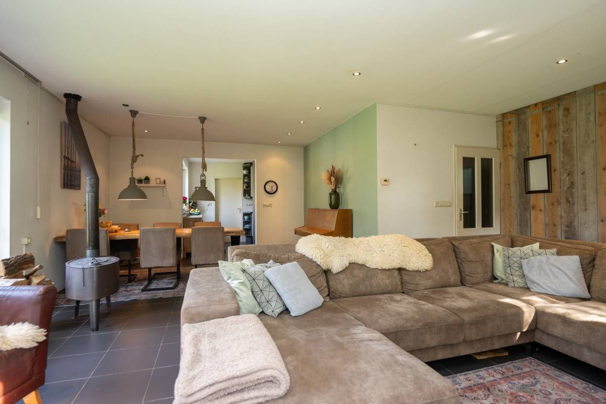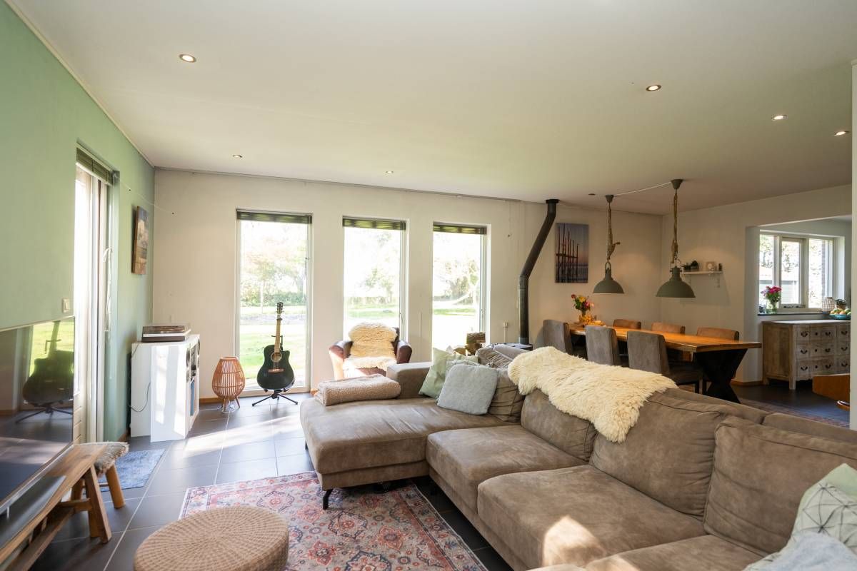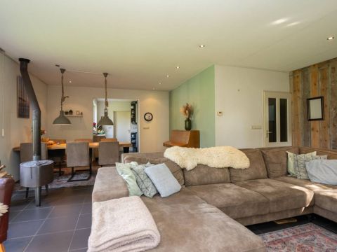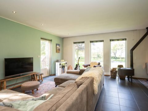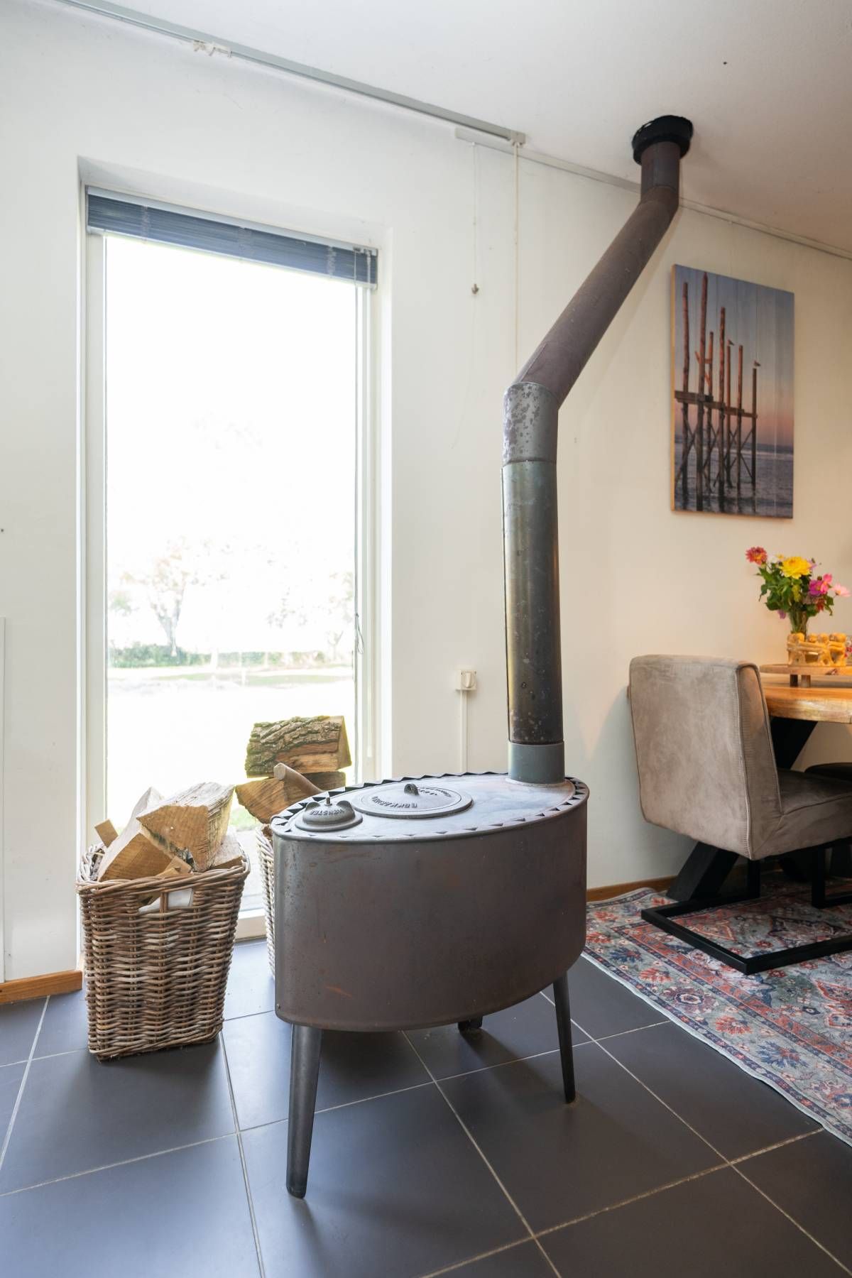 Bij binnenkomst valt direct de lichte en ruime woonkamer op, waar grote raampartijen zorgen voor een overvloed aan daglicht en een schitterend uitzicht over de groene achtertuin. De ruimte ademt gezelligheid, mede dankzij de sfeervolle houtkachel.