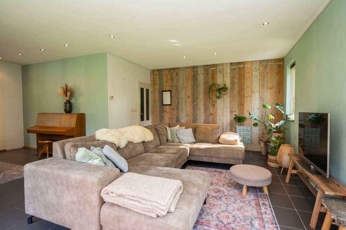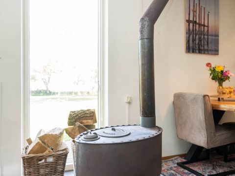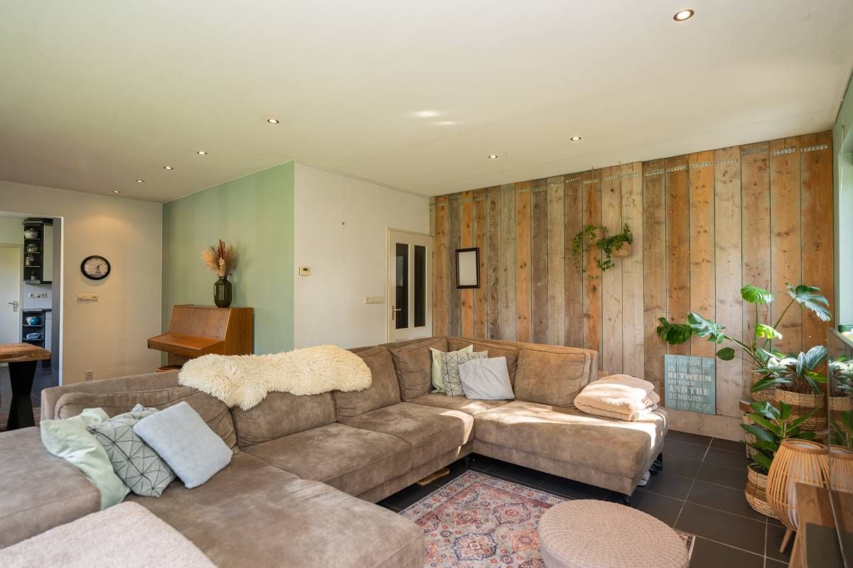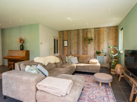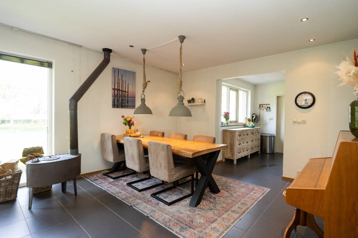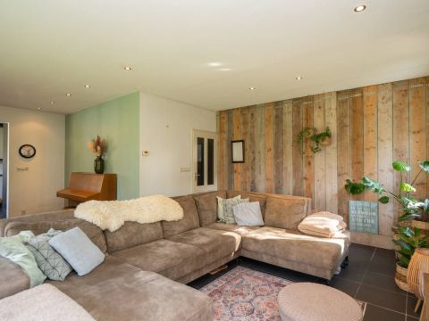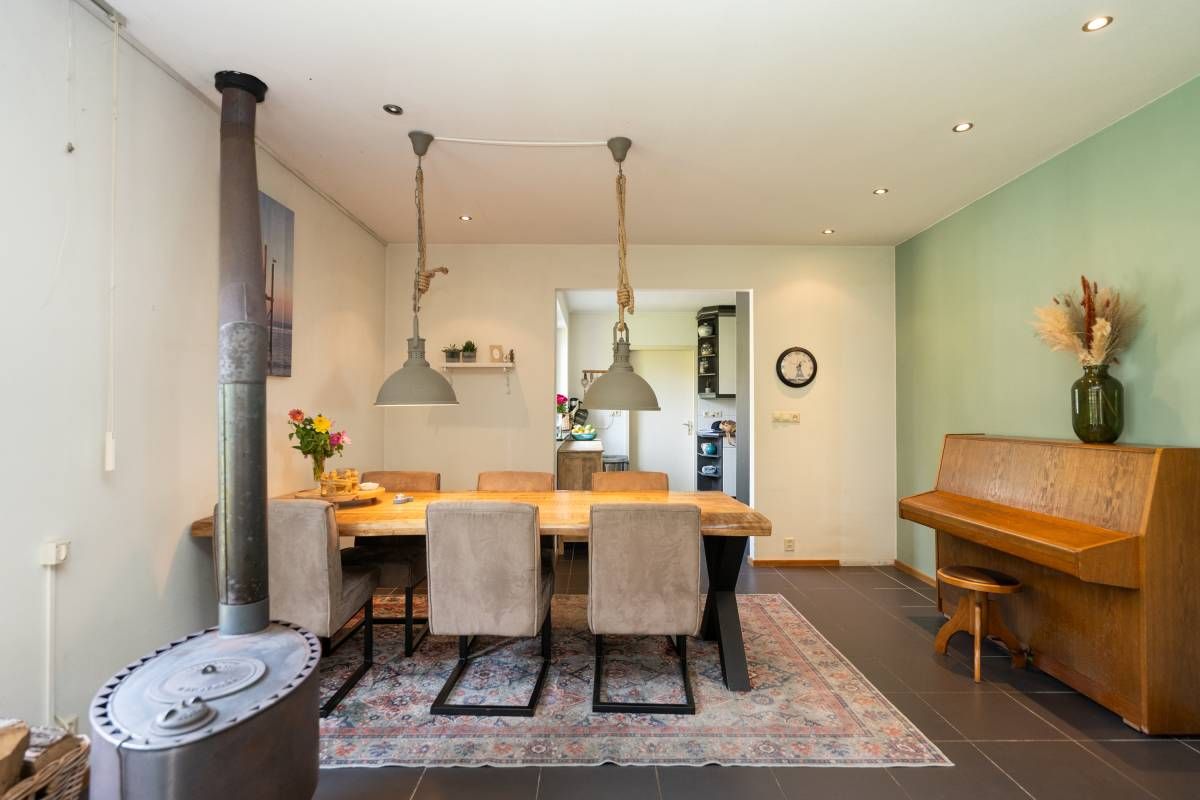 Bij binnenkomst valt direct de lichte en ruime woonkamer op, waar grote raampartijen zorgen voor een overvloed aan daglicht en een schitterend uitzicht over de groene achtertuin. De ruimte ademt gezelligheid, mede dankzij de sfeervolle houtkachel.