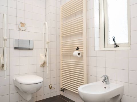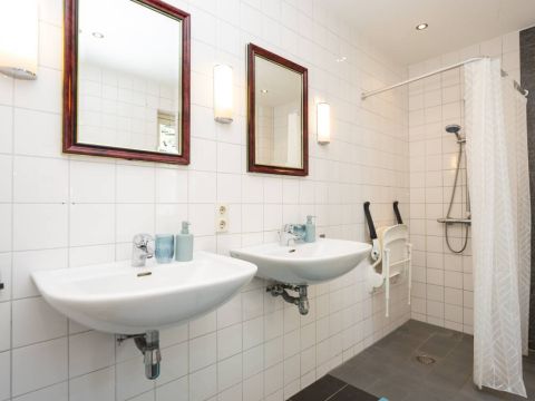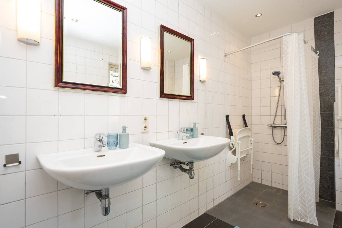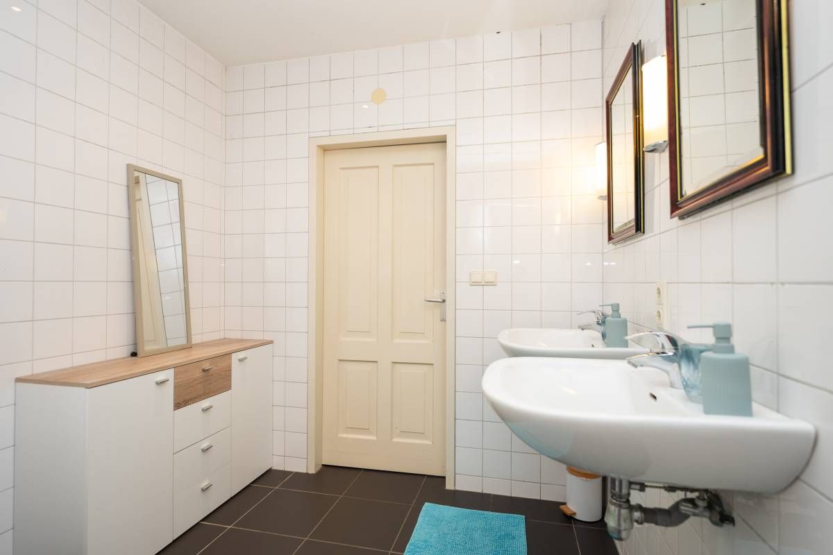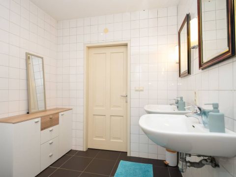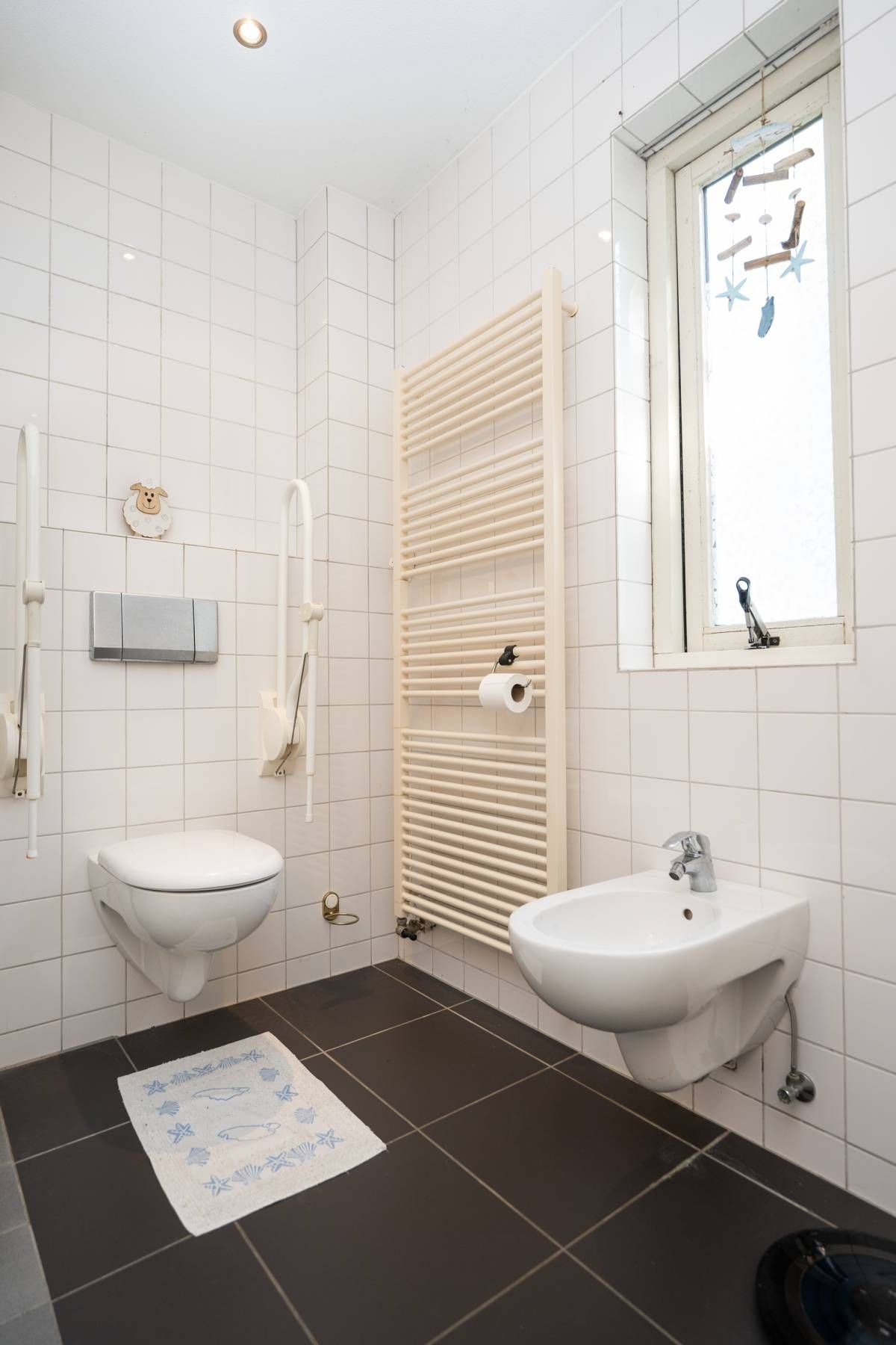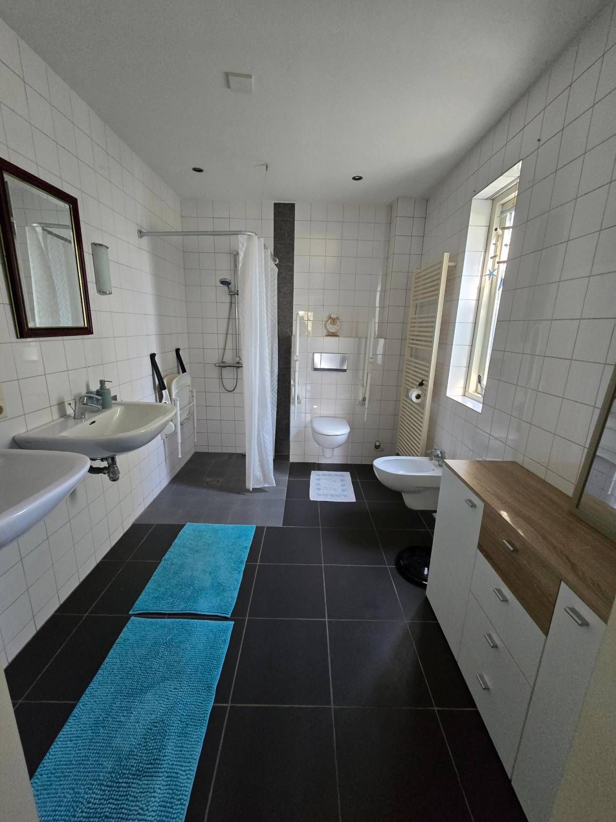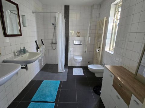 De badkamer is verrassend ruim en comfortabel ingericht, voorzien van een inloopdouche, toilet, bidet en twee wastafels. De badkamer is praktisch ingericht, met voldoende bewegingsvrijheid en natuurlijk daglicht.