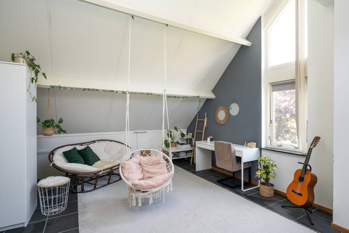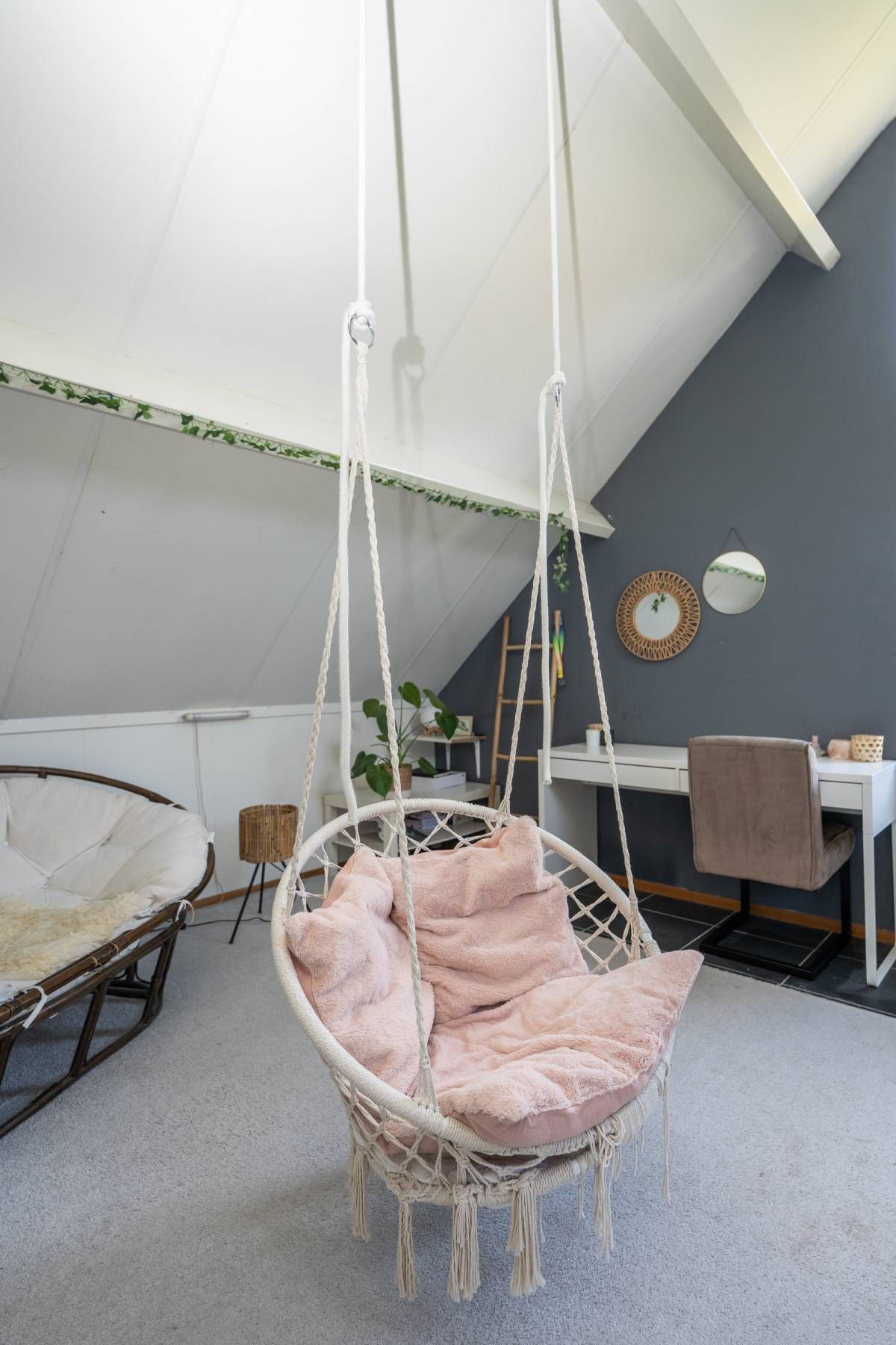 Op de verdieping geeft de overloop toegang tot twee ruime slaapkamers, waarvan één uitzonderlijk royaal is. Deze kamer beschikt over een pantry, bergruimte en elektrische rolgordijnen, en is tot in de nok open, wat een prachtig ruimtelijk effect geeft.