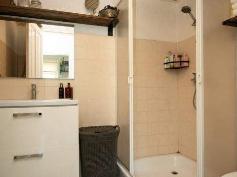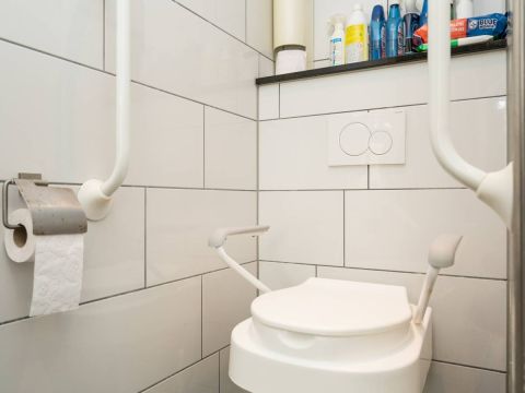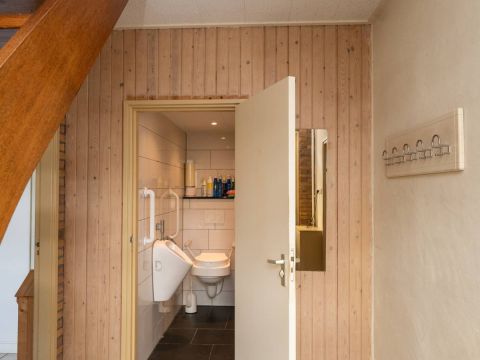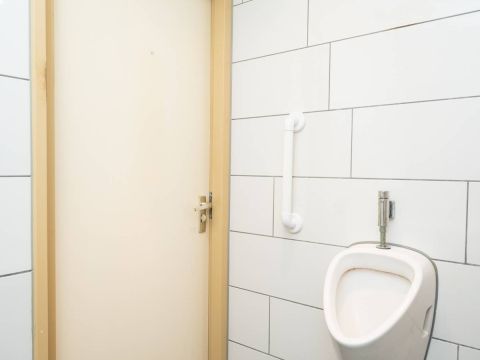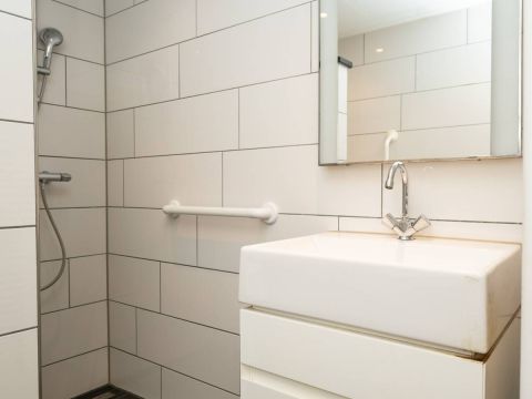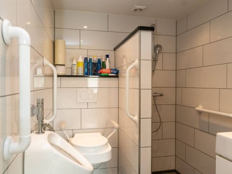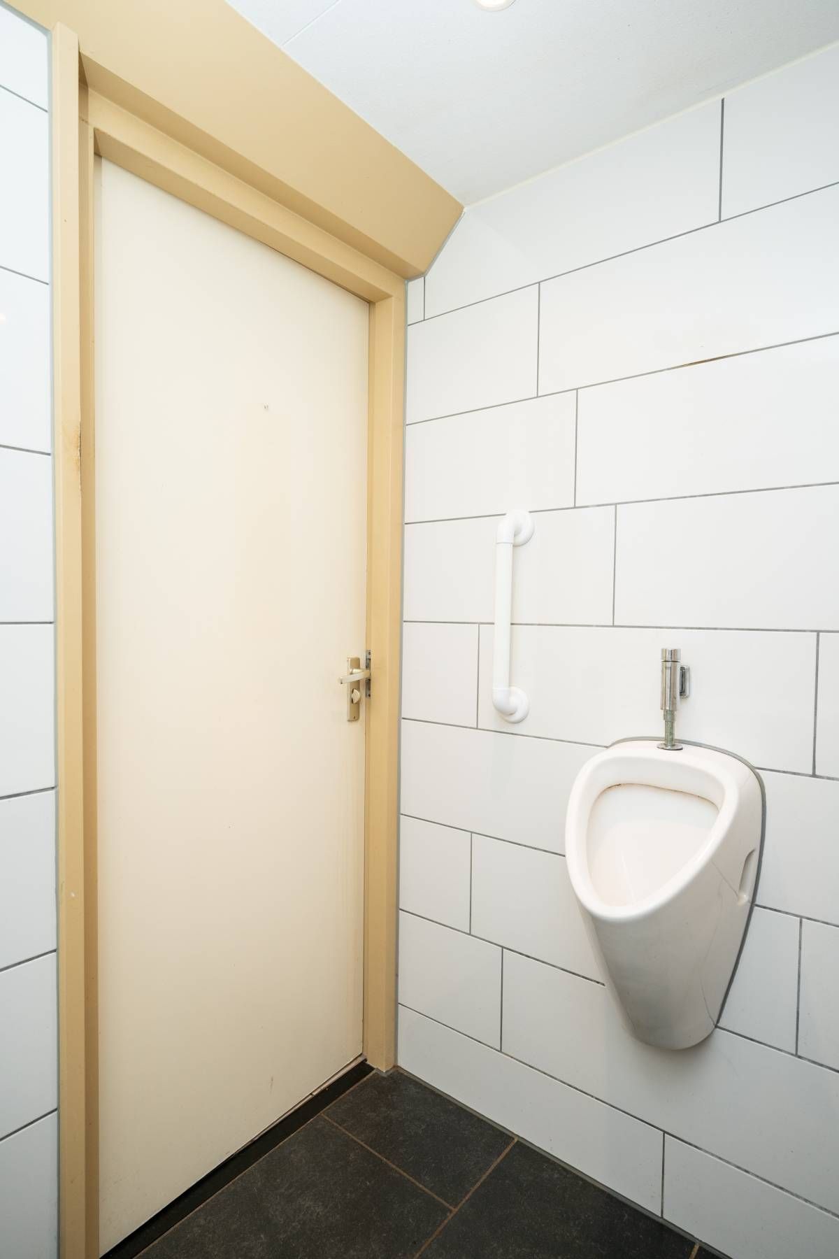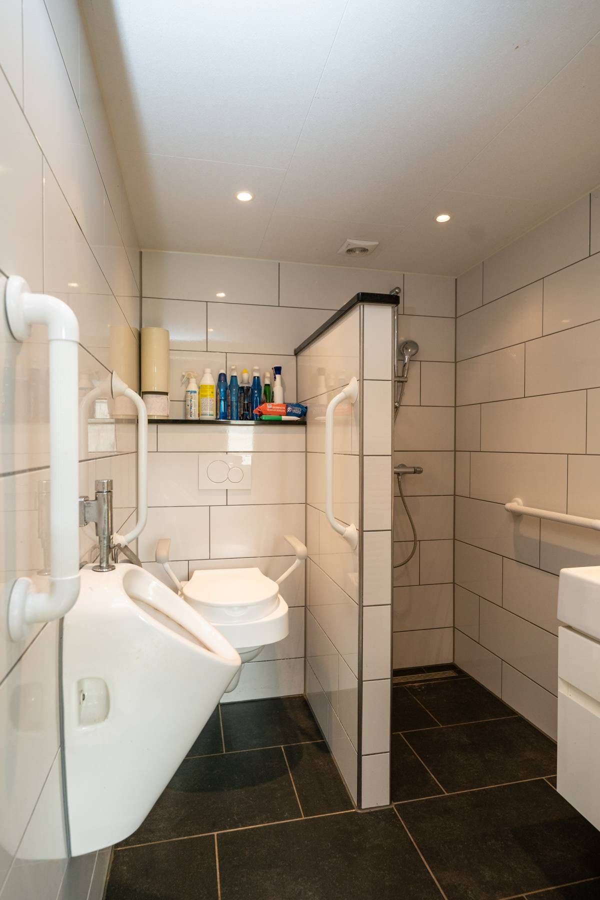 De badkamer beschikt over een inloopdouche, toilet, urinoir en wastafelmeubel.