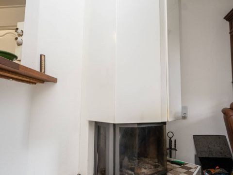 Aan de linkerzijde het eerste woongedeelte van de woning. Hier een ruime woonkamer (v.v. openhaard) en open keuken.
