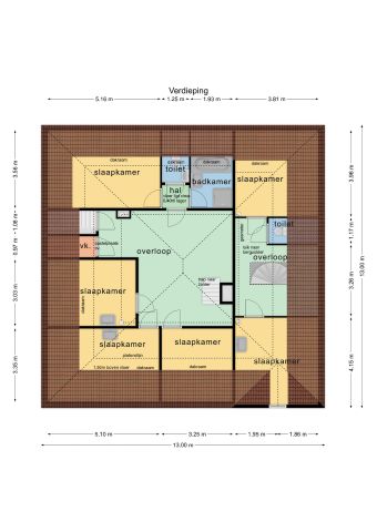 Op de verdieping een ruime overloop met 4 slaapkamers voorzien van diverse dakramen.