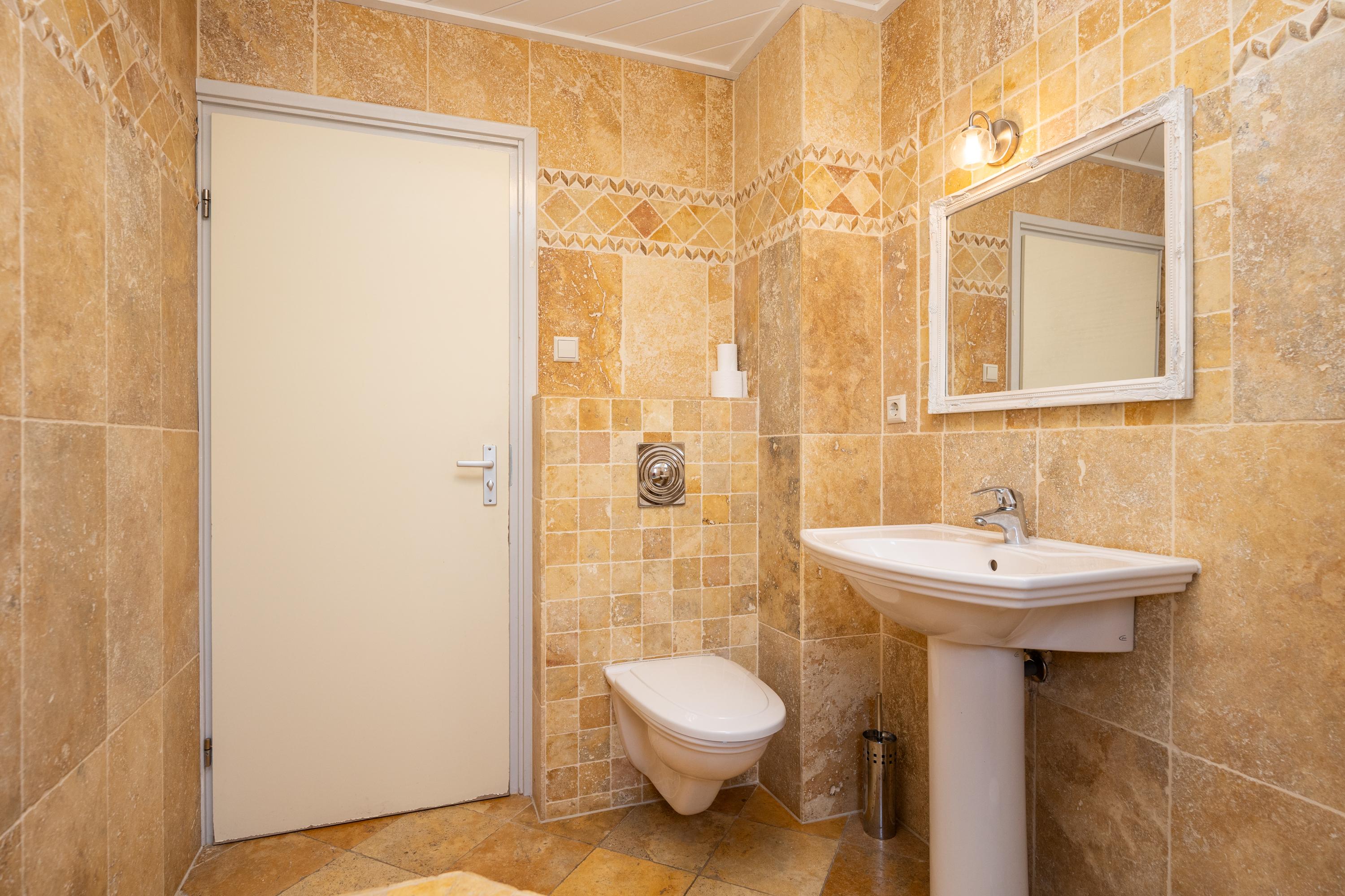 De badkamer op de begane grond is voorzien van vloerverwarming, bubbelbad met douche, een wastafel en een toilet.
