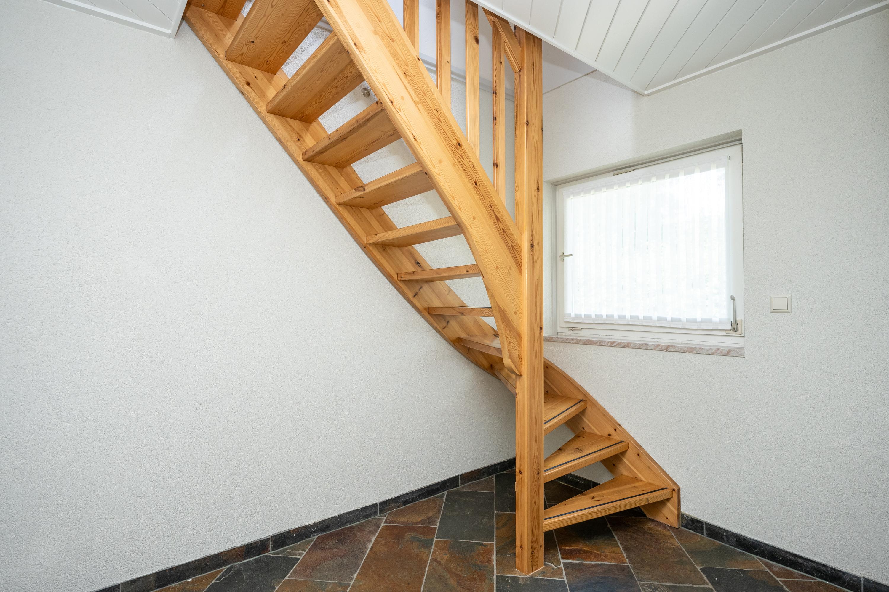 De trapopgang in de hal biedt toegang naar de verdieping met twee slaapkamers en een tweede badkamer.