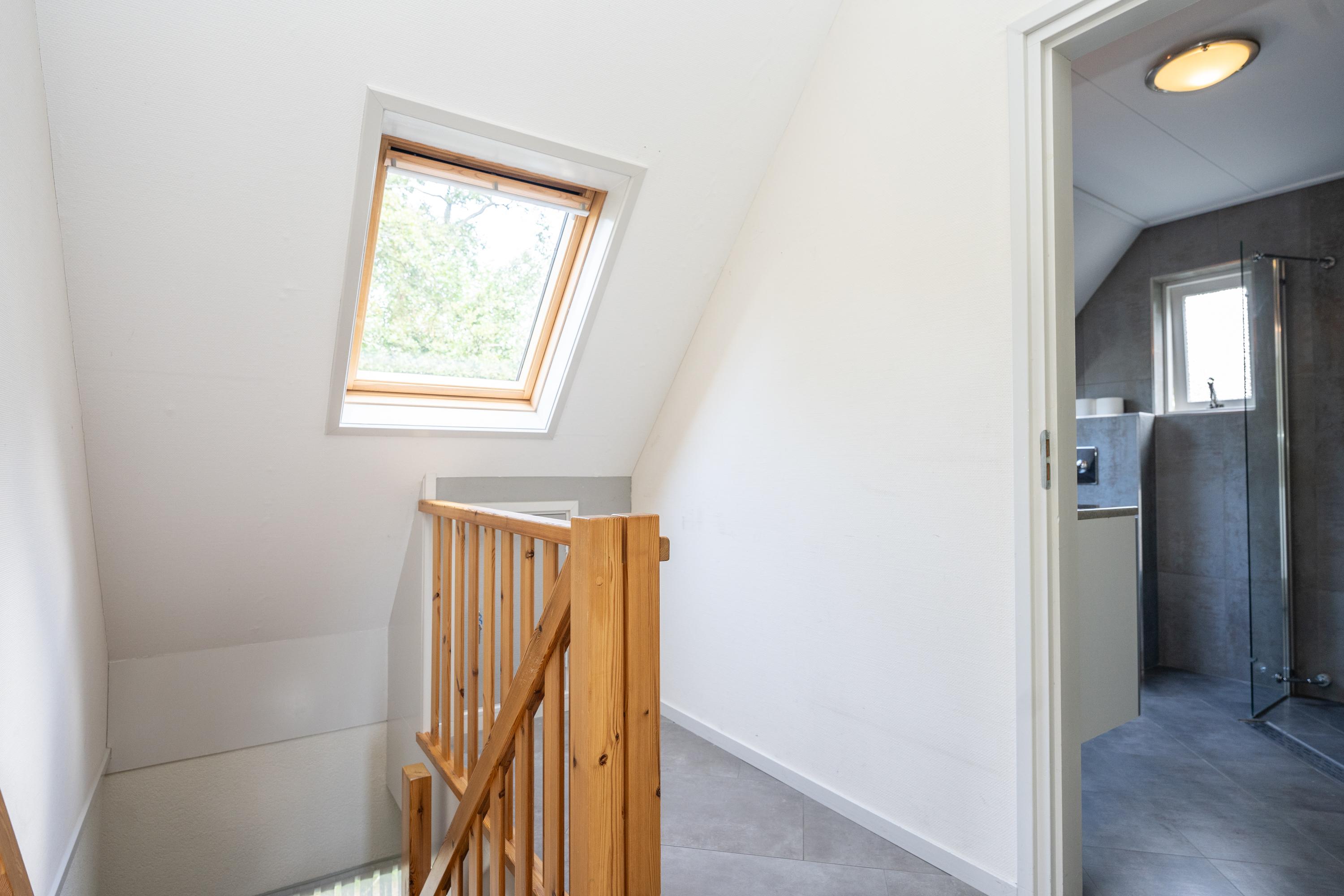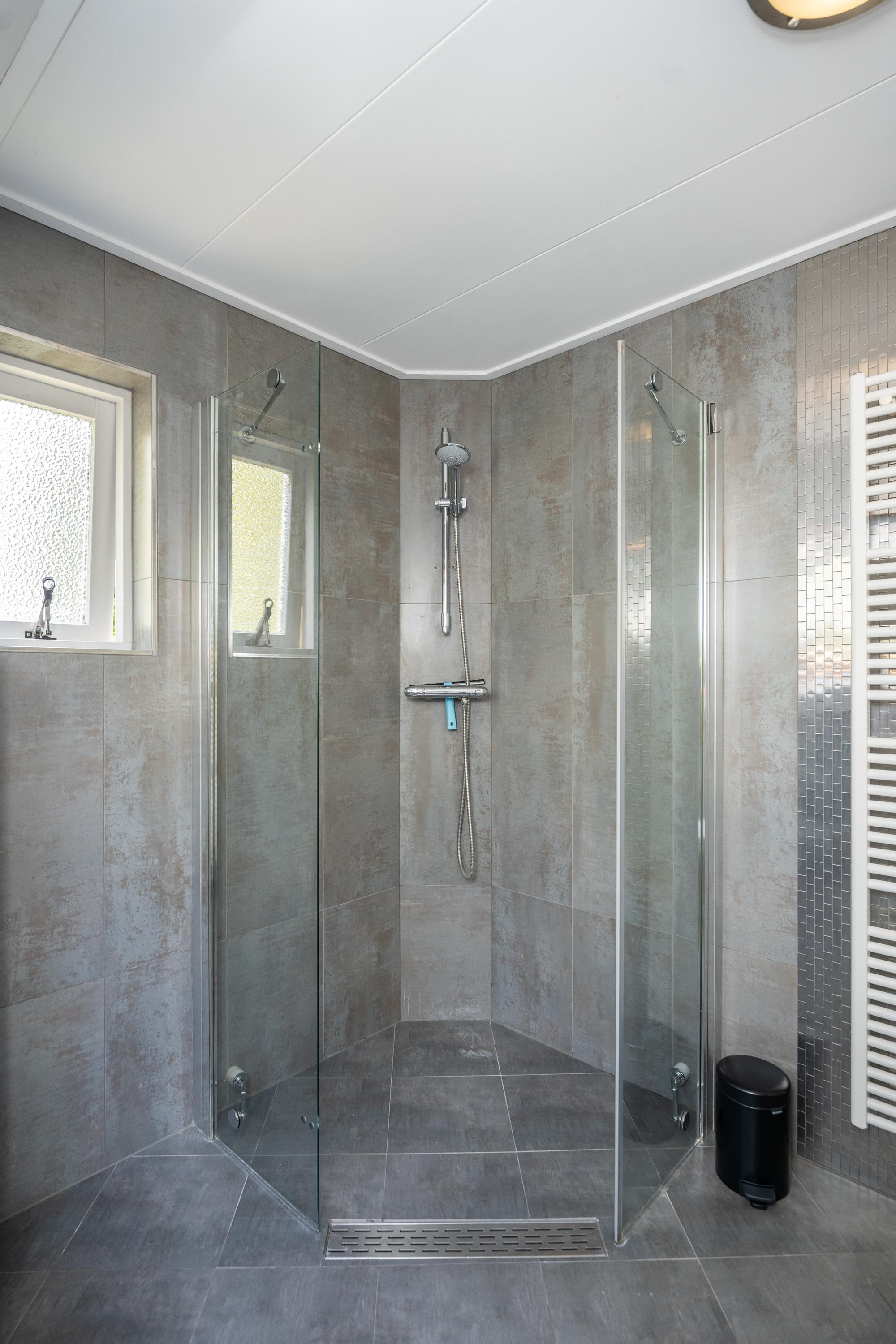 De moderne badkamer op de verdieping is uitgerust met een wastafelmeubel, designradiator, toilet en ruime douchehoek met glazen wand. Het grote dakraam zorgt voor extra ventilatie.